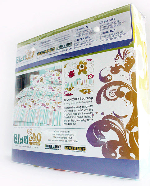 Six-piece set for Twin size (consisting of a pillowcase, a pillow sham, a fitted sheet, a flat sheet, a duvet cover & a comforter). Eight-piece set for Full, Queen and King Size (consisting of two pillowcases, two pillow shams, a fitted sheet, a flat sheet, a duvet cover & a comforter).Twin (Flat sheet : 66 x 96 inches; Fitted sheet : 39 x 75 inches; Duvet cover and Comforter : 67 x 87 inches; Pillow sham : 20 x 30 inches; Pillowcase : 20 x 30 inches); Full (Flat sheet : 81 x 96 inches; Fitted sheet : 54 x 75 inches ; Duvet cover and Comforter : 76 x 87 inches; Pillow sham : 20 x 30 inches; Pillowcase : 20 x 30 inches); Queen (Flat sheet : 92 x 102 inches; Fitted sheet : 60 x 80 inches; Duvet cover and Comforter : 87 x 90 inches; Pillow sham : 20 x 30 inches; Pillowcase : 20 x 30 inches); King (Flat sheet : 108 x 106 inches; Fitted sheet : 78 x 80 inches; Duvet cover and Comforter : 104 x 92 inches; Pillow sham : 20 x 32 inches; Pillowcase : 20 x 32 inches); Duvet covers are economical option to change the look and feel of your bed room without having to completely redecorate. Using duvet covers means not to invest a lot of money to do some changing in bedrooms. The concealed elastic band in the fitted sheet will firmly wrap the overall corners of the mattress, thus avoiding displacement. The design of extending the pocket size of the fitted sheet to 14 inches will fit with the most of mattresses. With a zipper on one end and twill ties at each inside corner of the duvet cover for you to tie to corresponding embroidered eyelet loop at corner of the comforter, so the comforter can be more securely tied to a duvet cover to keep it from shifting inside its cover while you sleep. Complete any bedroom decor with this stylish duvet cover set from Blancho Bedding. Includes 1 pillowcase, 1 pillow sham, 1 fitted sheet, 1 flat sheet, 1 duvet cover & 1 comforter.Twin size comforter measures 67 by 87 inches with 40 oz hypo-allergenic breathable filling.This combo combines a duvet cover set, a sheet set and a luxury down-alternative comforter.Shrinkproof, anti-pilling and fading proof processes; 14 inches pocket size of the fitted sheet.Environment-friendly dyes; Fine and concentrated stitches; Machine washable and dryable.