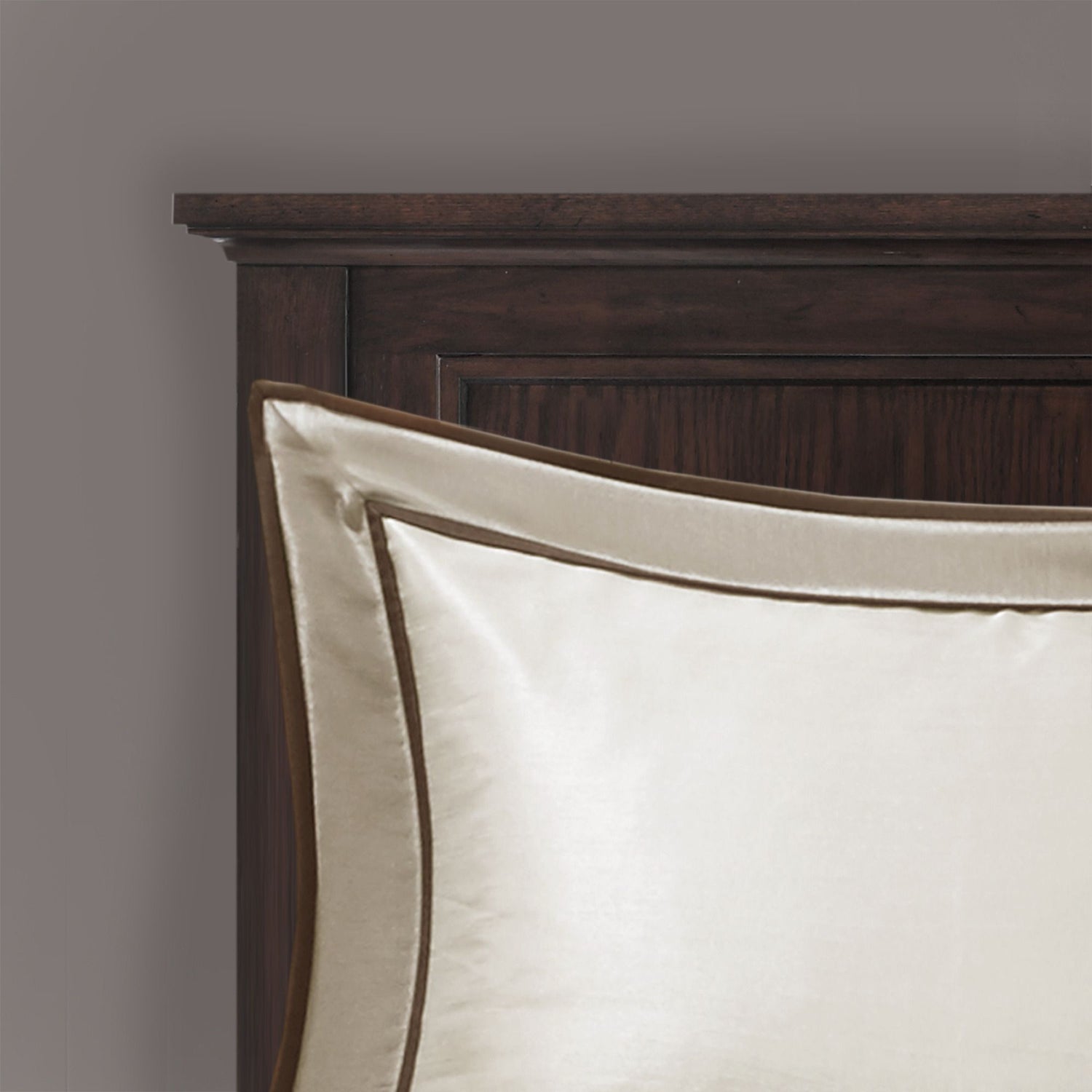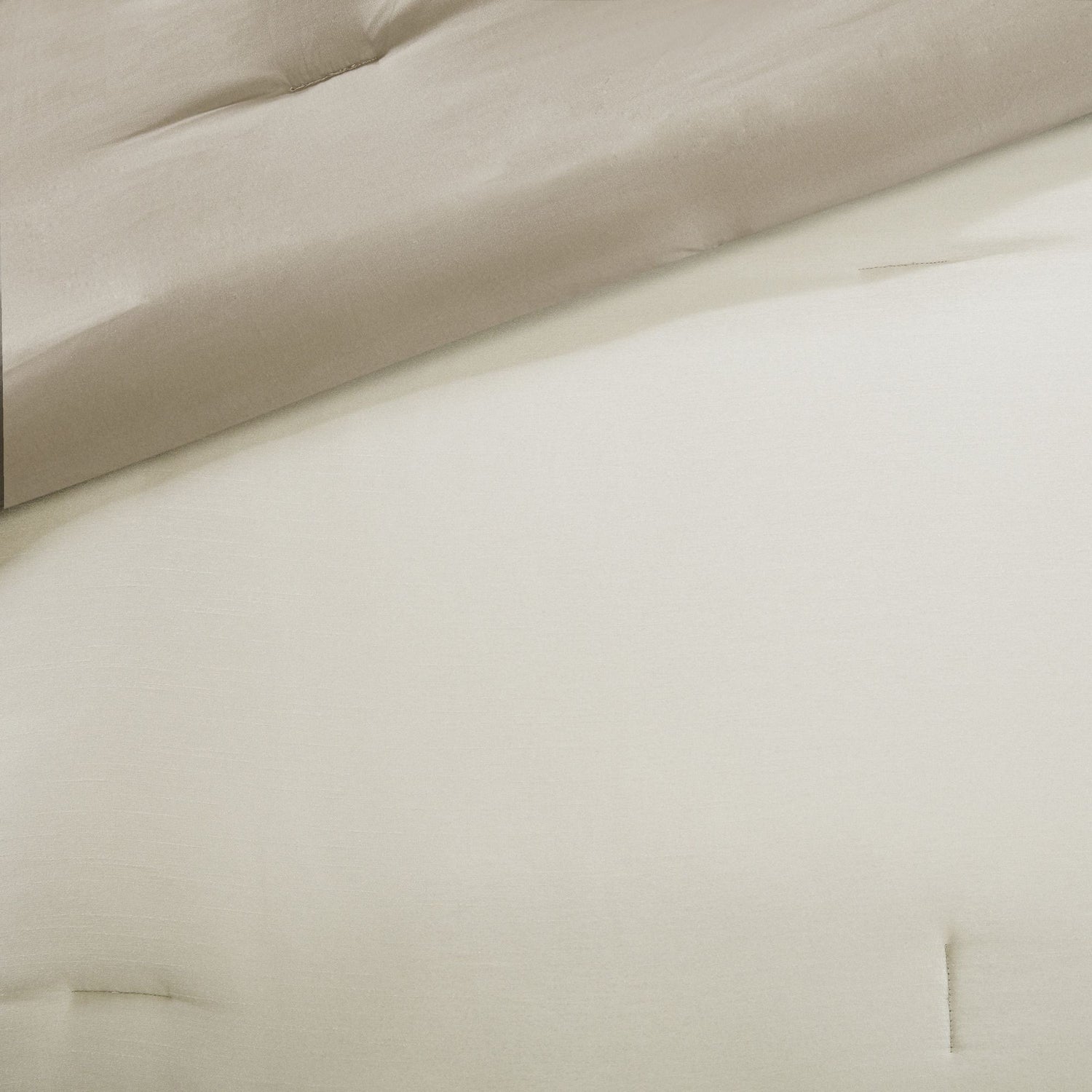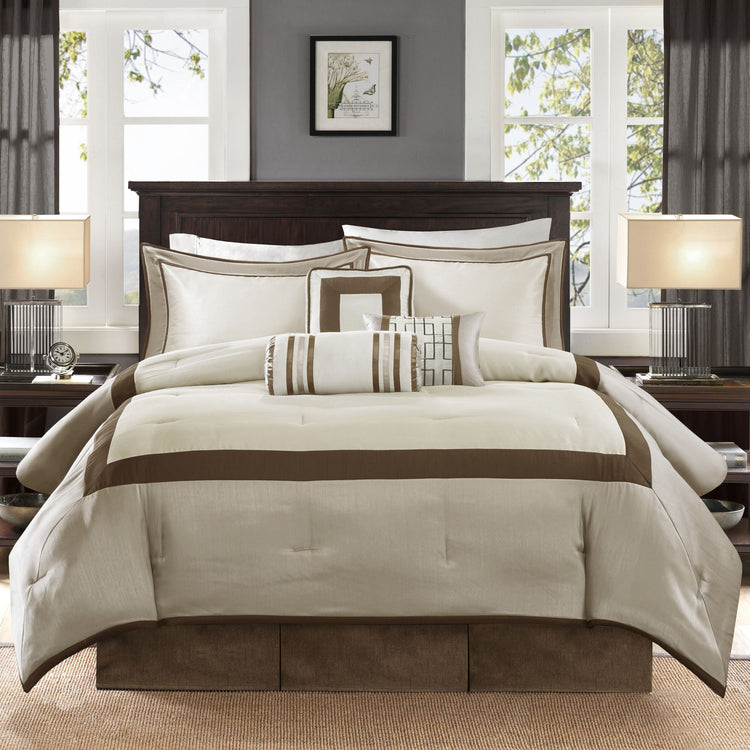 The Genevieve bedding collection creates a neutral feel to your space. This set is made from 100% polyester polyoni creating a sheen to the taupe, brown, and light taupe colorways in this bed. The taupe color creates a large border around the edge of the comforter and a brown border is used inside to really give the light taupe a pop in the center. The decorative pillows make use of these same borders and colors for a completely matching set while the brown bedskirt adds some drama with its dark coloring. With these neutral colorways and large borders, this set will be easy to accessorize in any room in your home. Items in the set may come in a rolled or compressed packaging, which will need to be fluffed up or steam ironed before use to remove wrinkles.