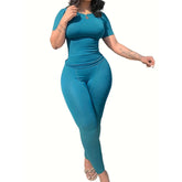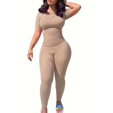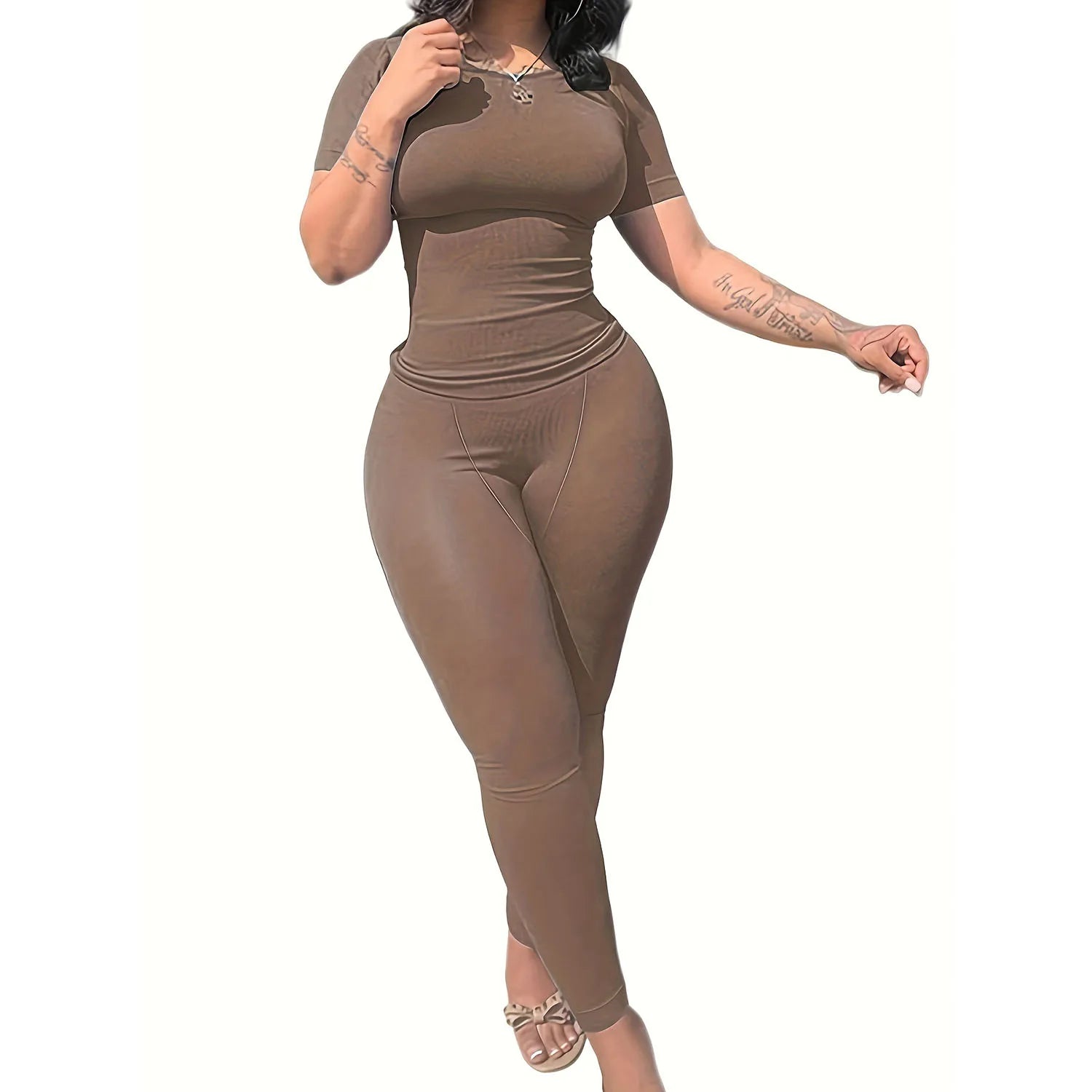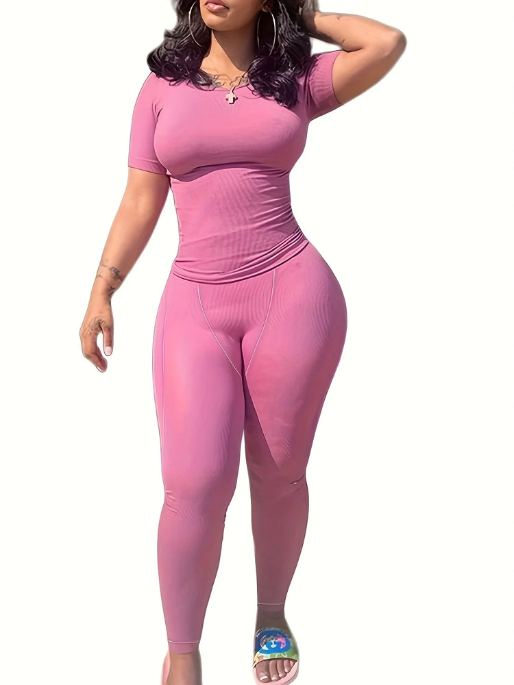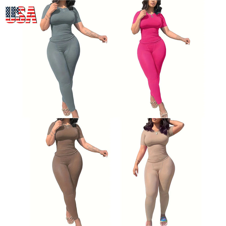 US STOCK | Casual Workout Sets Short Sleeve Two Piece Outfits For Women Ribbed Fitted Crew Neck T-shirt Matching Sets Streetwear