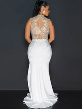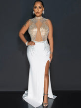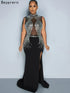 Beyprern Women's Black Mesh Bust Rhinestones Décor High Slit Maxi Dress Glam Mock Neck Crystal Party Dresses Celebrities Outfits