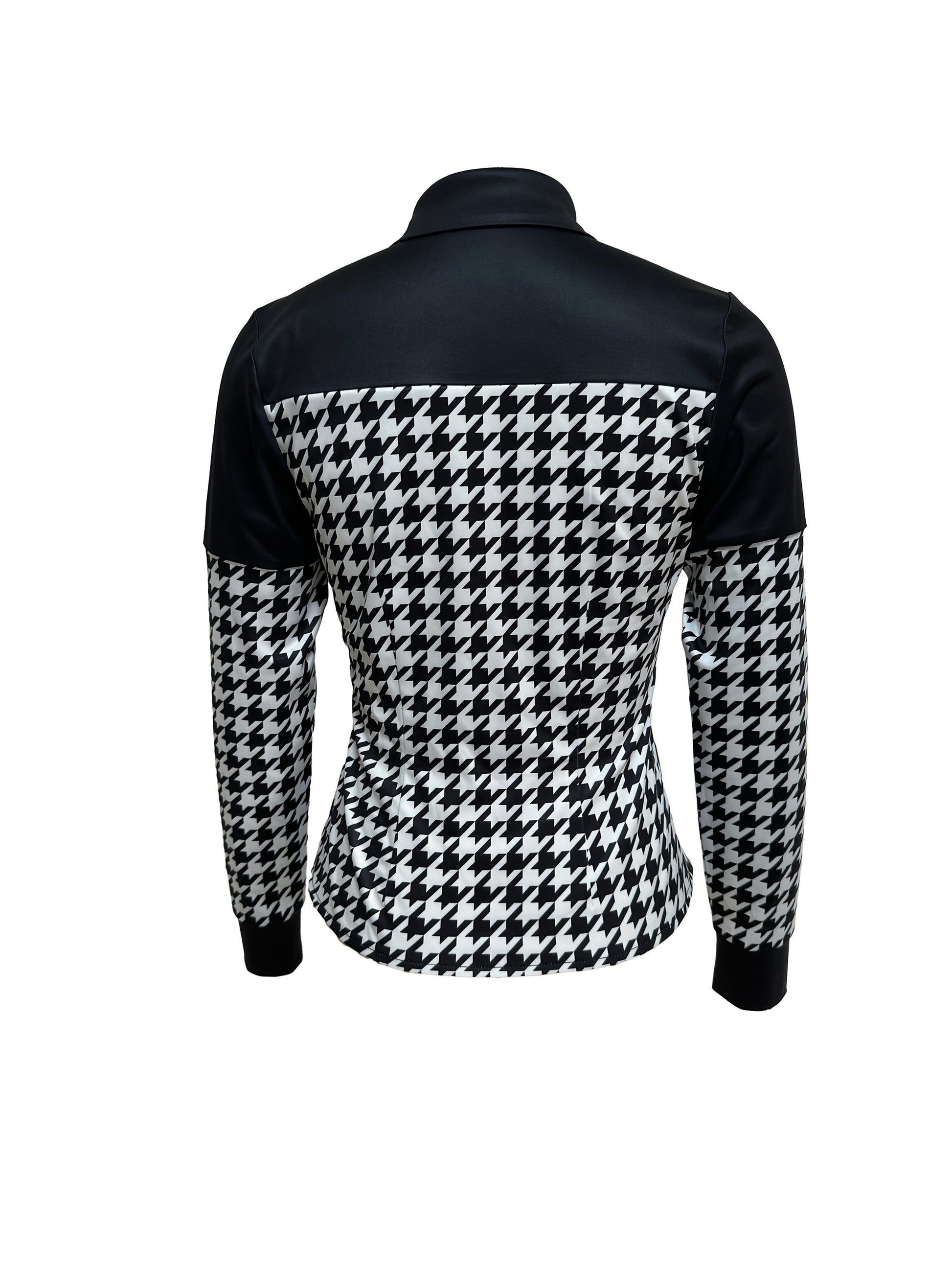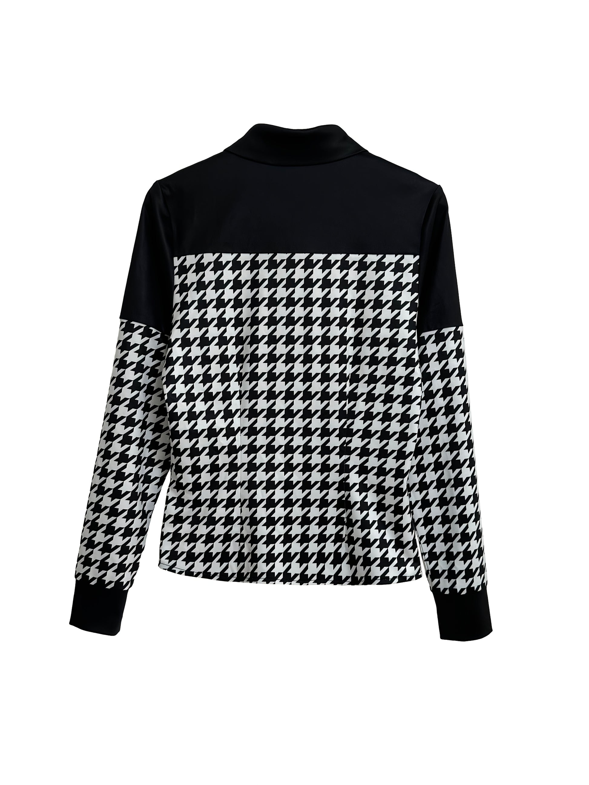 [Chic Houndstooth Blouse] Chic Women's Houndstooth Blouse | Black Shoulder Pads, Casual Button-Up Shirt, Long Sleeve, Black & White Checkered Pattern, Perfect for Spring/Fall