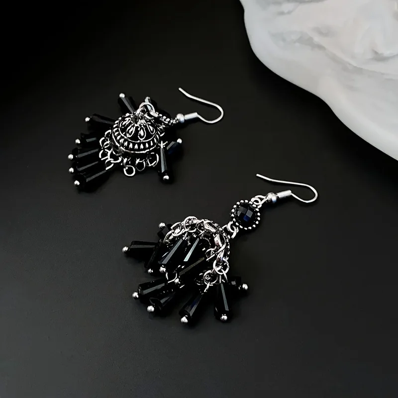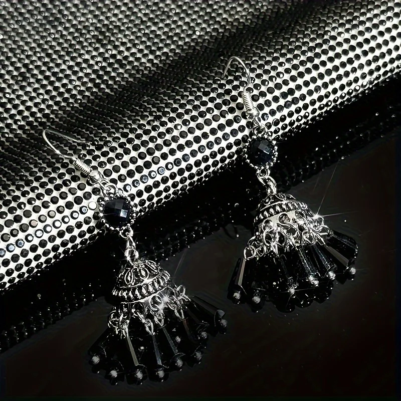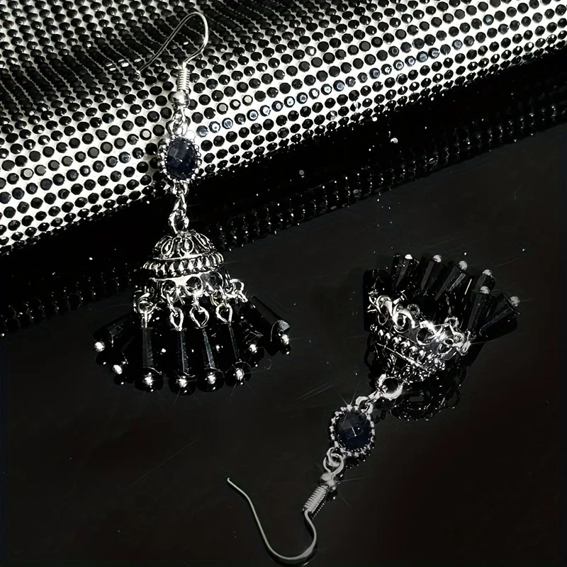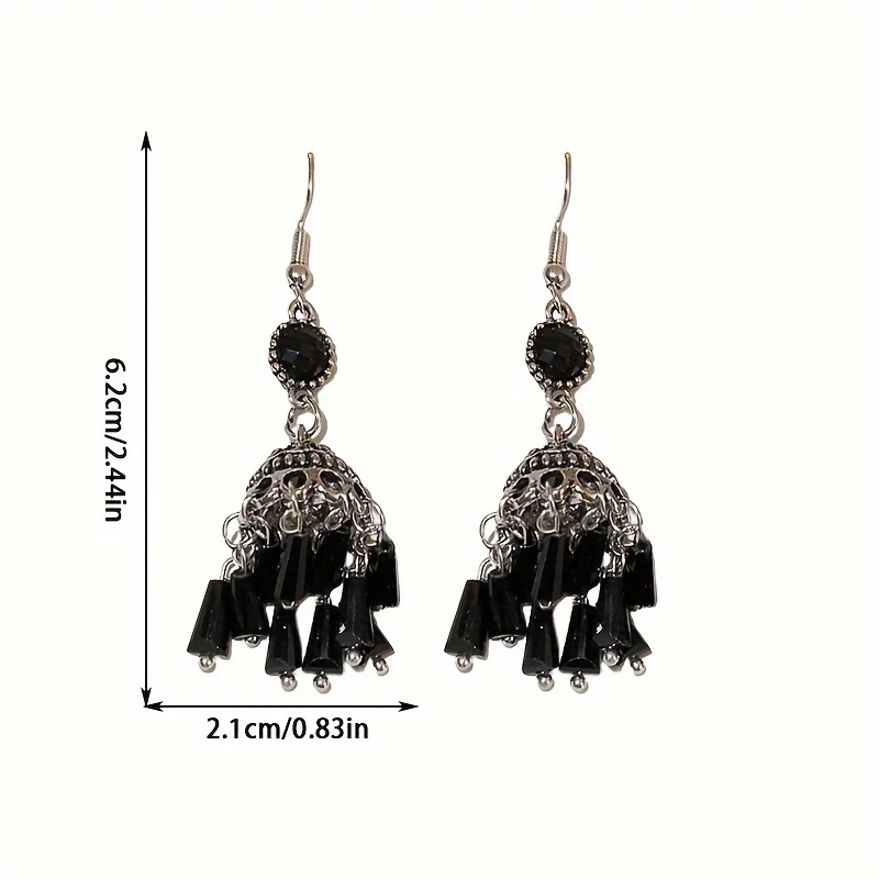Chic Tassel Lantern Earrings - Exquisite Black Chandelier Drops, Dangling Ethnic Style Hooks, Hypoallergenic for Sensitive Skin