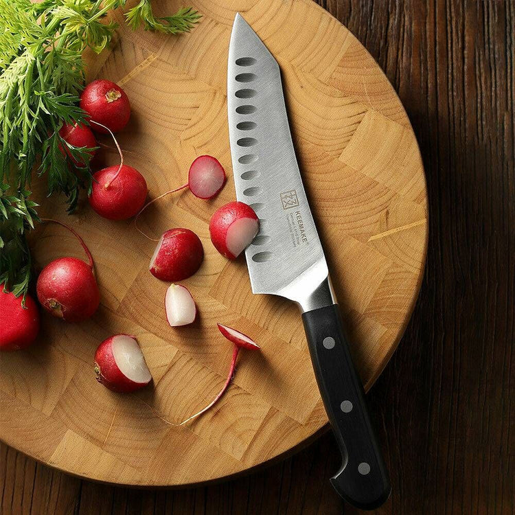 3.Sharpness is key of all the chef knife. Keemake chefs knife is forged by masters with decades of experience achieving a blade of 13° and a Rockwell hardness of 58±2. A serrated edge is added to the heavy duty scissors to further increase friction and sharpness.