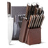 1.Includes with chef's knife, carving knife, bread knife, santoku knife, utility knife, 6 pieces steak knife set, paring knife, peeling knife, sharpener and kitchen scissors
