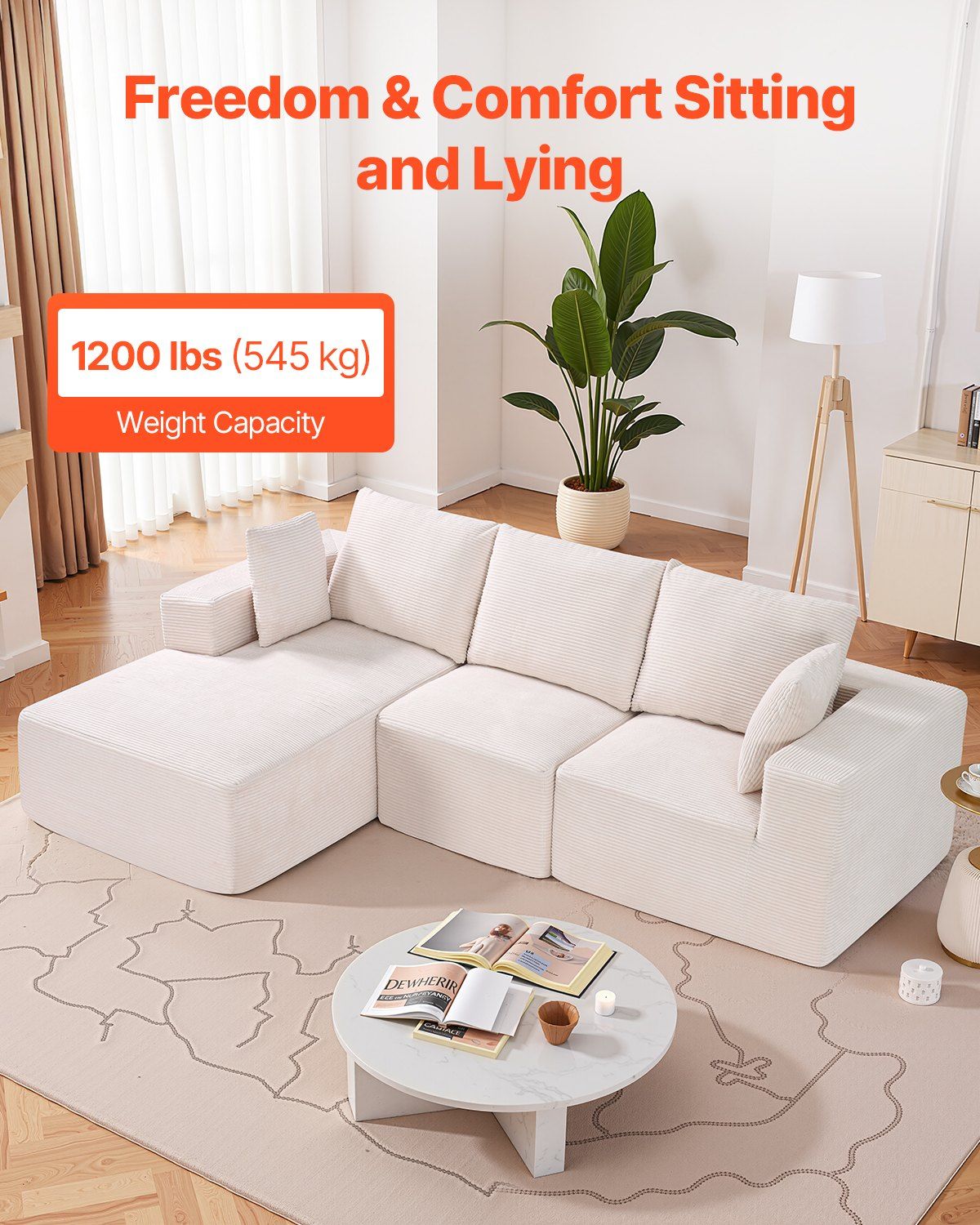 VEVOR Modular Sectional Sofa, L Shaped Modular Sofa with Chaise, Cloud Sectional Couch with High Rebound Sponge and Density, Upholstered Corduroy Couch with Cushion for Living Room, Apartment, Beige