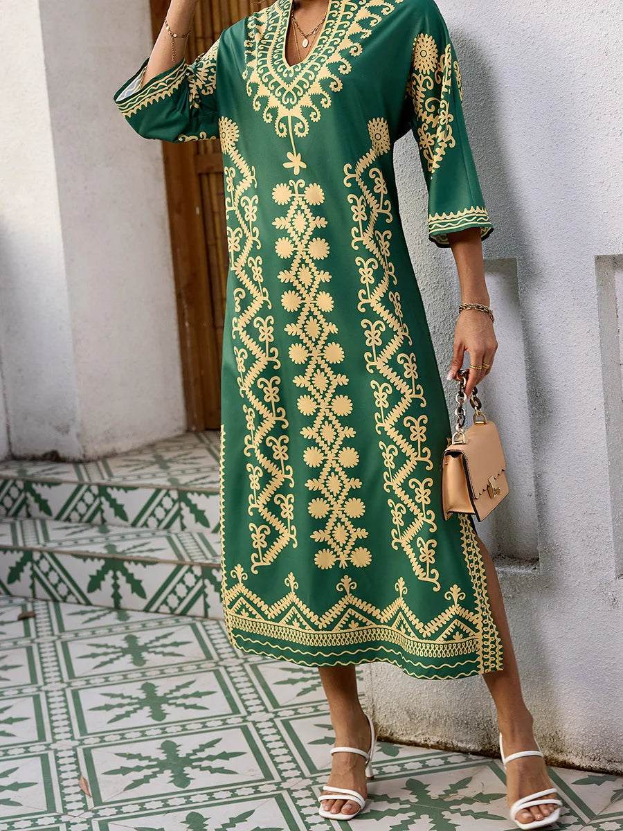 Elegant 3 4 Sleeve V-Neck Maxi Dress with Retro Print Perfect for Ramadan Arab Robe Caftan Gowns for Women