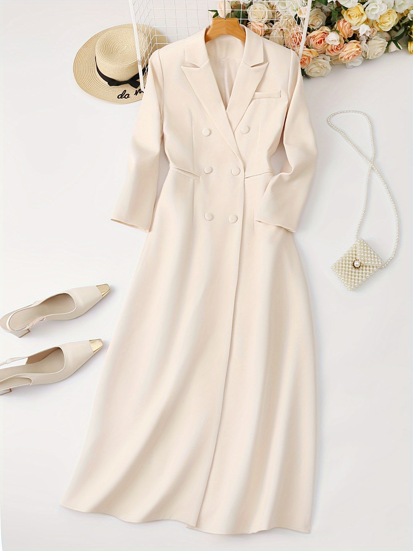 [Elegant Blazer] Elegant Long Double-Breasted Blazer | Women's Solid Color Notch Lapel Regular Fit Urban Style Jacket with Button Front, Long Sleeve for Spring/Fall Office & Casual Wear, Spring Outerwear, Sophisticated Tailor