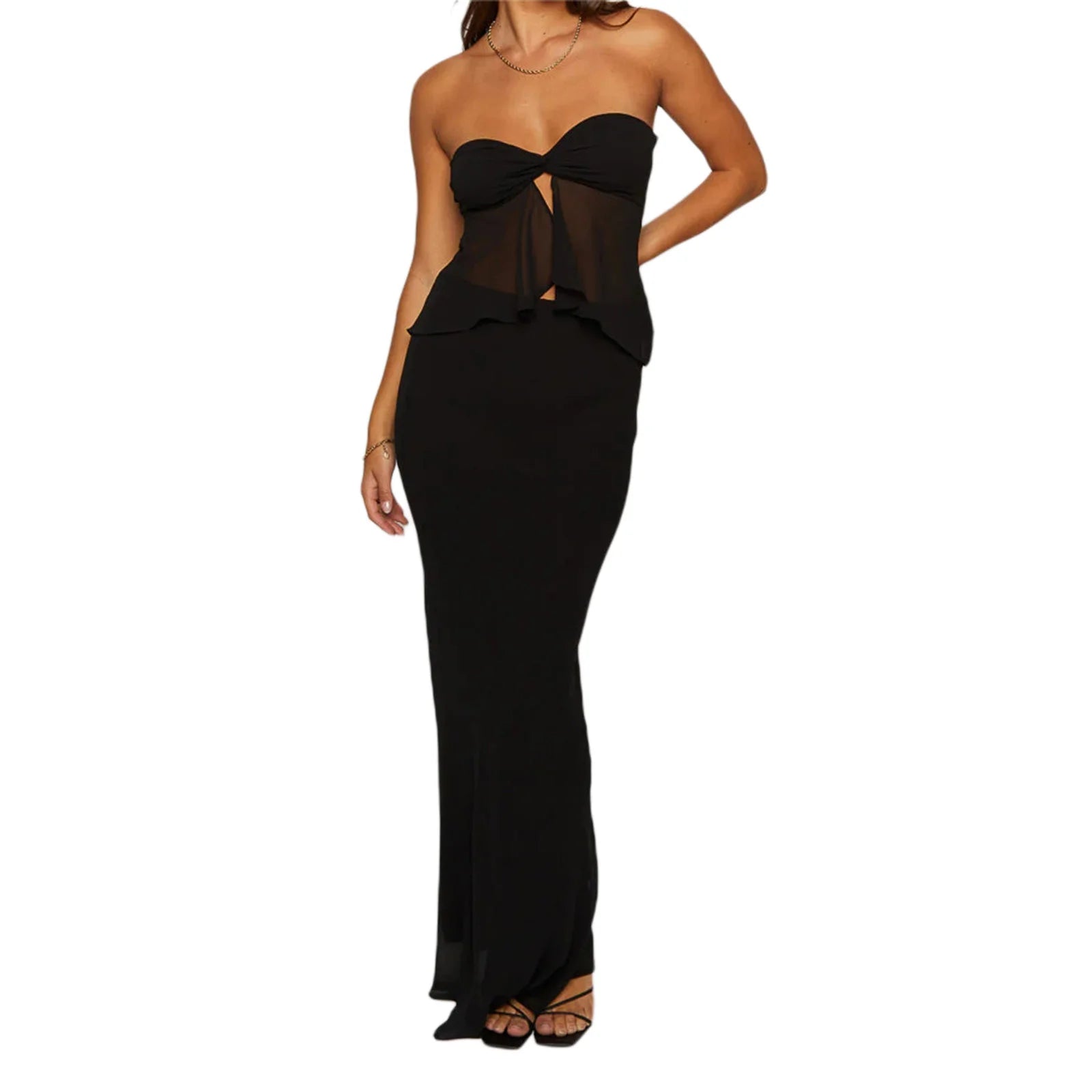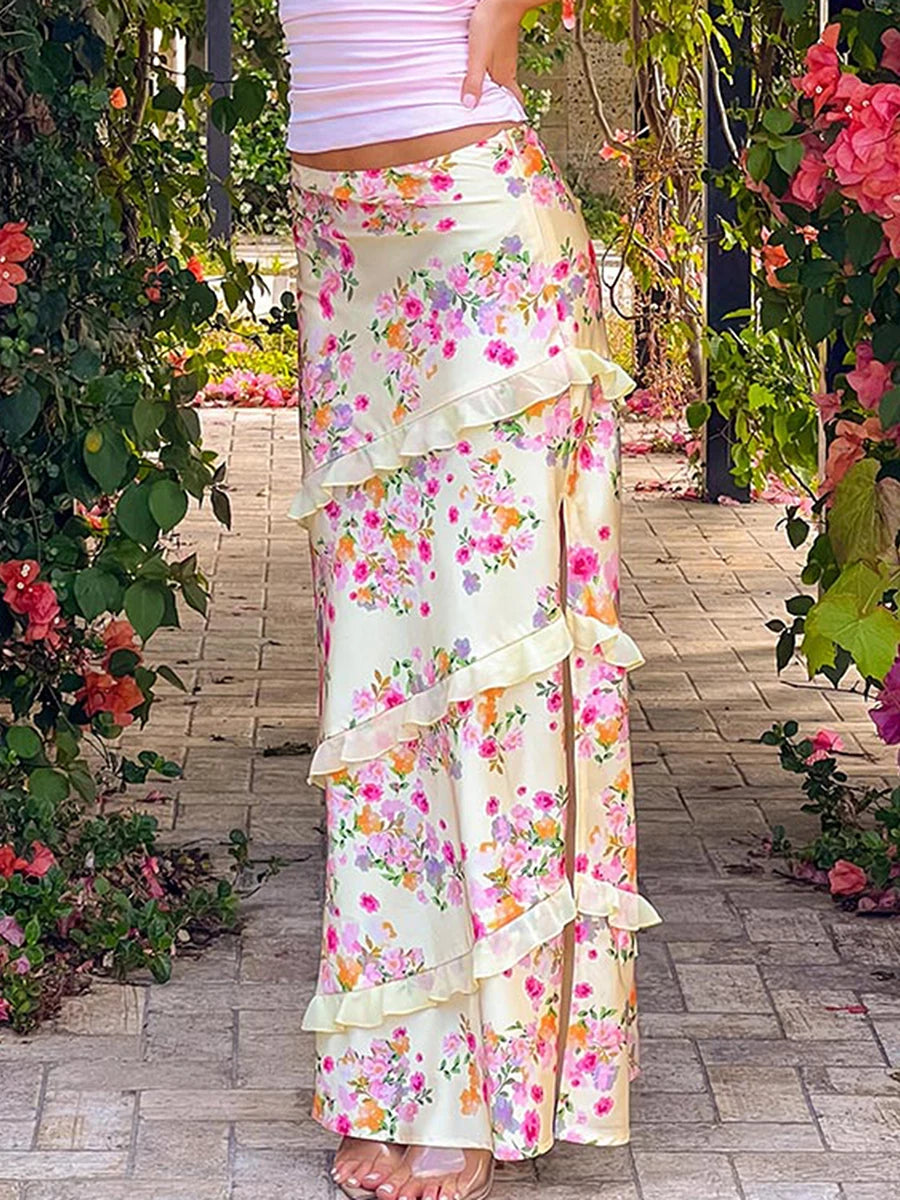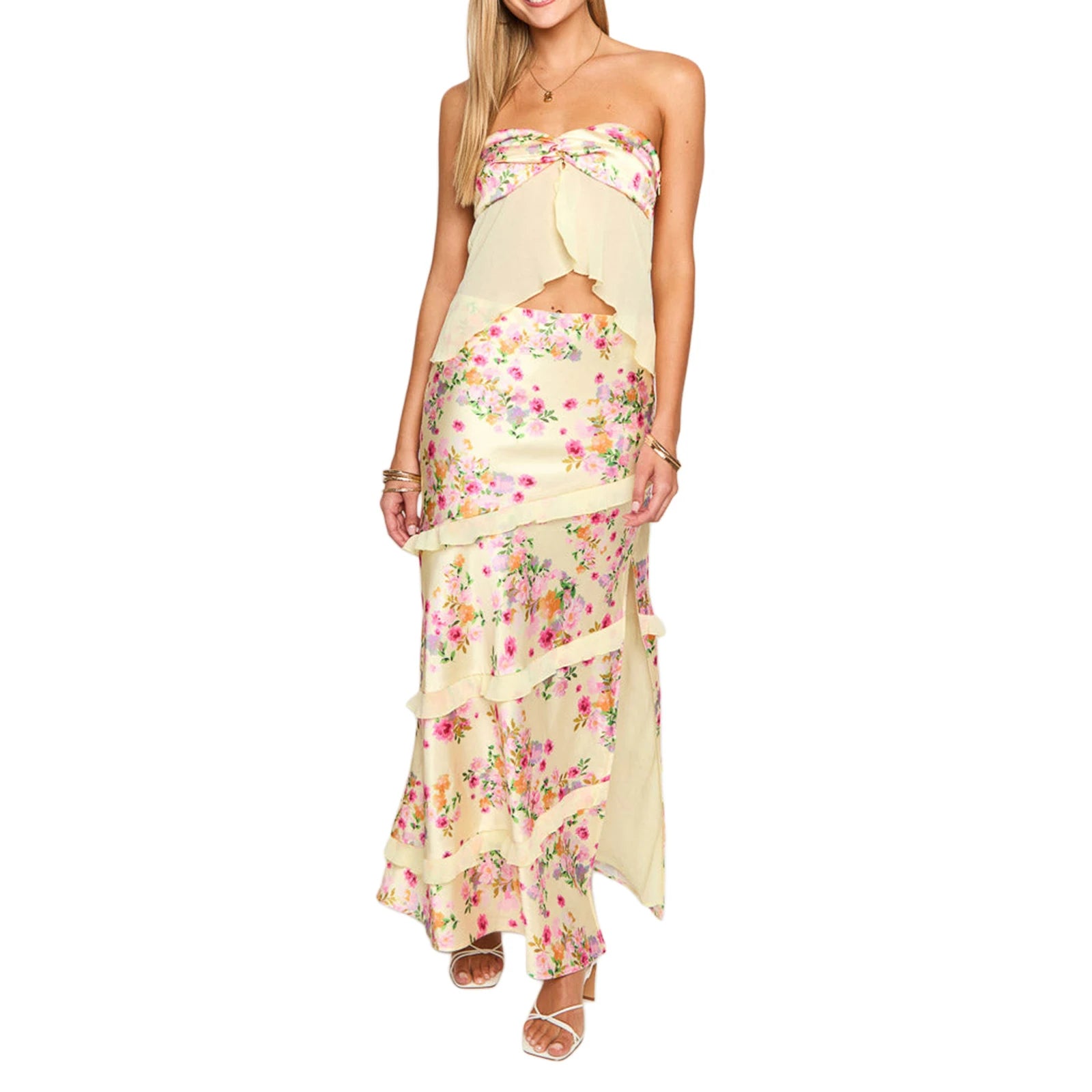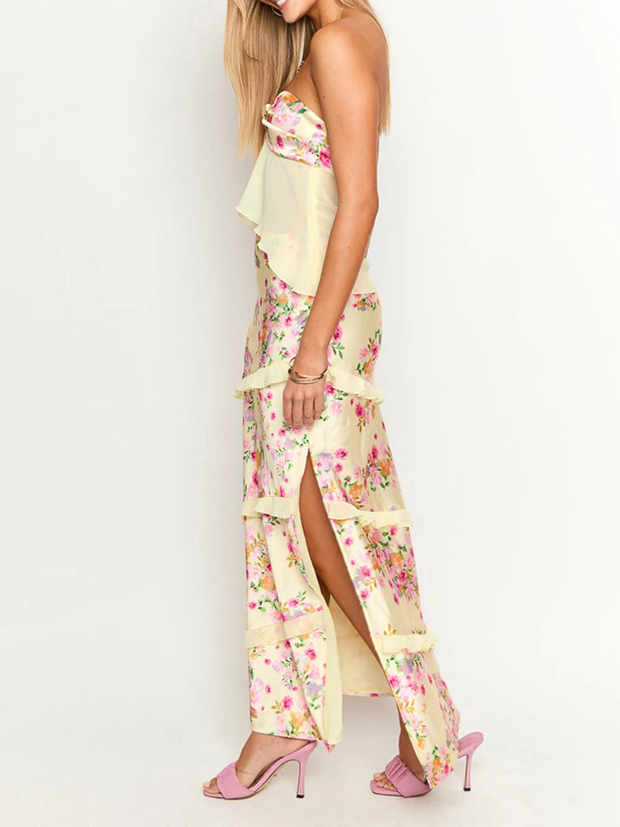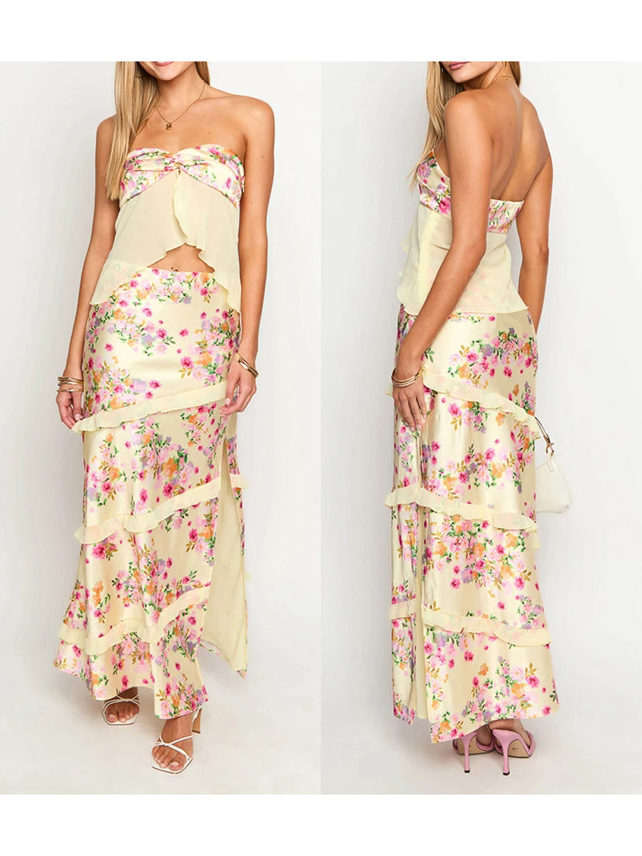 Women Floral Outfit Off Shoulder Split Front Tube Tops High Rise Long Skirt 2 Pcs Set for Party Club