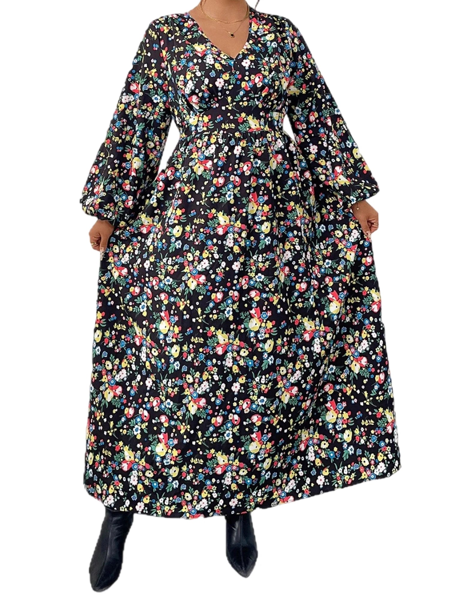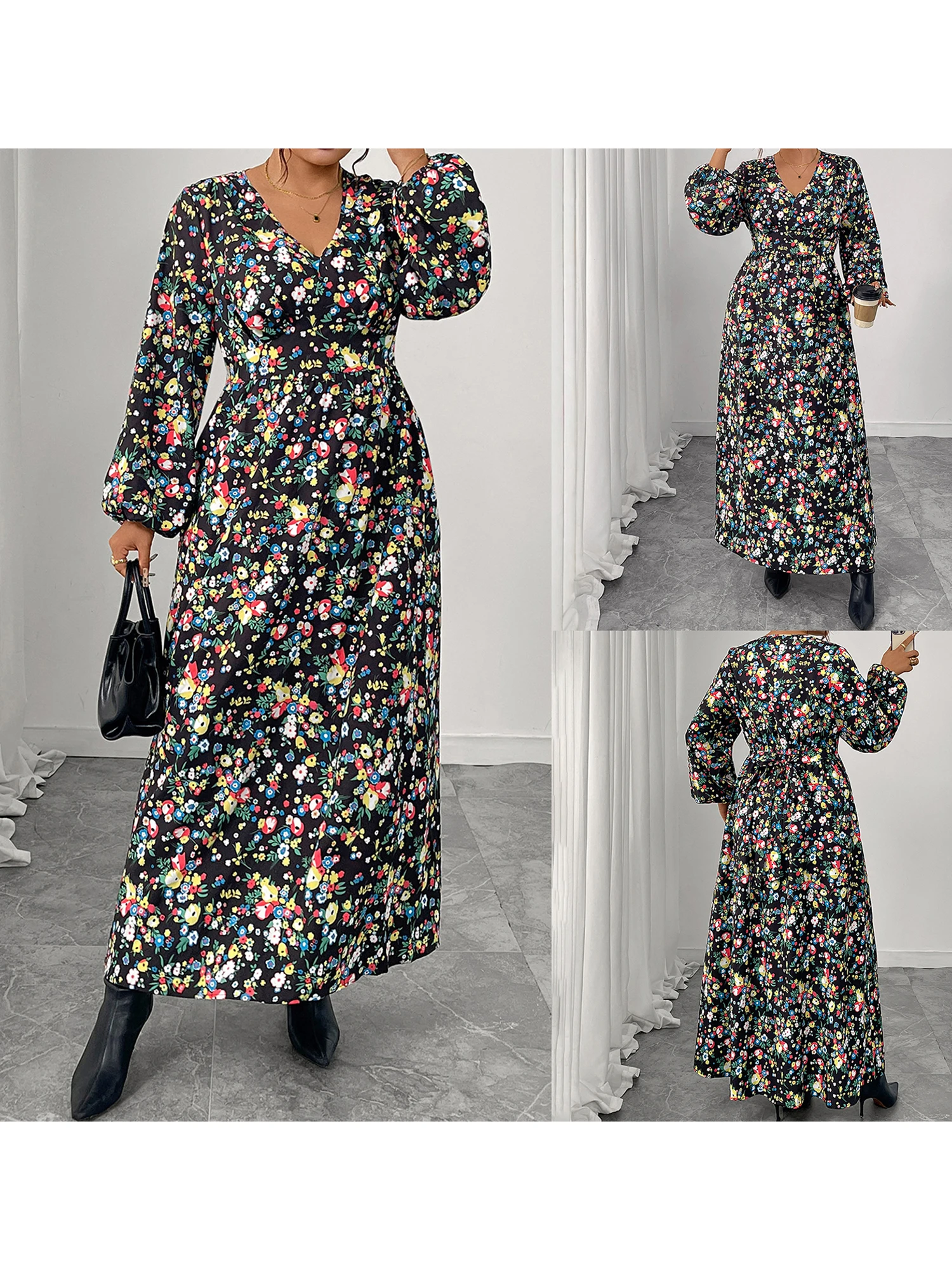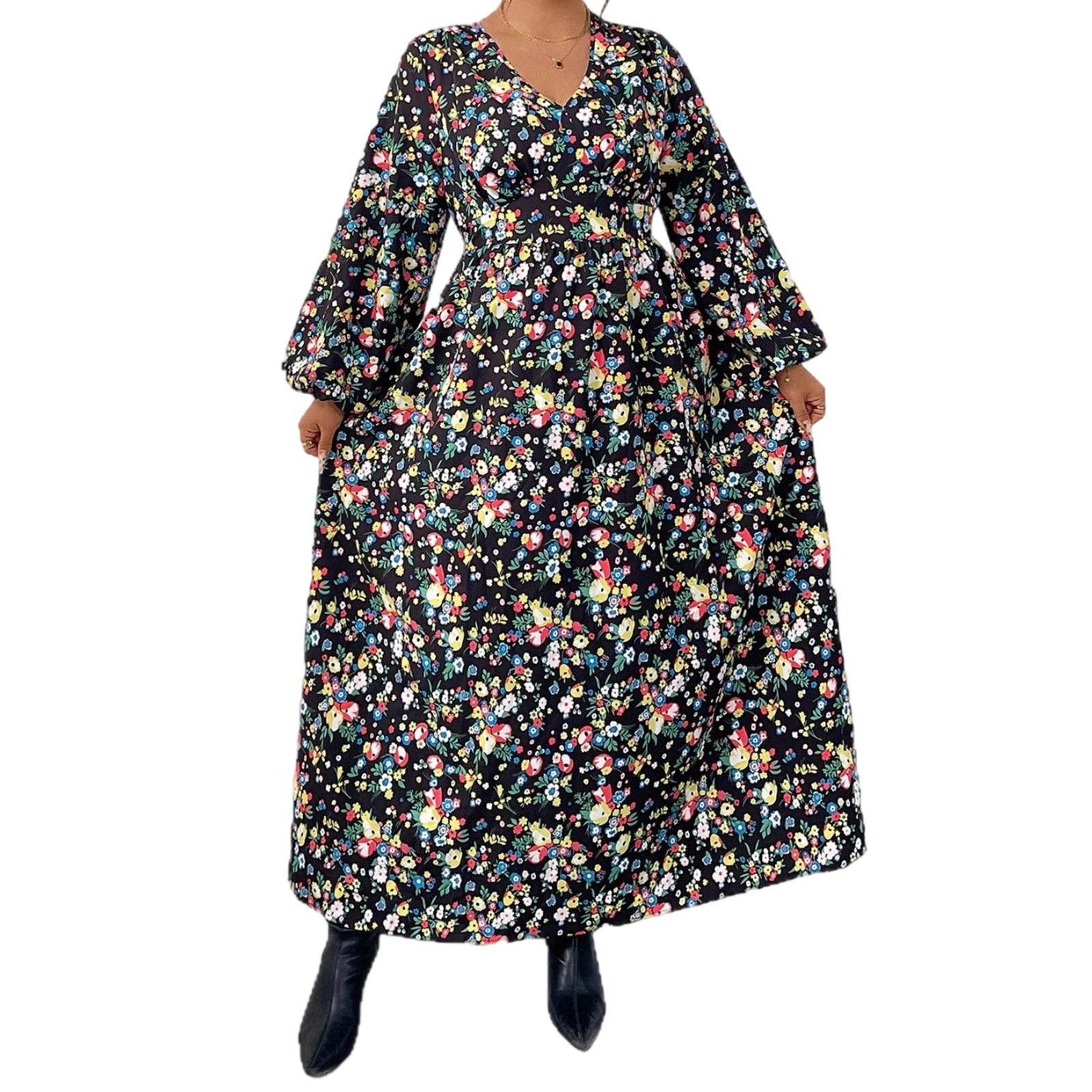 Women Long Dress, Long Sleeve Dress V-neck Floral Loose Casual Dress for Daily Party