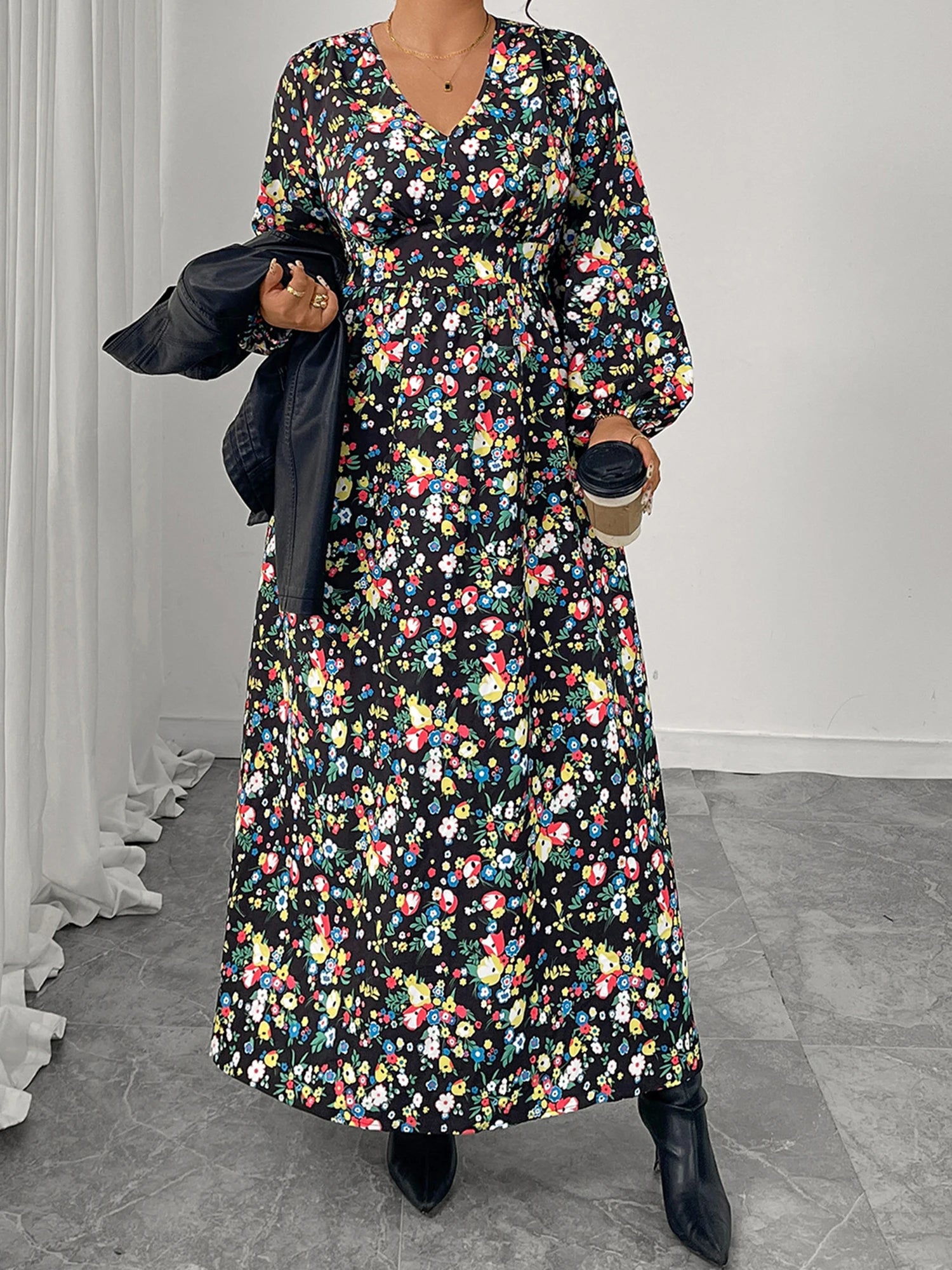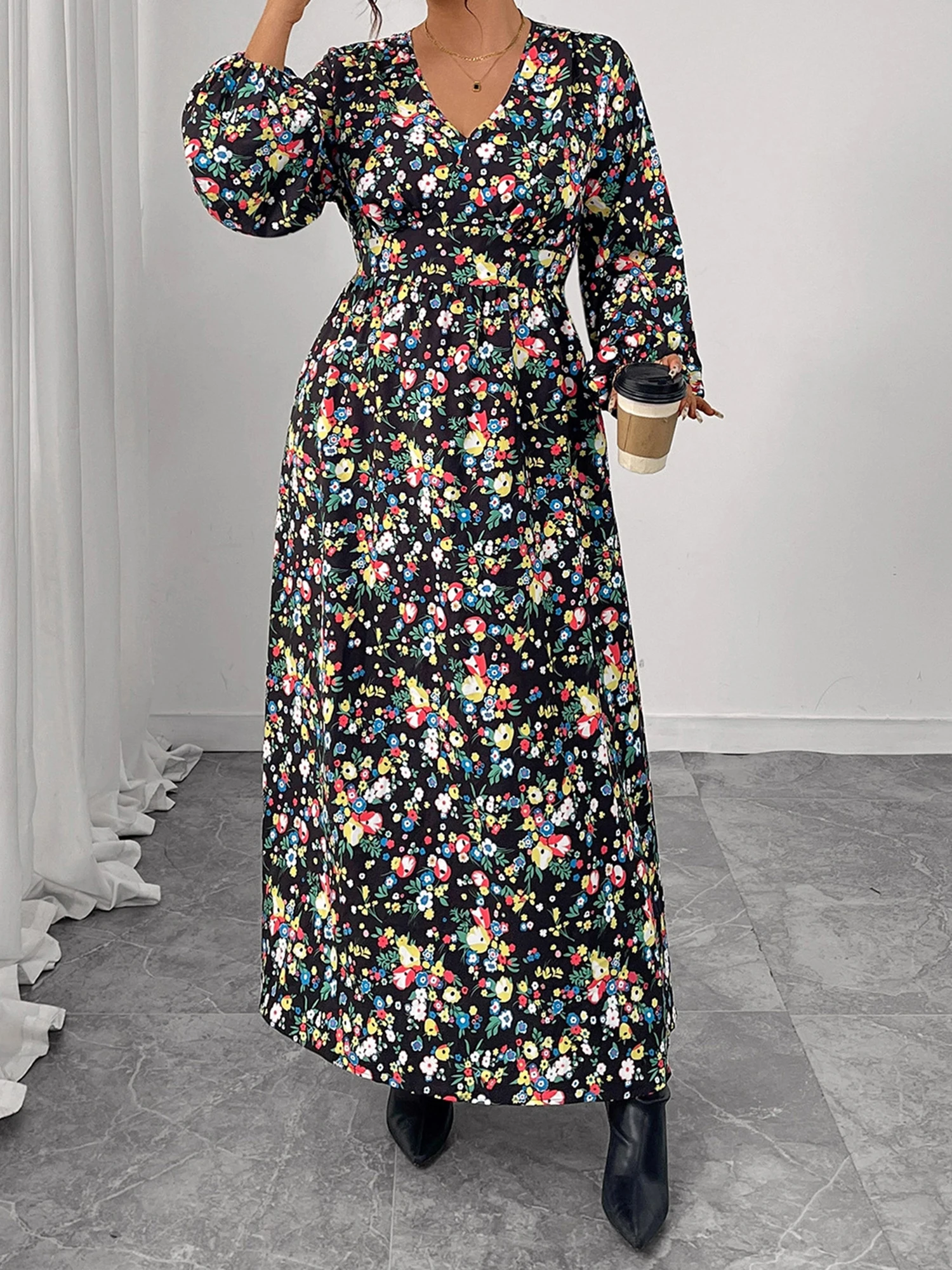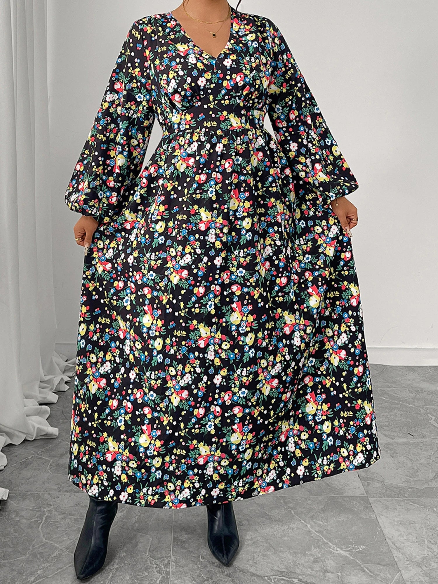 Women Long Dress, Long Sleeve Dress V-neck Floral Loose Casual Dress for Daily Party
