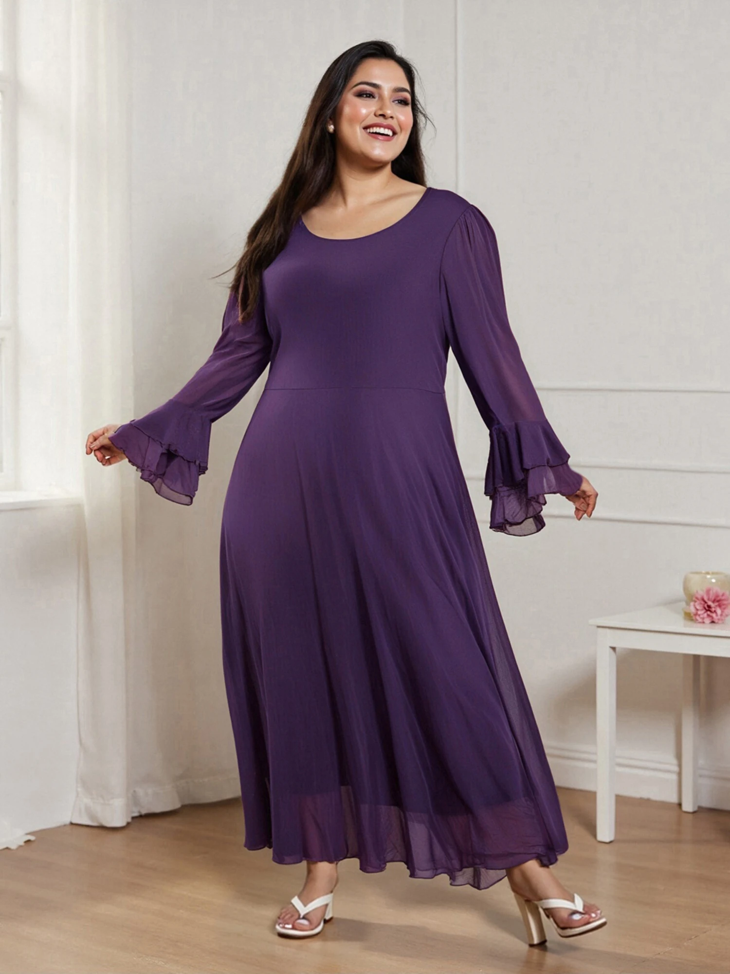 Women Long Dress, Long Sleeve Crew Neck Pleated Solid Loose Fall Dress for Daily Party