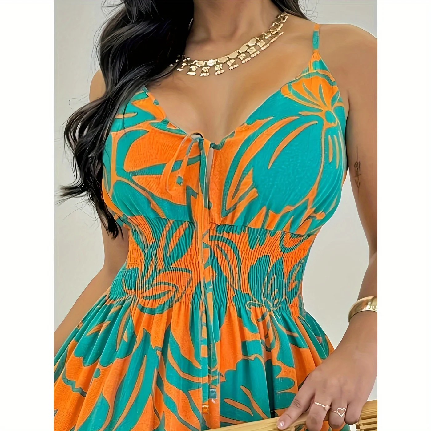 Elegant Printed Patchwork Open Back Folded Spaghetti Strap Suspender Dress