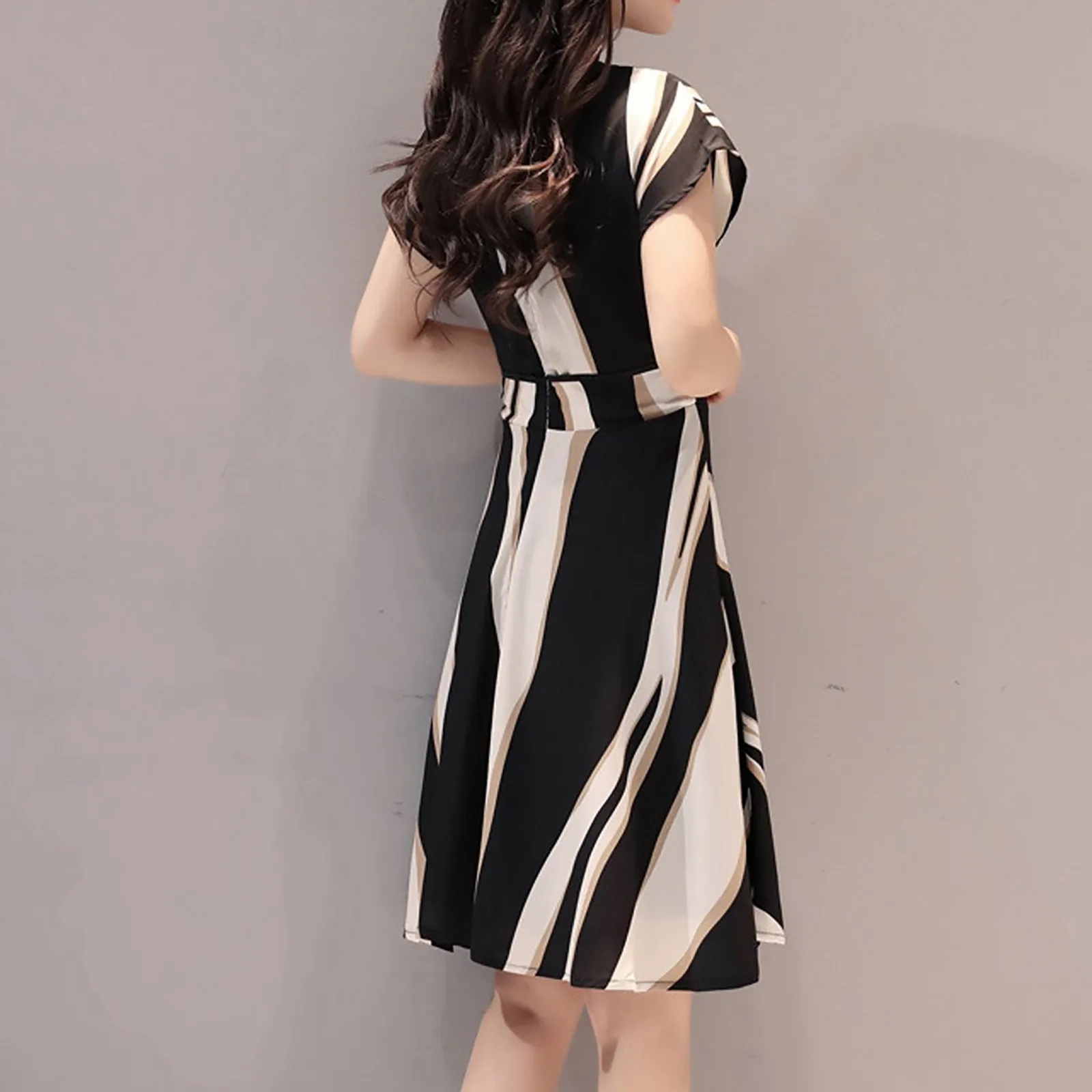 Fashion Women Business Dress Belt O-Neck Short Sleeve Knee Length Dress