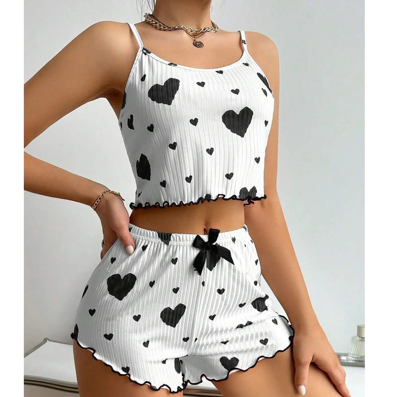Heart Print Women's Pajamas Set Sleepwear 2 PCS Short Tank Tops and Shorts Sets Ventilate Soft Casual Love Sleeveless Home Suit