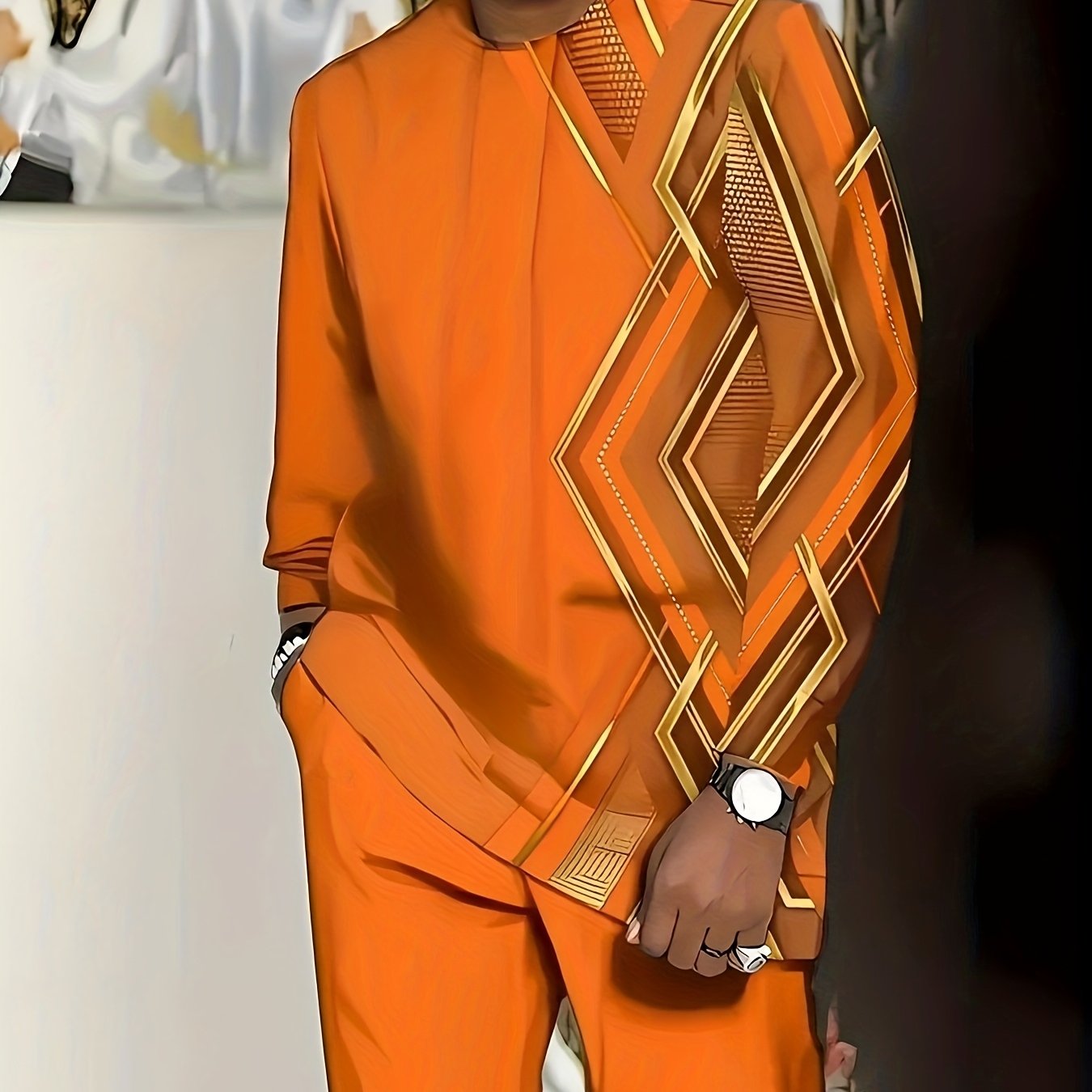Large Men's Casual Sportswear Set -100% Polyester Fiber Knitted Fabric, Slightly Elastic, Round Neck Long Sleeved Top And Pants, Regular Silhouette, Geometric Pattern Details, PLUS SIZE