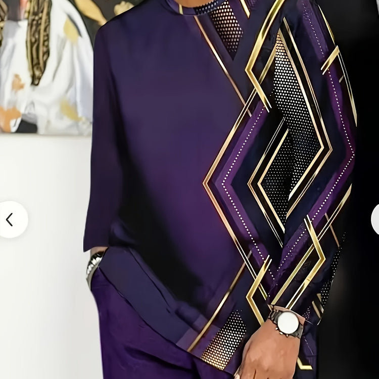 Large Men's Casual Sportswear Set -100% Polyester Fiber Knitted Fabric, Slightly Elastic, Round Neck Long Sleeved Top And Pants, Regular Silhouette, Geometric Pattern Details, PLUS SIZE