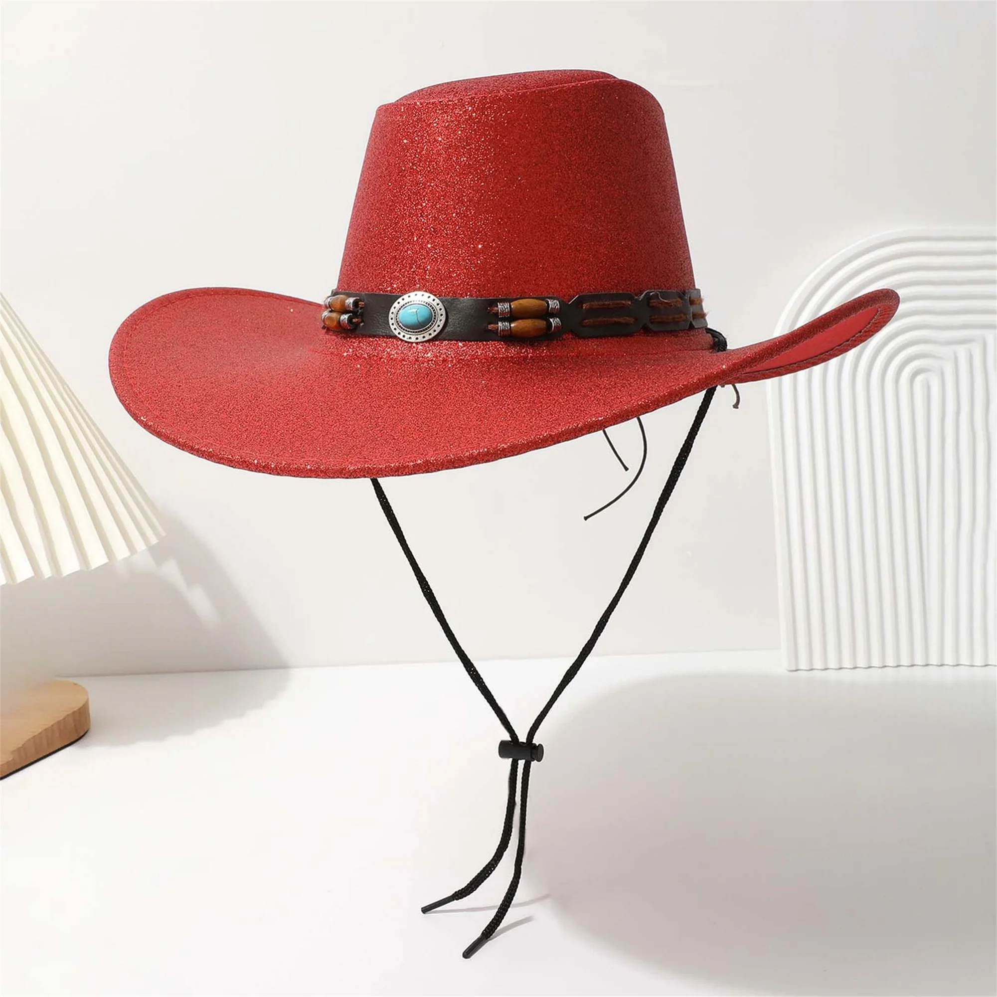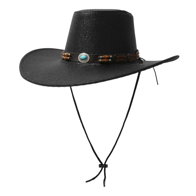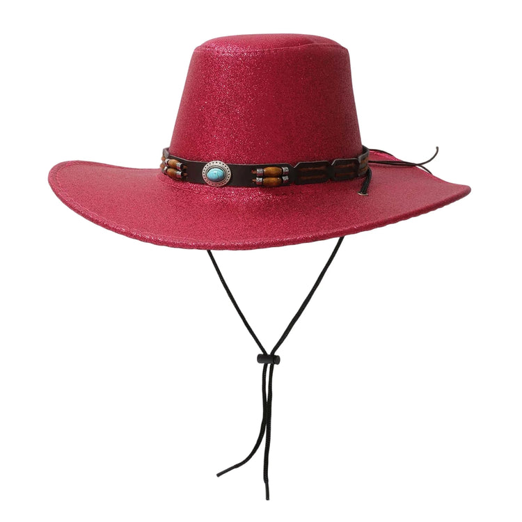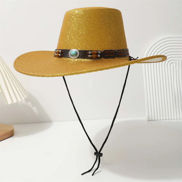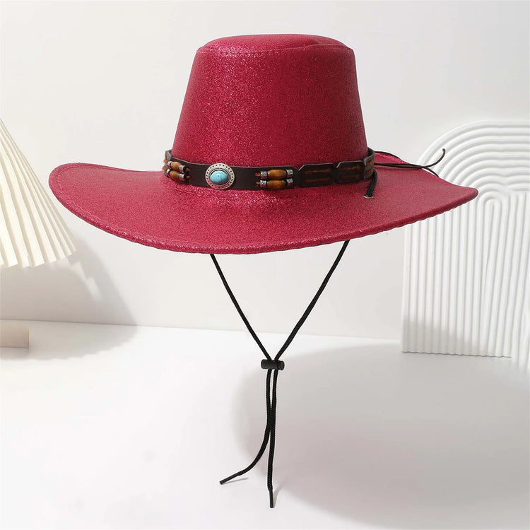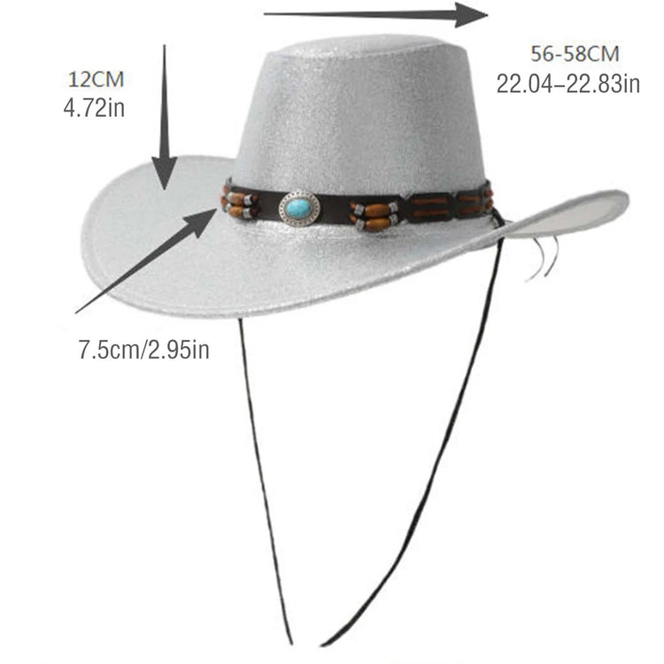Women Men Cowgirl Hat, Vintage Shiny Roll-up Wide Brim Outdoor Western Hat with Belt