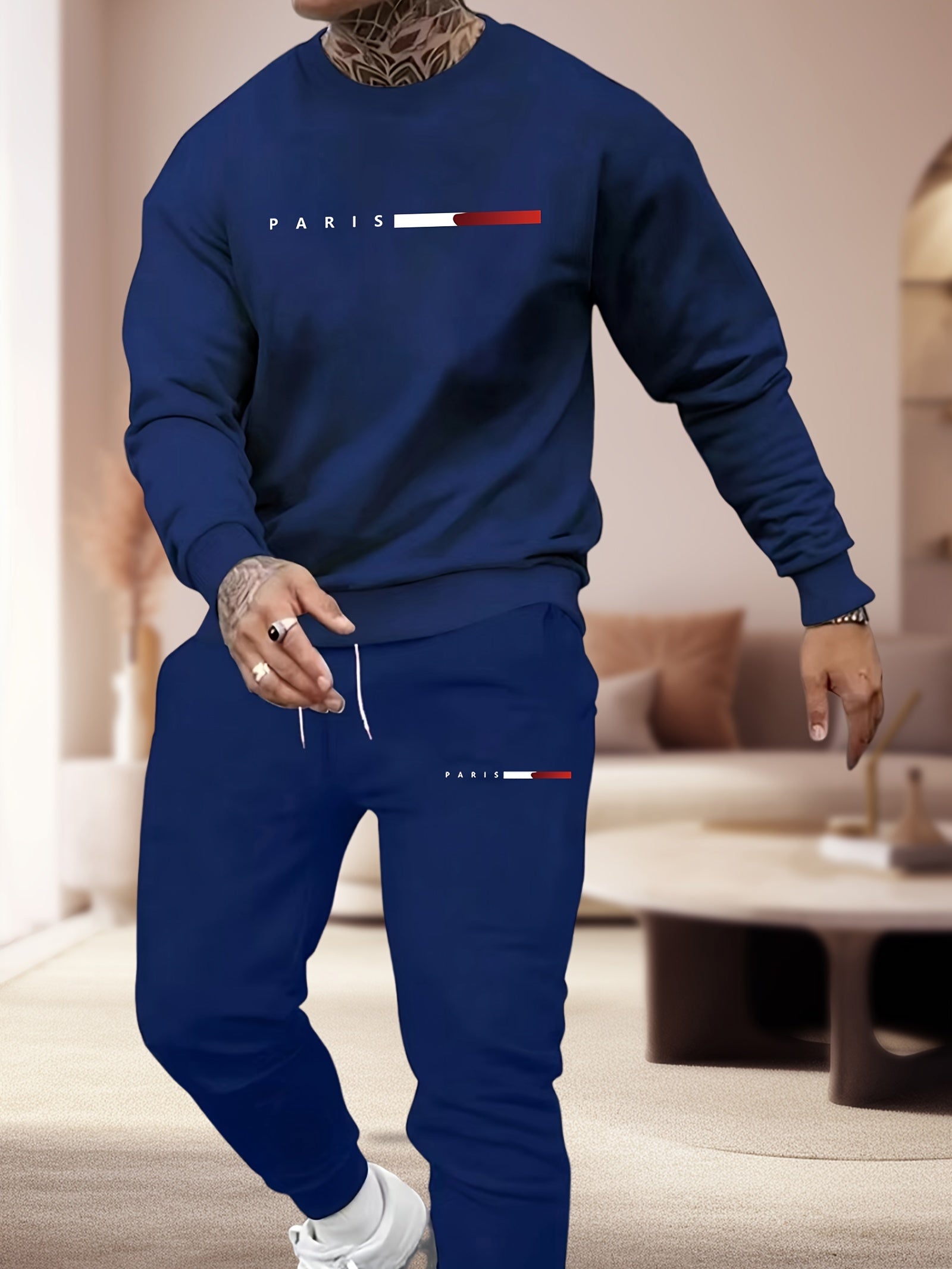 Men'S Casual 2pcs Pajama Set, Crew Neck Long Sleeve Top with Print Paris Design, Regular Fit Sweatpants with Pockets, 100% Polyester Knit Fabric, Slight Stretch, Fall Season Wear