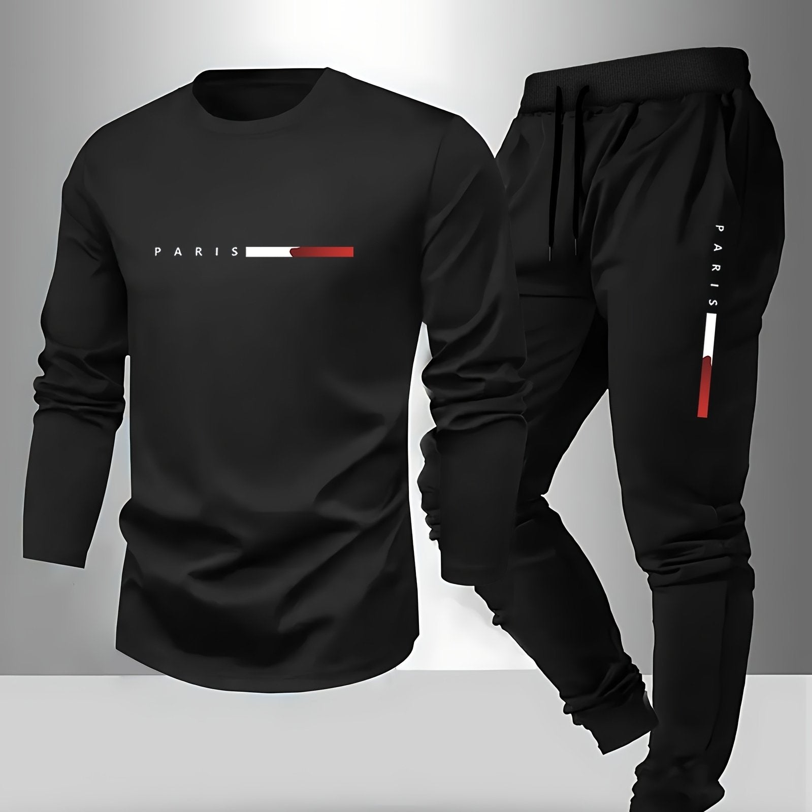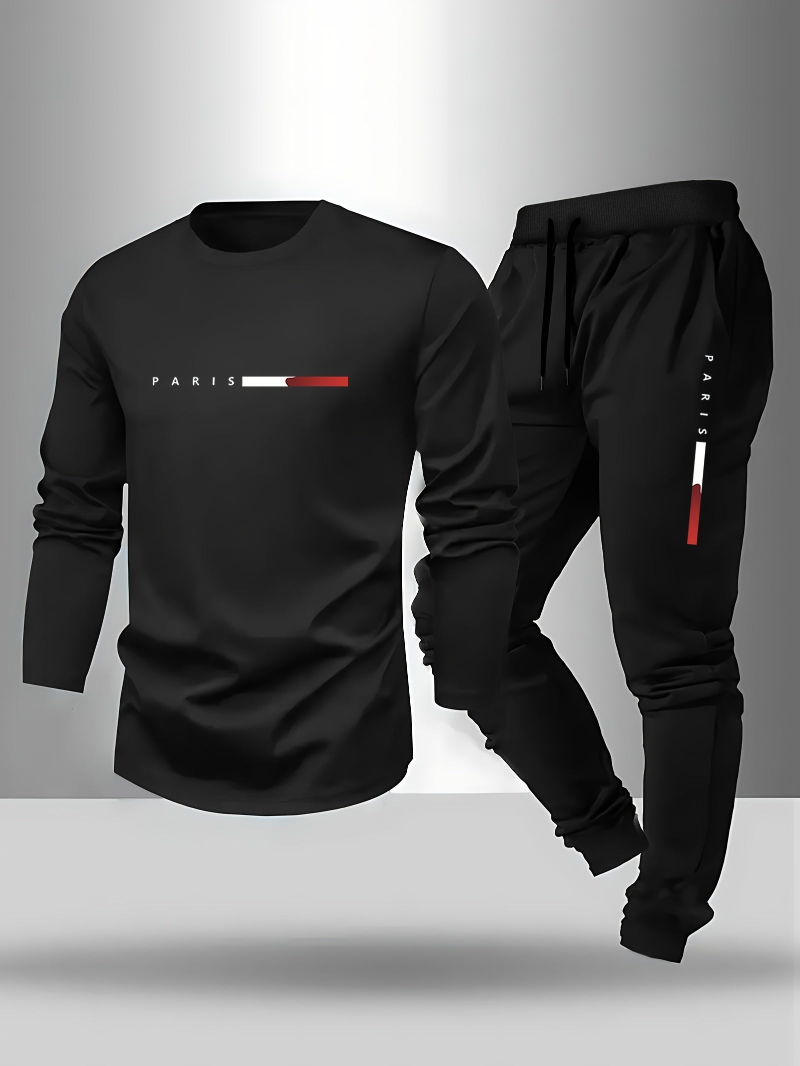 Men'S Casual Athletic Long Sleeve Shirt and Sweatpants Set - Black with White & Red "PARIS" Print, Drawstring Waist, Pockets, Polyester Blend for Golf, Running, Hiking & Outdoor Activities, Golf Attire, Sporty Look, Durable F