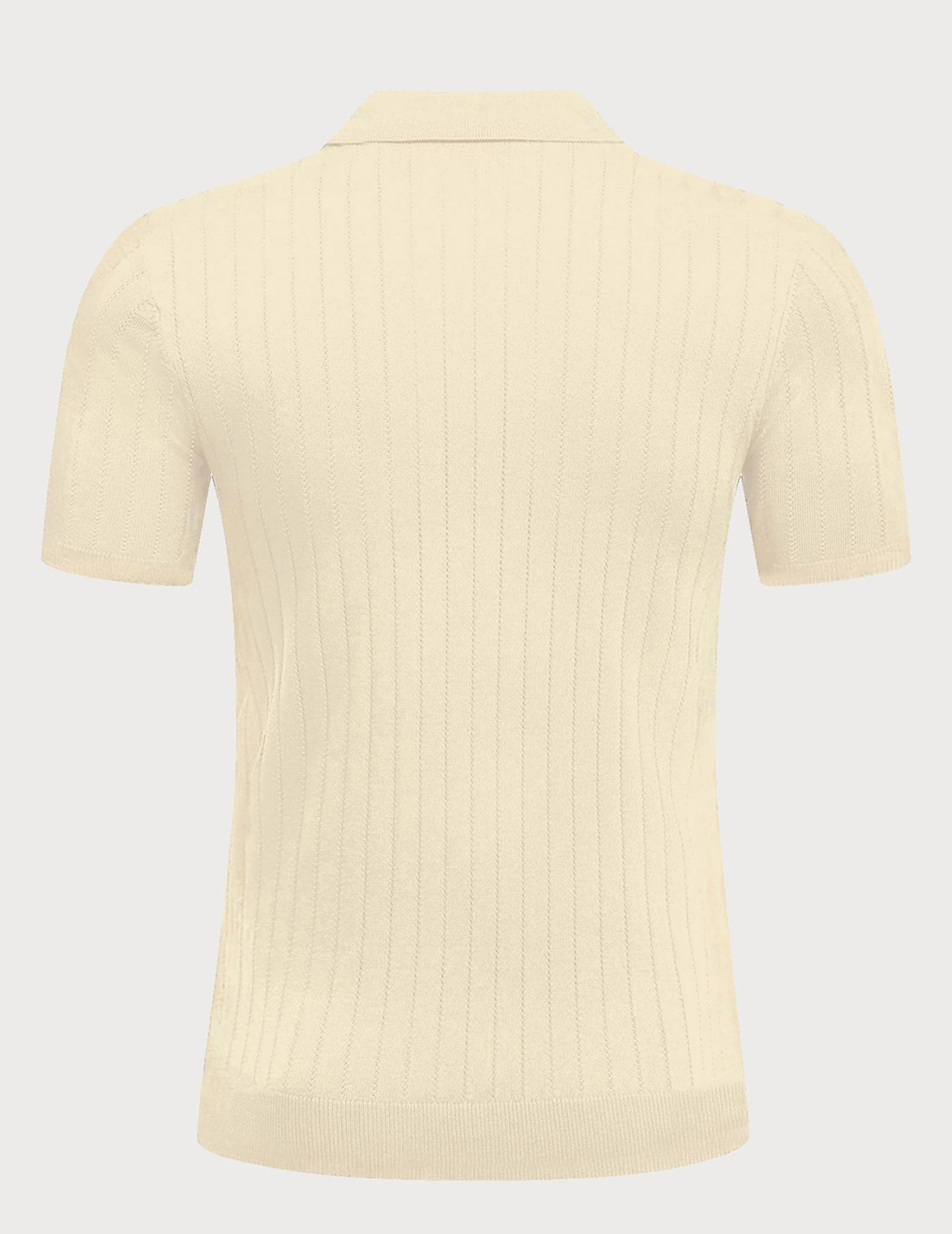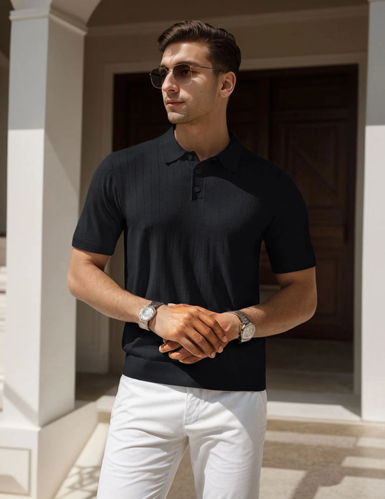 "Men's Polo Collar Short Sleeve Striped Knit Shirt - Stylish Casual Breathable Top for Everyday Wear"