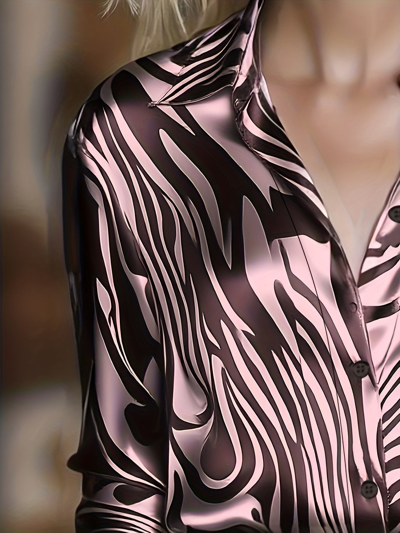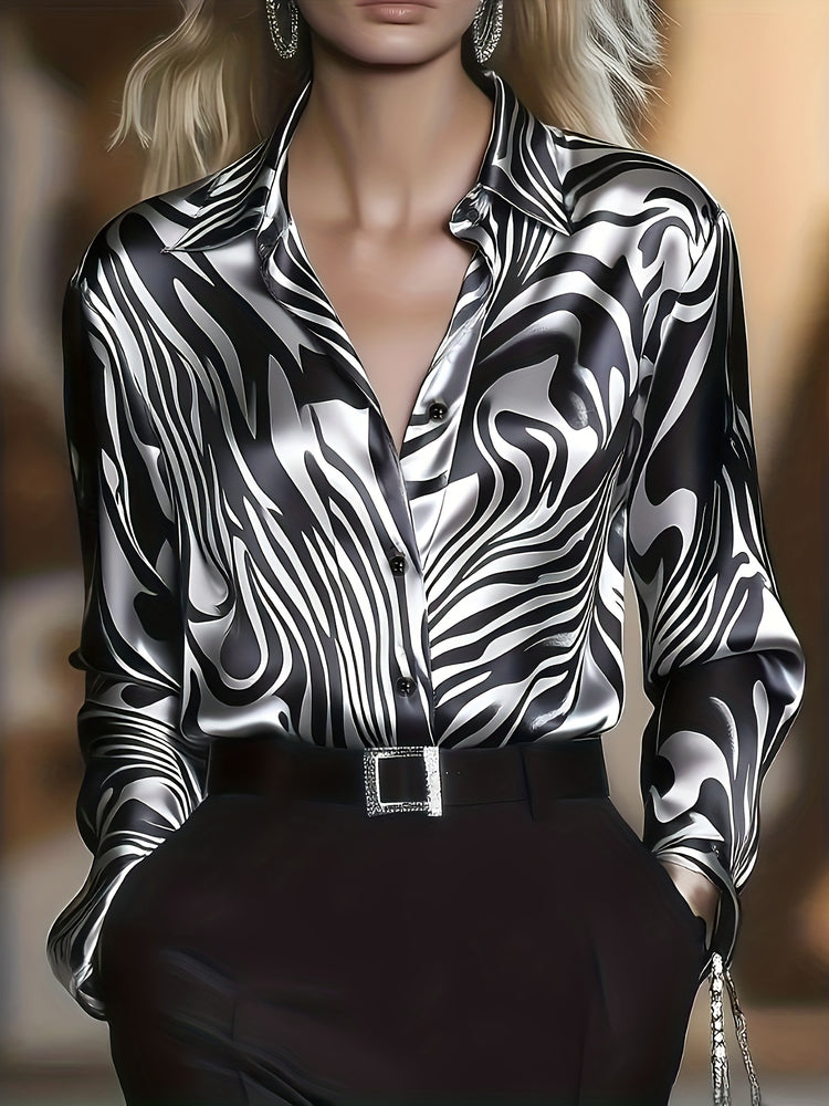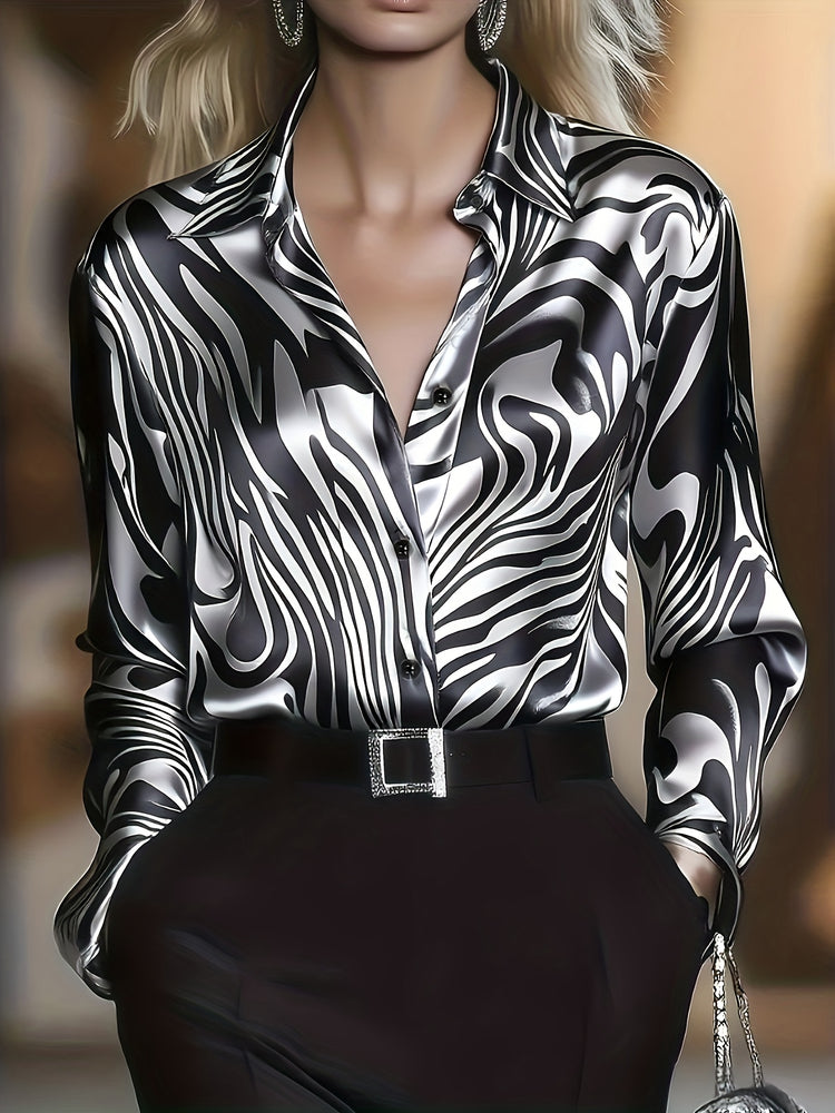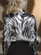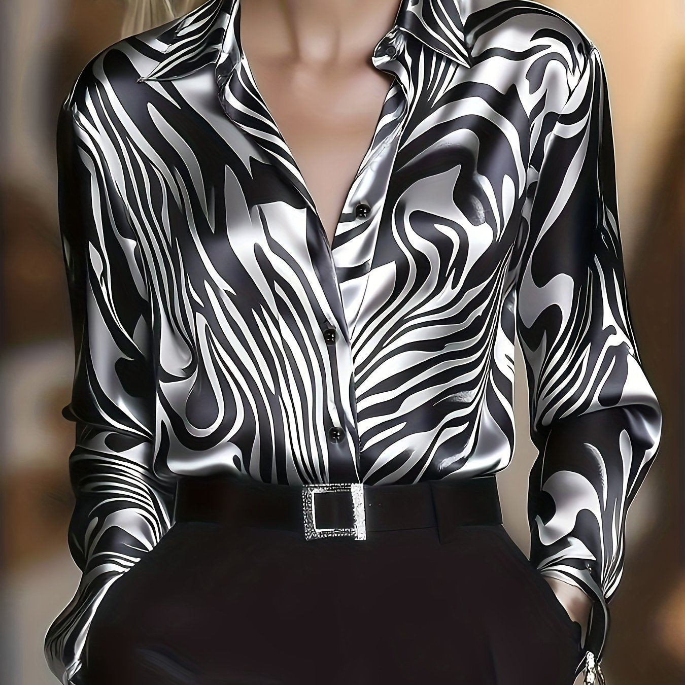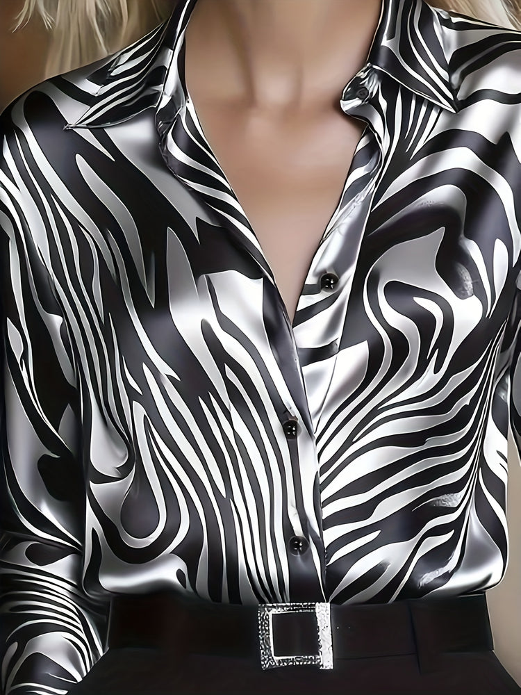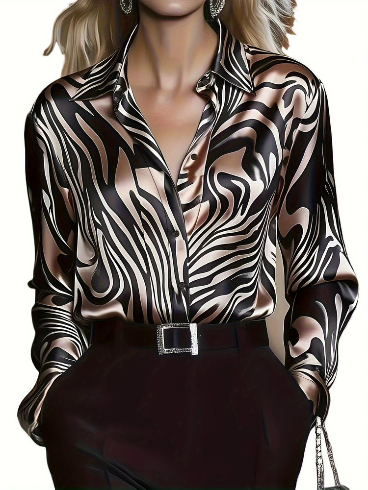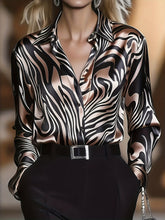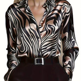 Plus Size, Women's Fashion Satin Zebra Print Shirt, Spring/Autumn New Elegant Plus Size Long Sleeve Top, Loose Fit for All Seasons, Suitable for Daily Outings and Wear