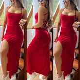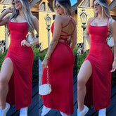 Red Dresses Women Sleeveless Spaghetti Strap Solid Color Elegant Club Party Robes Sexy Cross Bandage Backless Bodycon Long Dress