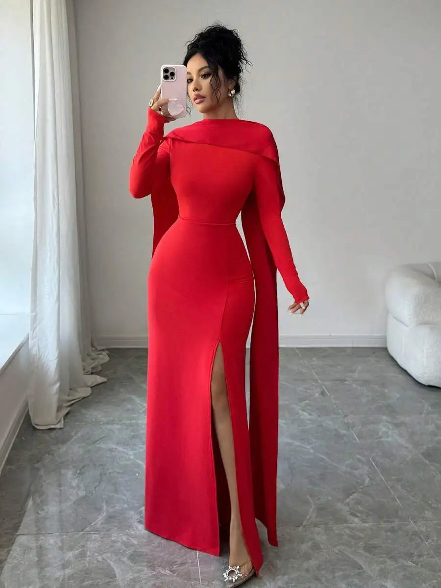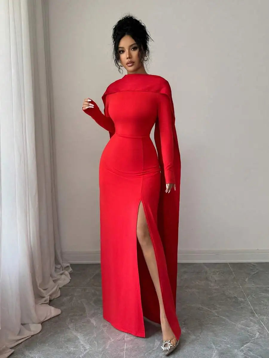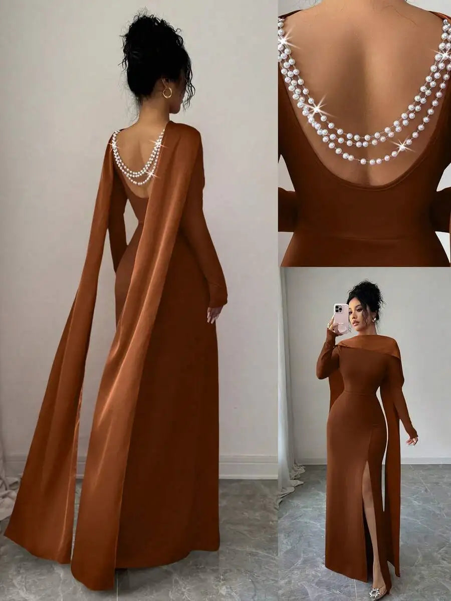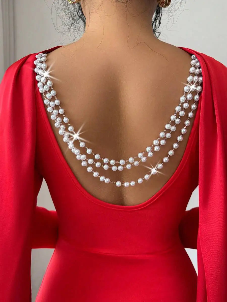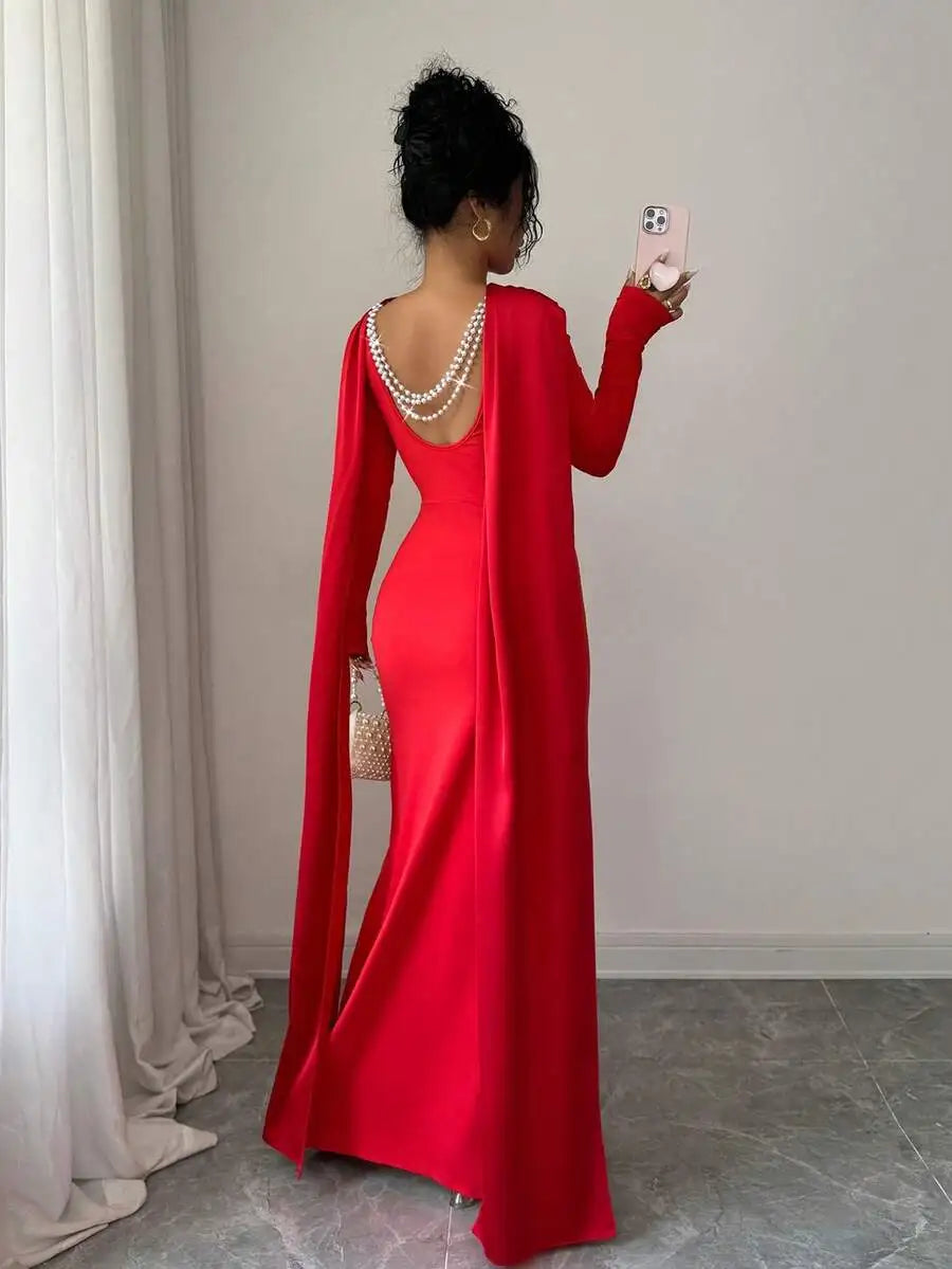 Red Satin Long Sleeve Mermaid Dress with Pearl-Embellished Open Back and Side Slit