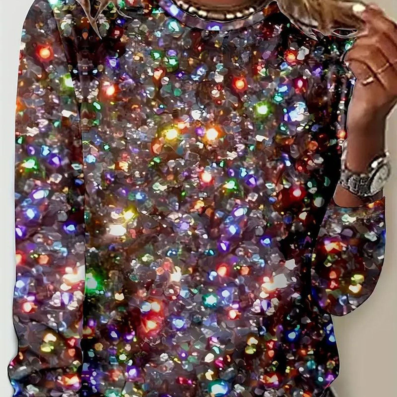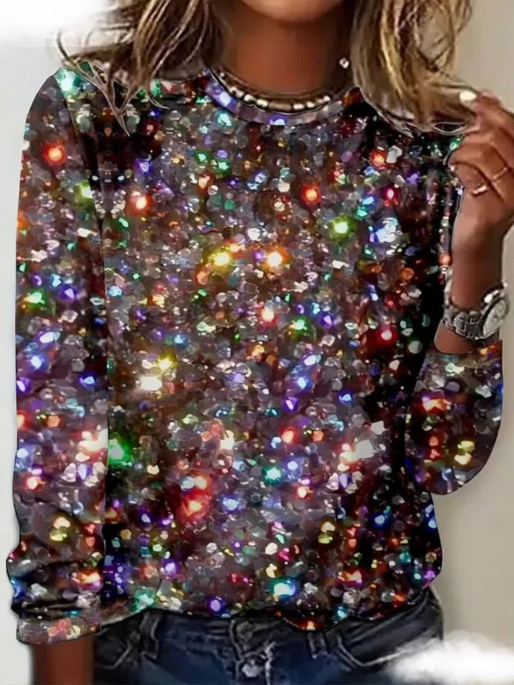 Sparkling All-Over Sequin Blouse - Plus Size Women's Elegant Shimmering Crew Neck - Long Sleeve T-Shirt H-Line Regular Fit Top - Machine Washable for Holiday Party Wedding Christmas - Multi-Color Options (Non-)