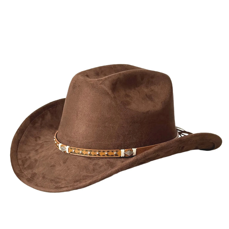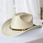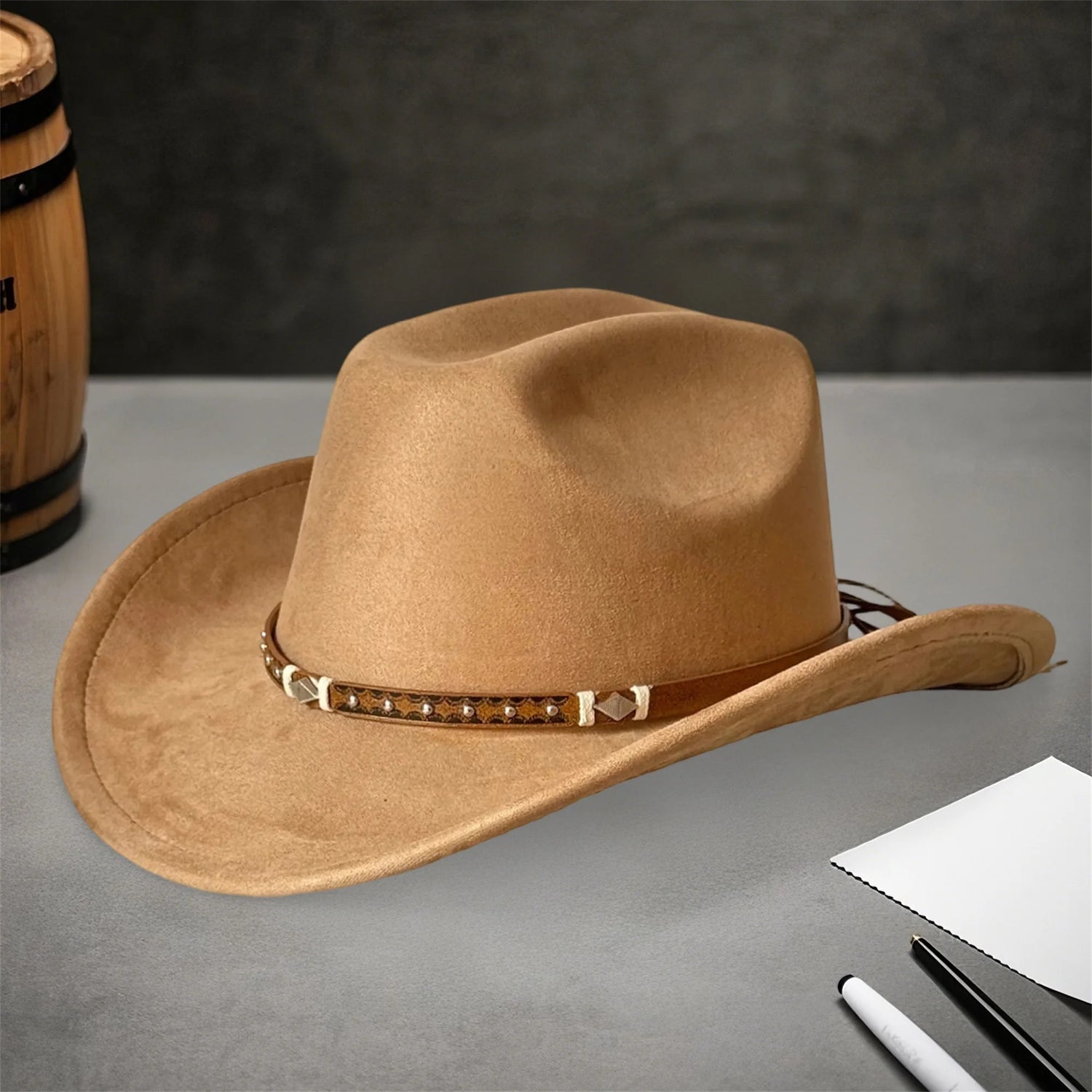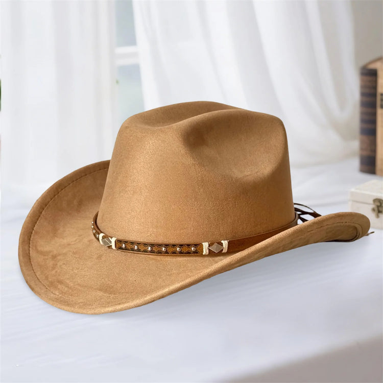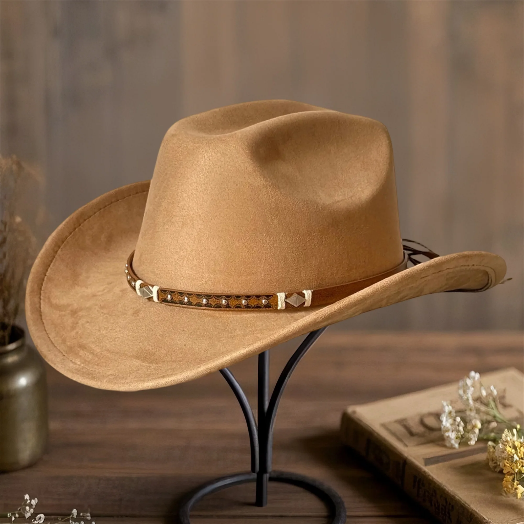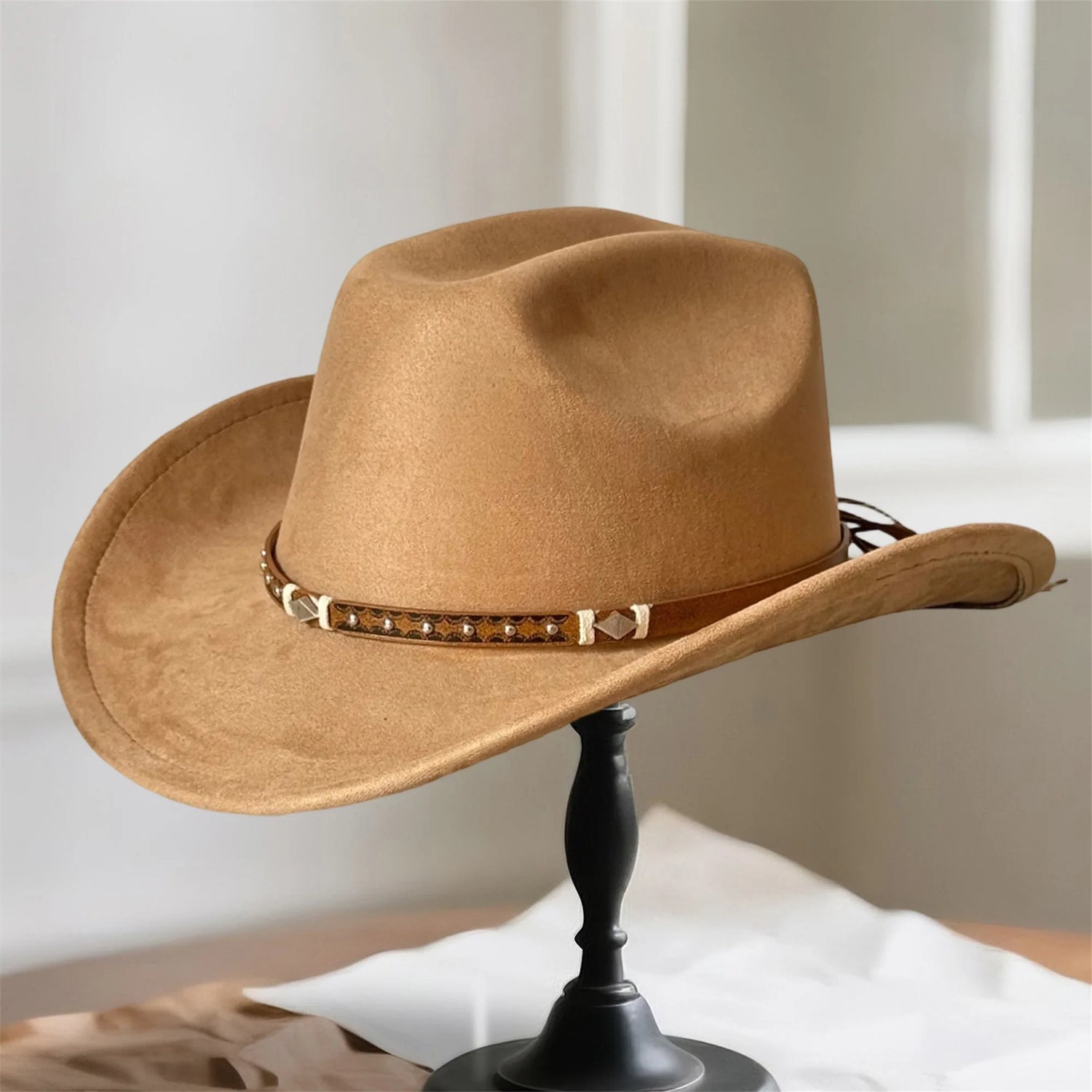 Stylish Unisex Cowboy Hats with Embellished Band Trendy Wide Brim Fedora Caps for Stylish Outdoor Adventures and Travel