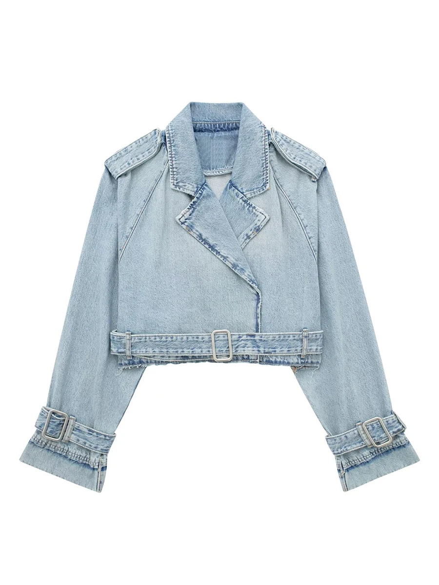 Women's V-neck Autumn Cross-strap Design Denim Trendy Sky Blue Street Style Jacket