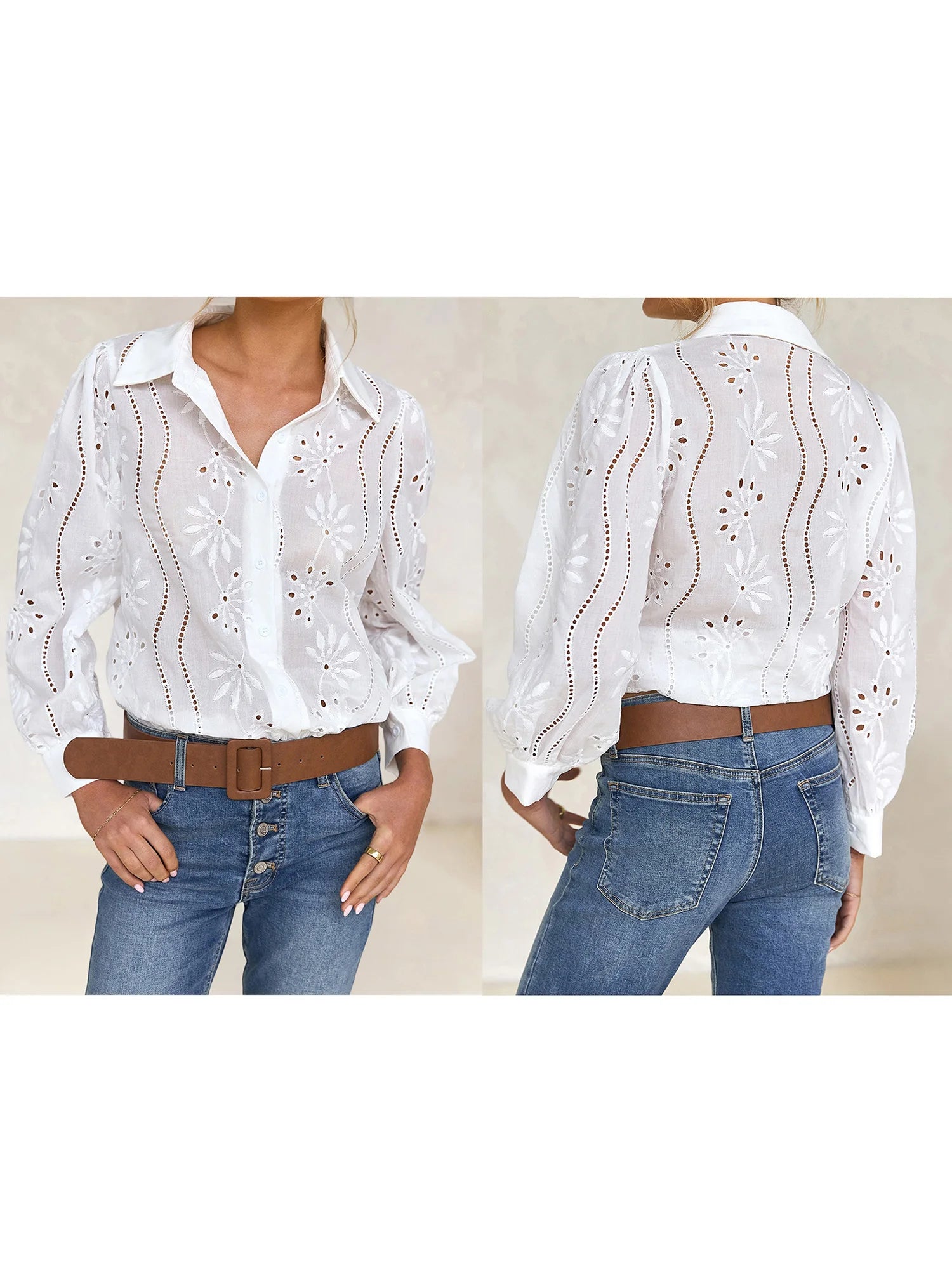 Stylish Women s Eyelet Blouse with Long Sleeves and Turn Down Collar in Solid Color Loose Fit Shirt for Fashionistas