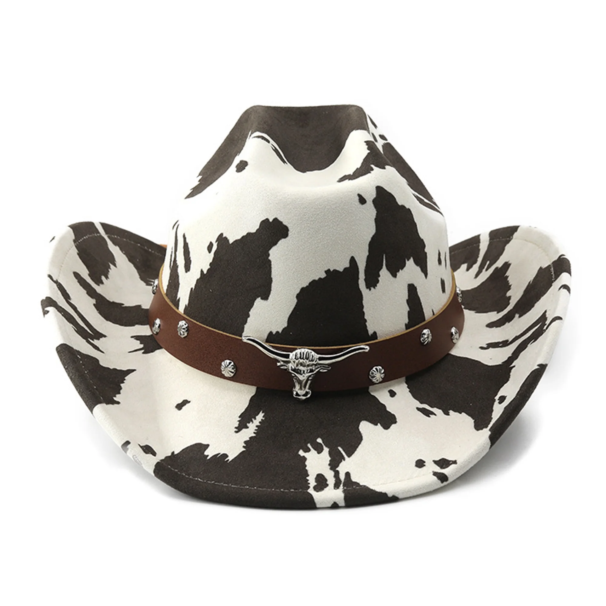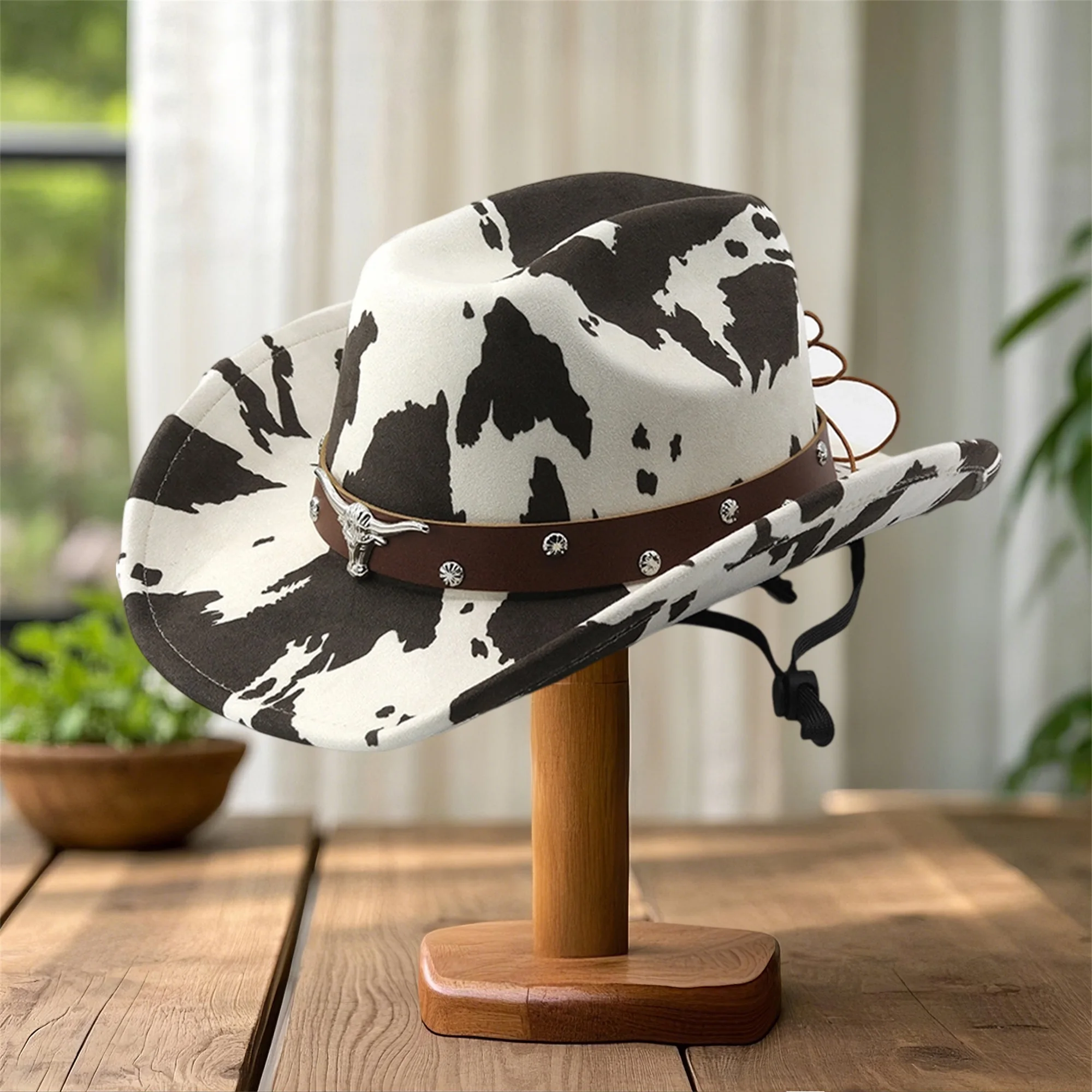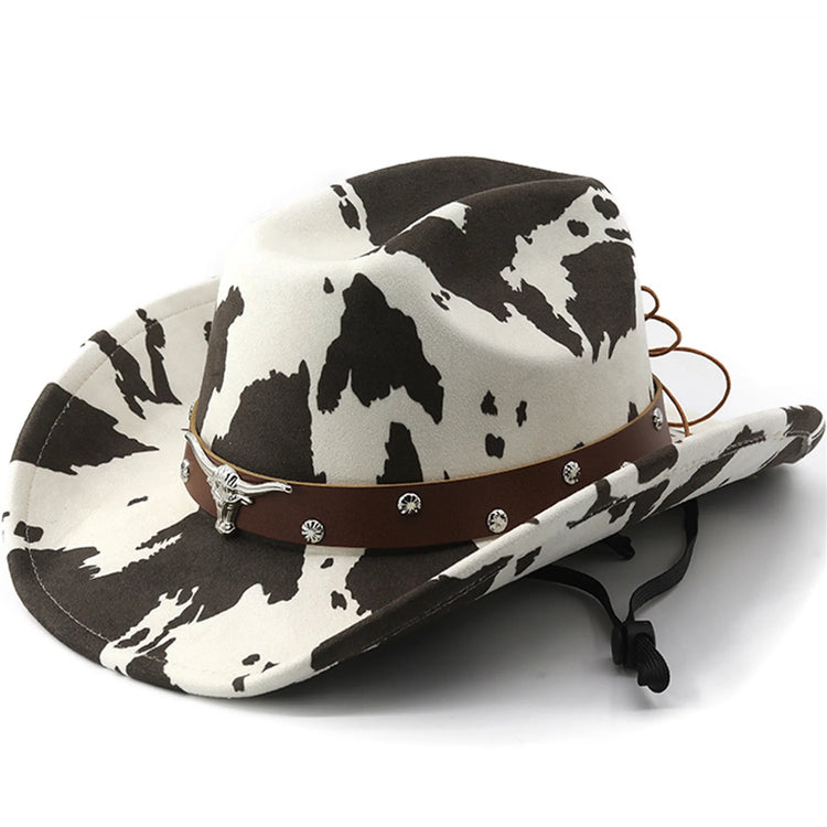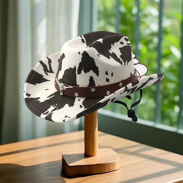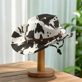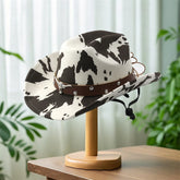 Vintage Leather Cowboy Hat for Women and Men with Cow Print Design Wide Brim Western Cap featuring Windproof Rope and Leather