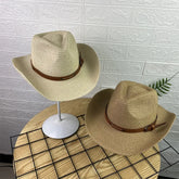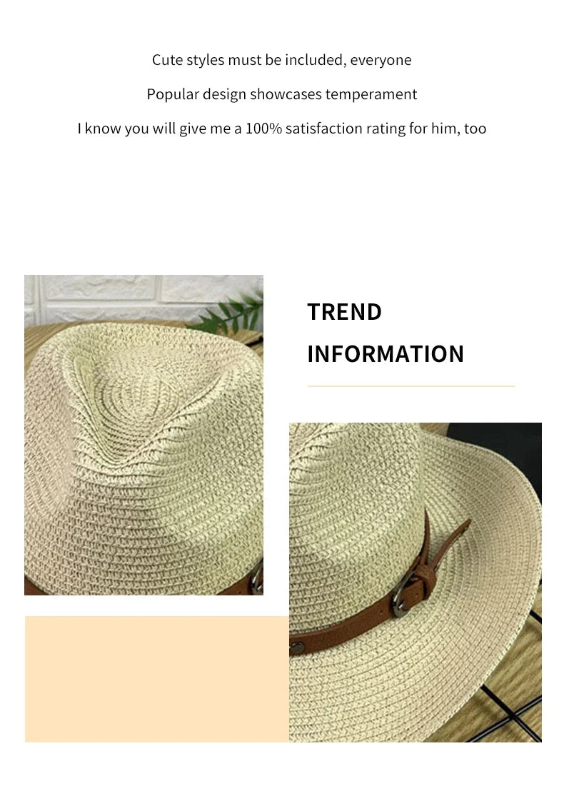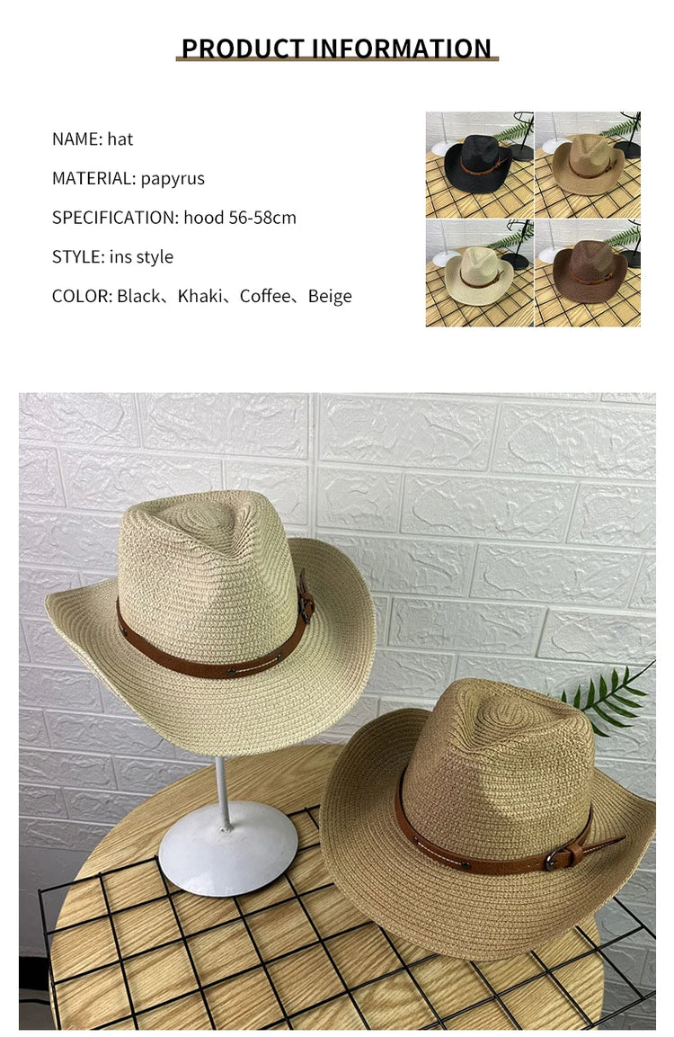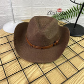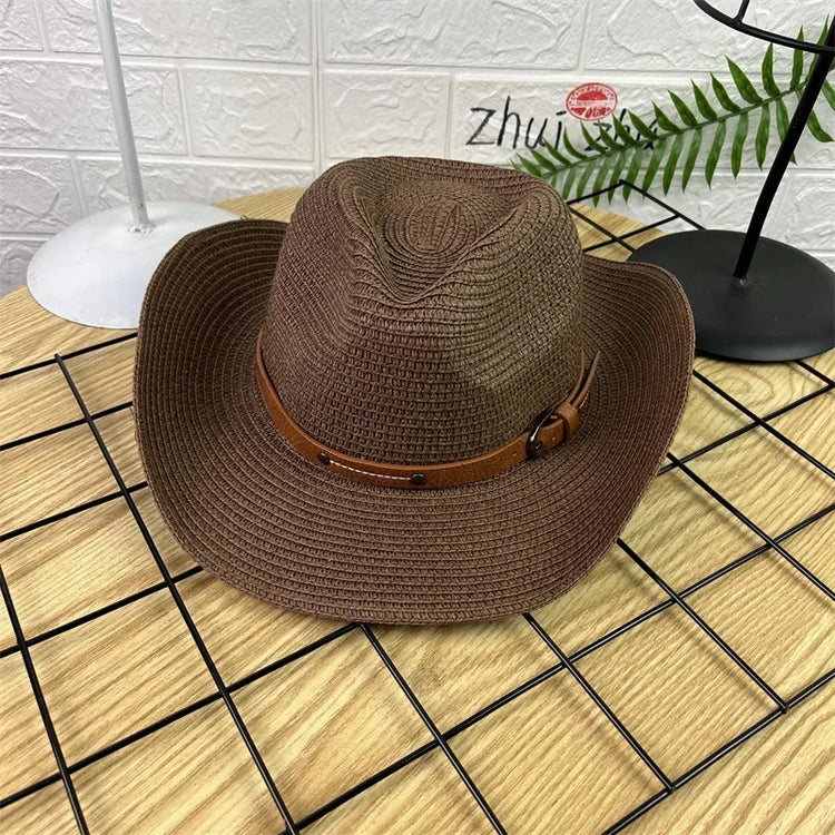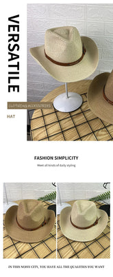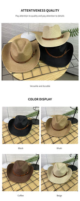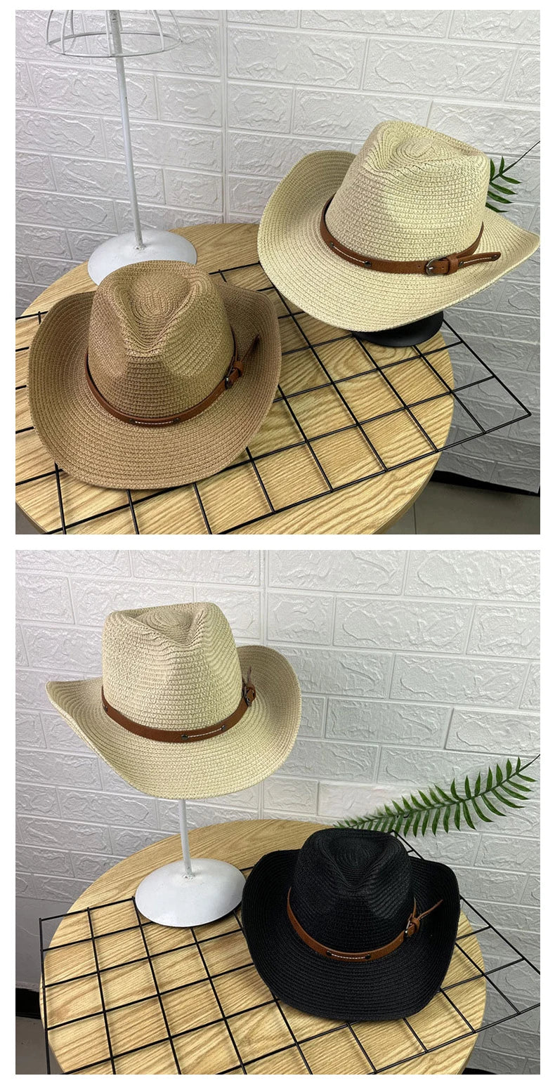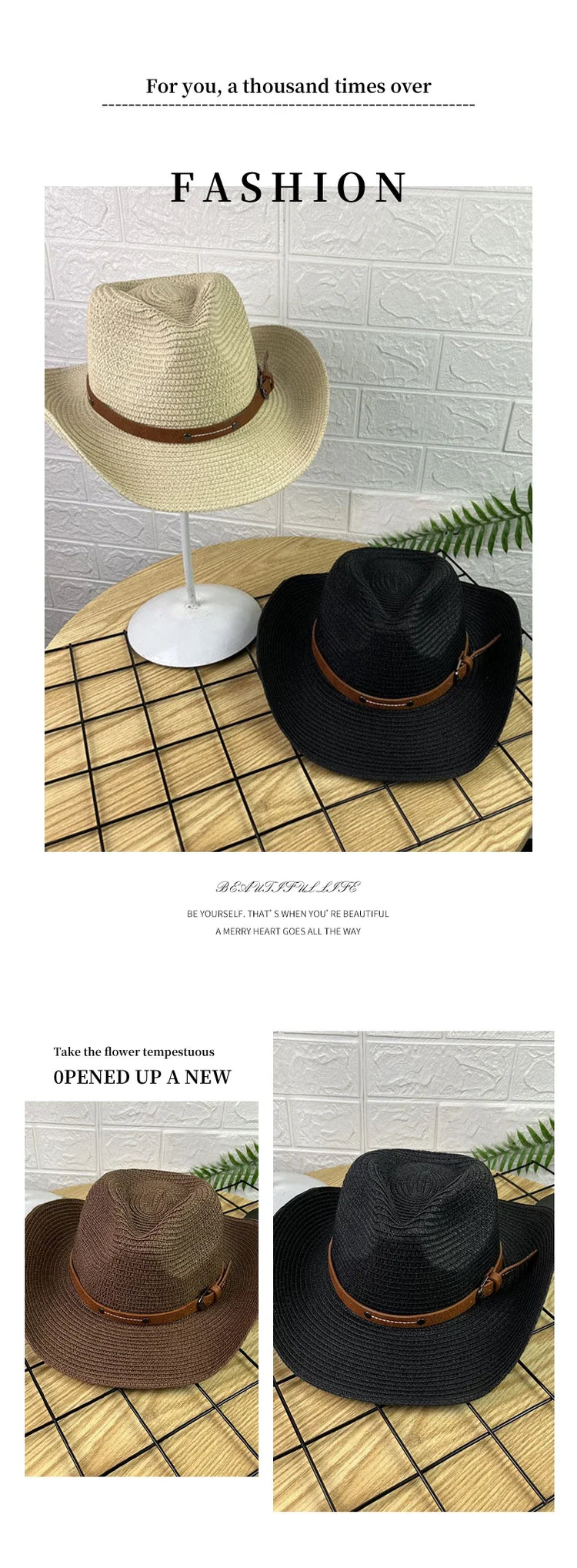Wide Brim Straw Unisex Cowboy Hat Sun Protection Western Cowgirl Cowboy Hat with Wind Lanyard Durable Travel Foldable for Summer