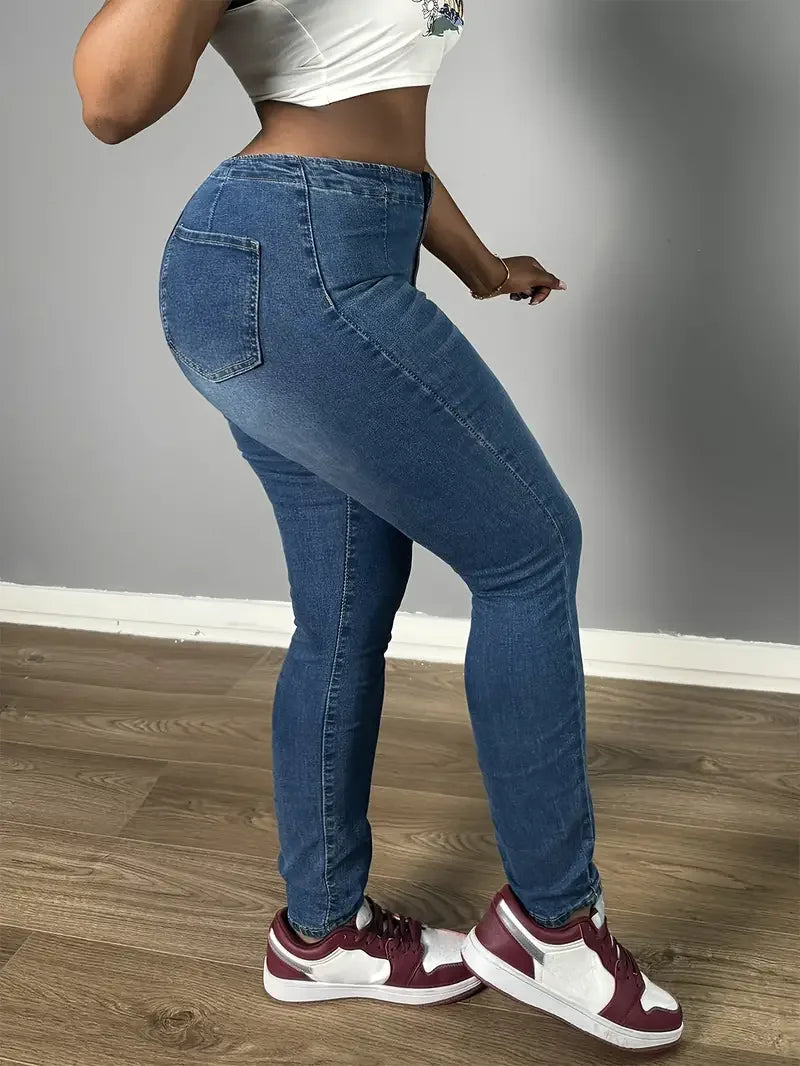 Women Fashion Skinny Single-breasted Jeans Comfortable Stretch Casual Denim Pants Dark Blue