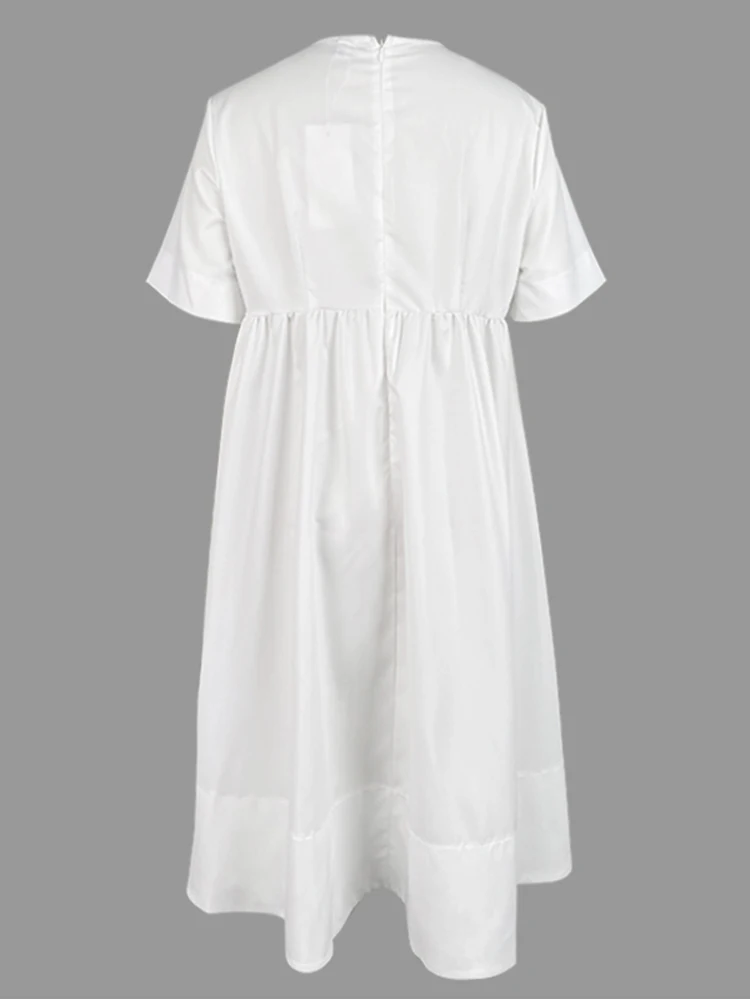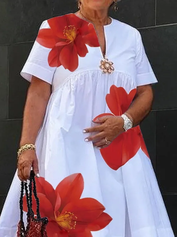 Women Midi Shirts Dress Summer New Dress 2025 V-Neck Pleated Short Sleeves White Loose Casual Flower Print A-line Dresses