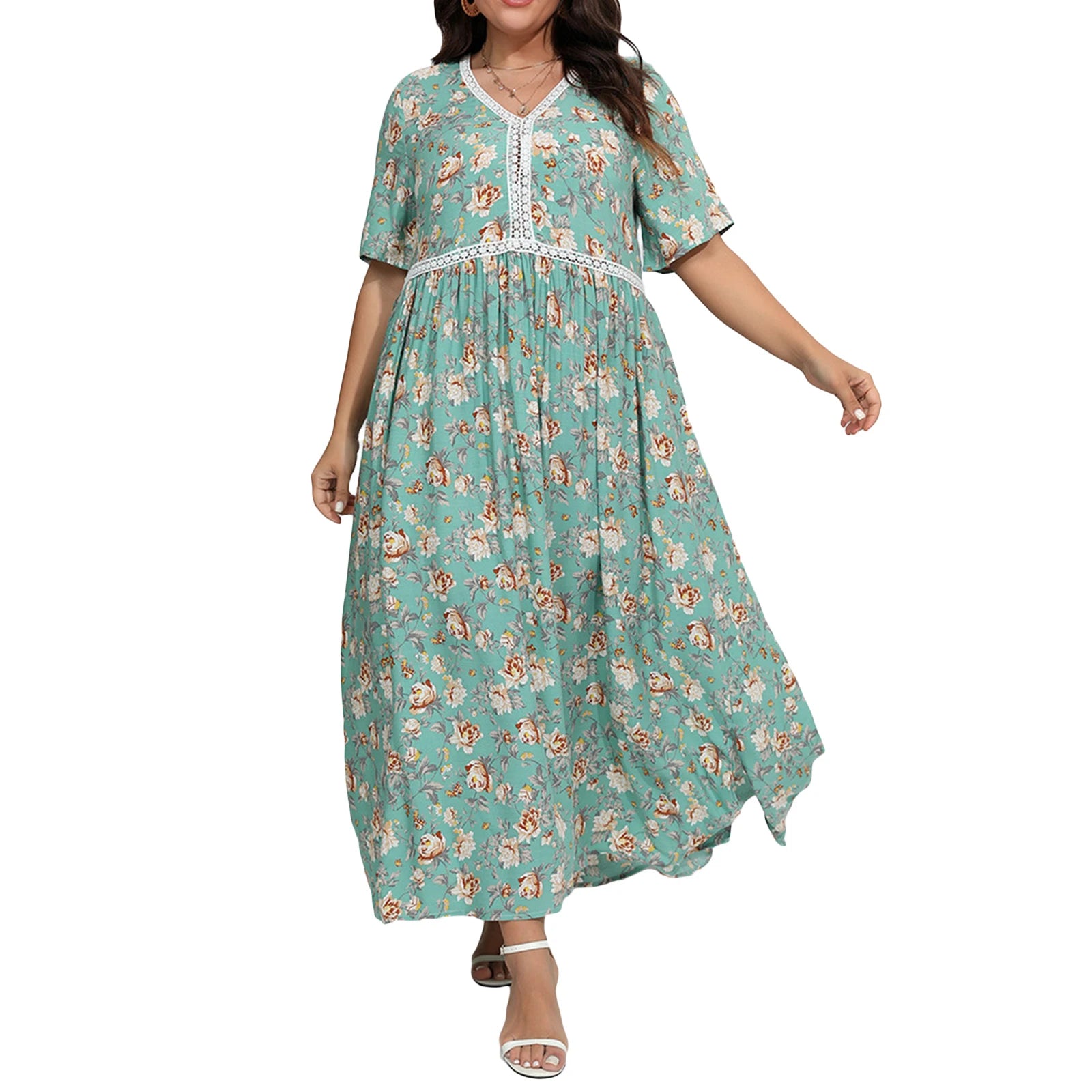 Women Plus Size Dress Floral Print Short Sleeve V-Neck Dress Summer Beach Holiday Casual Long Dress