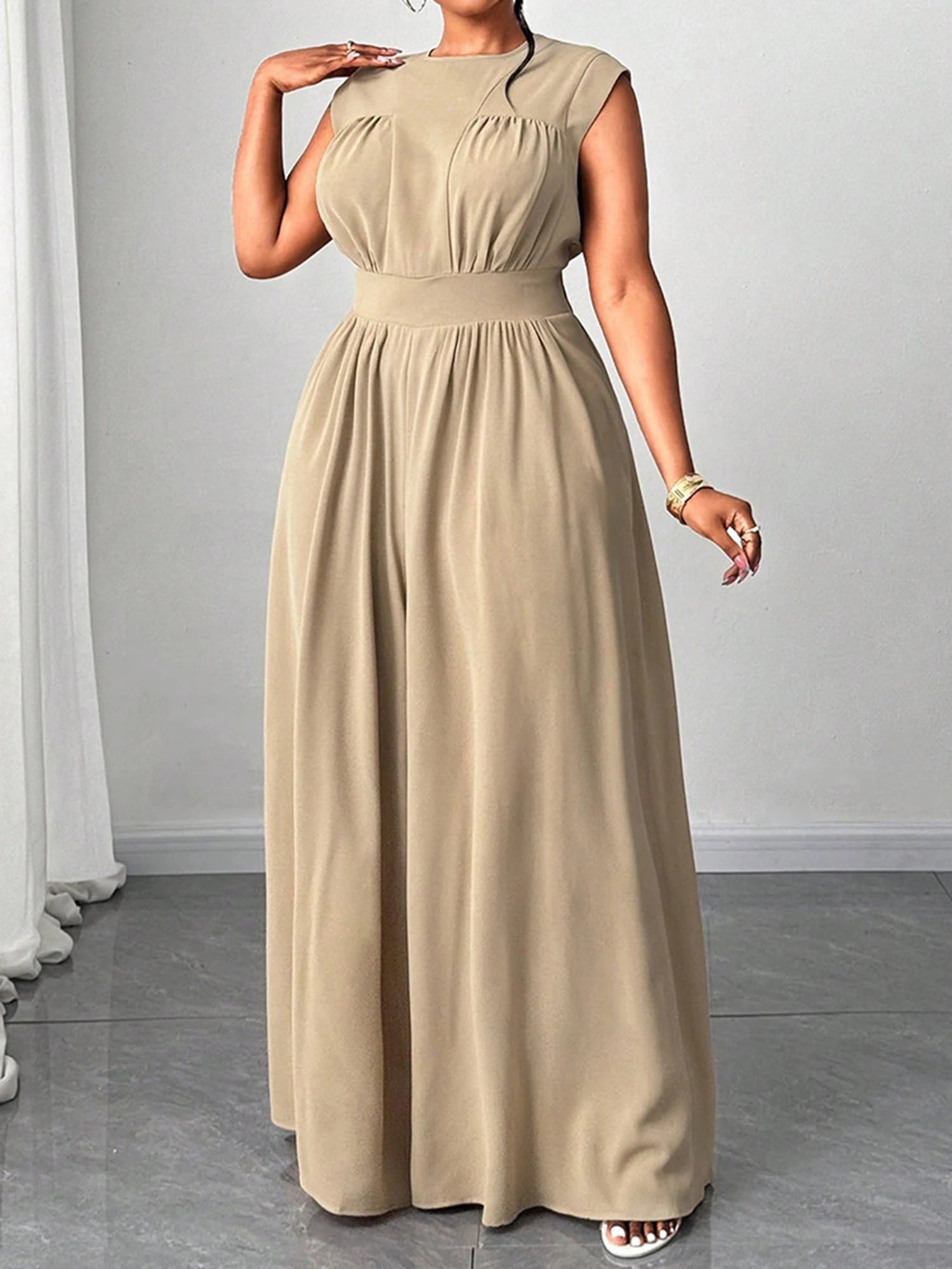 Women Plus Size Jumpsuits Solid Color Round Neck Sleeveless Summer Wide-Leg Rompers Overalls
