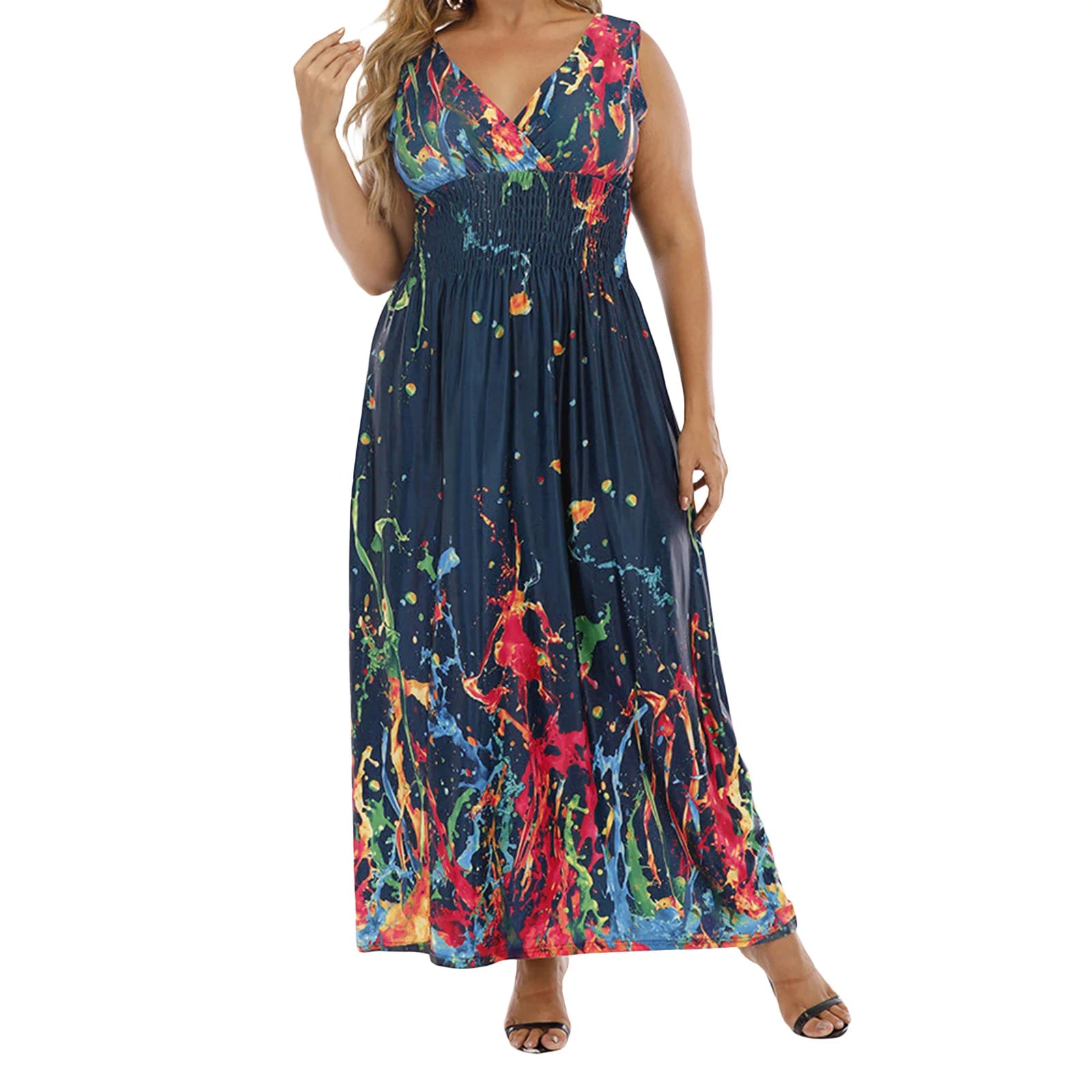 Women Plus Size Sleeveless Maxi Dress Casual Floral Print V-Neck Party Dress for Beach Club Streetwear Summer Fashion Trend