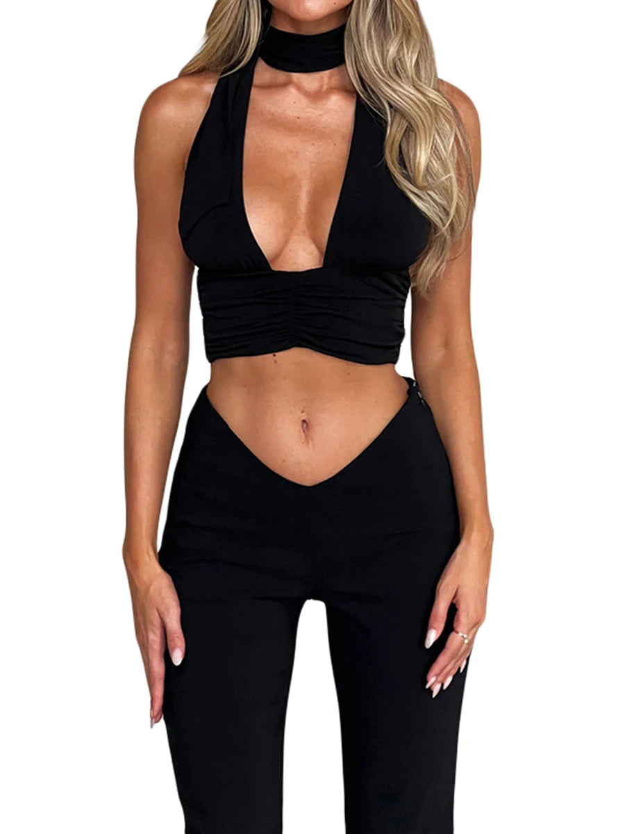 Women Ruched Halterneck Tops Solid Color Summer Casual Bandage Backless Sleeveless Crop Tops Streetwear