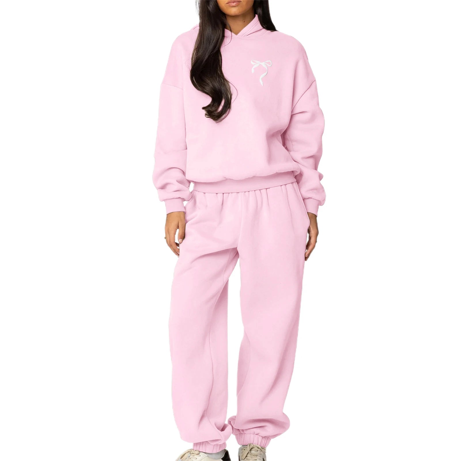Women's 2 Piece Casual Outfits Long Sleeve Bow Embroidery Hoodie Solid Color Pants Sets
