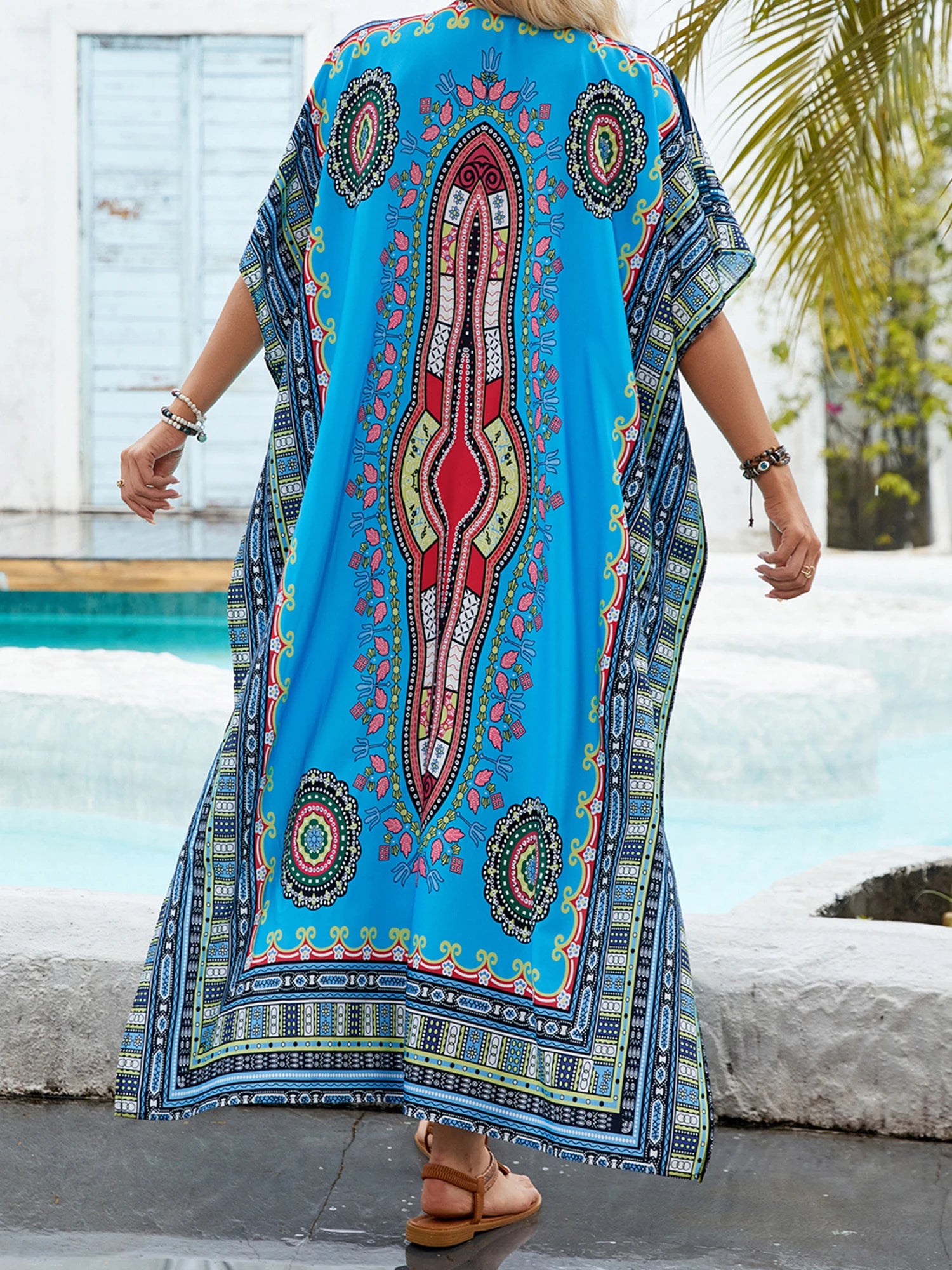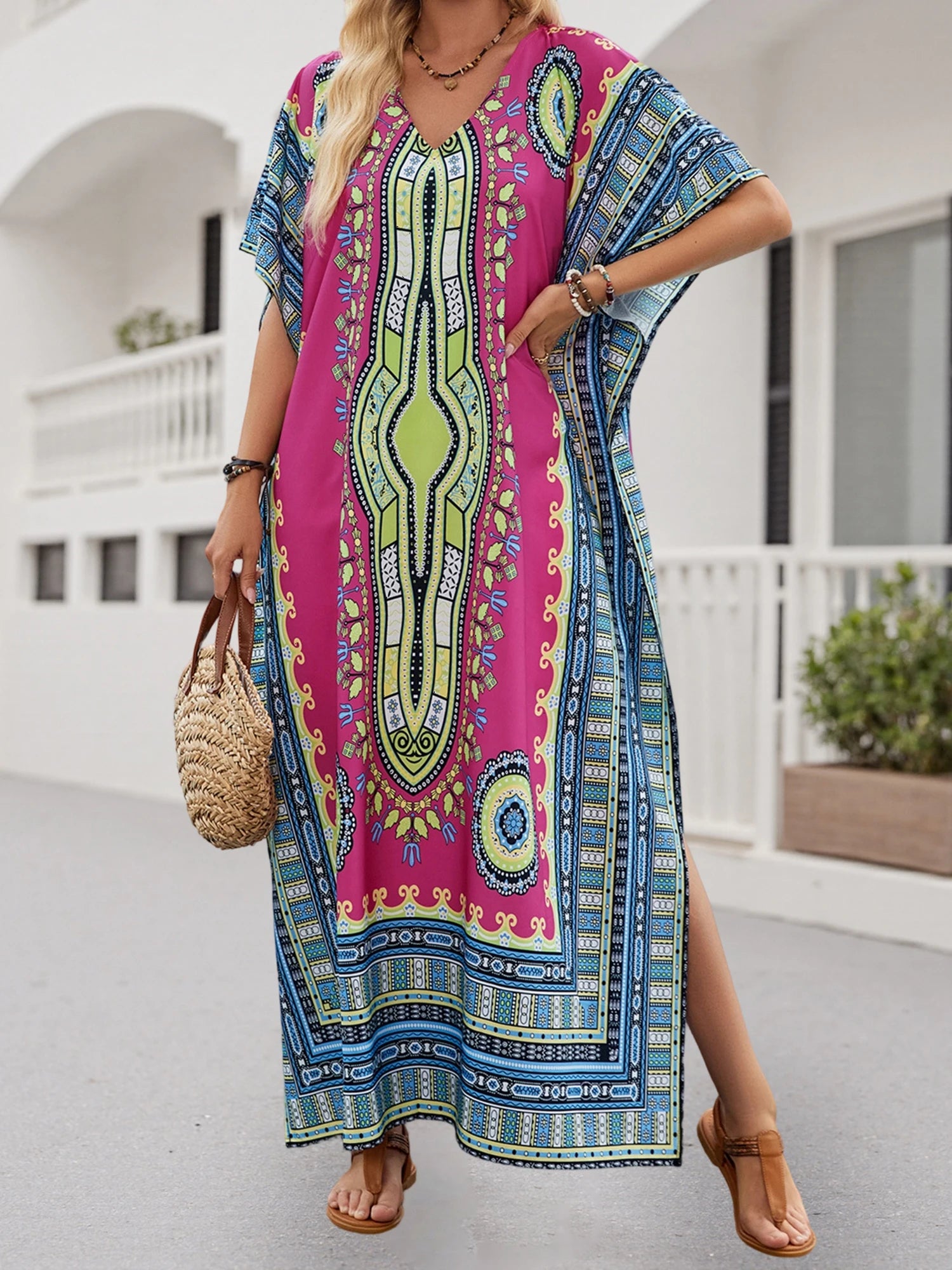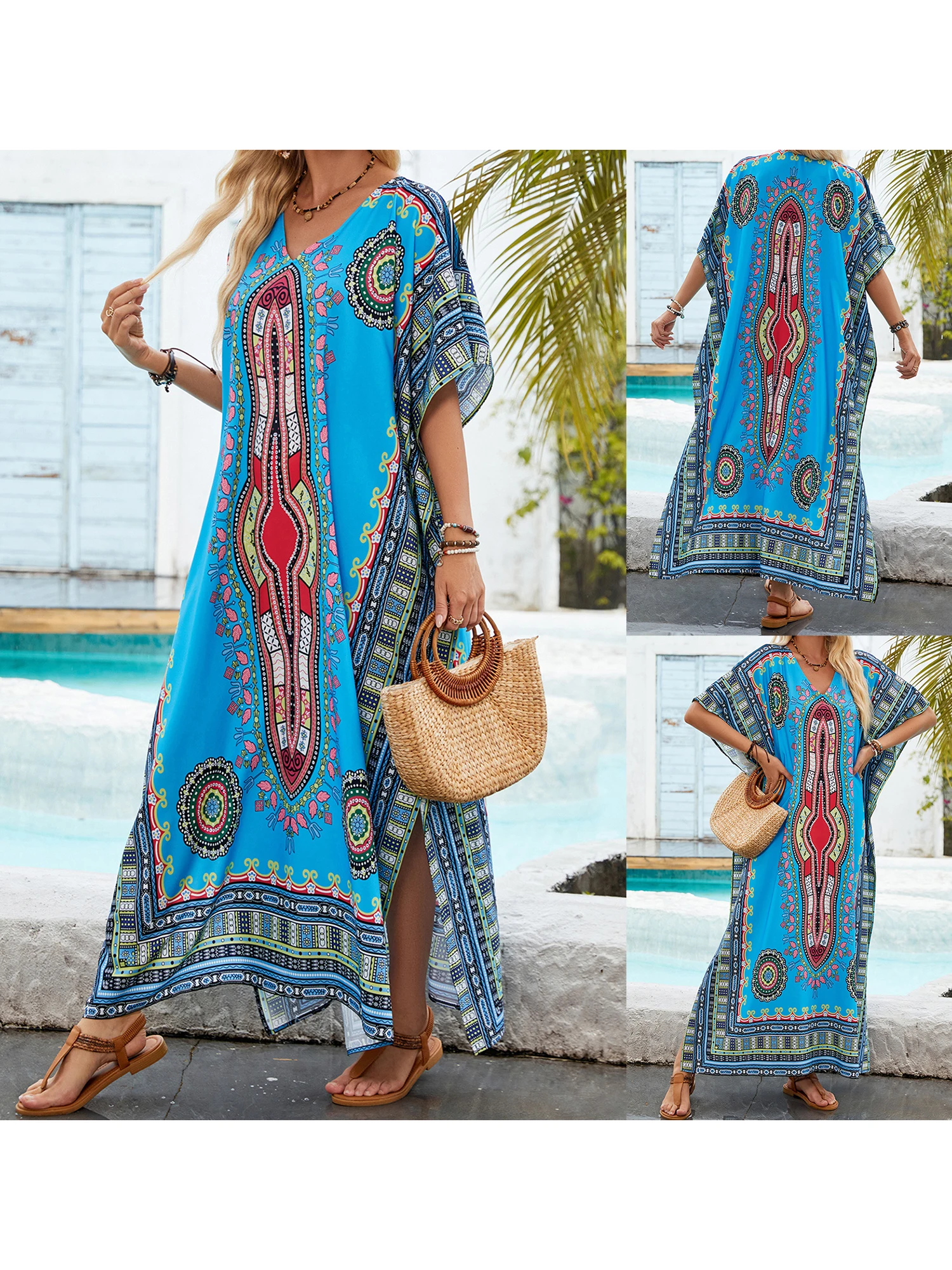 Women Cover-up Dress, Short Sleeve V-neck Printed Loose Slit Dress Summer Long Beach Dress