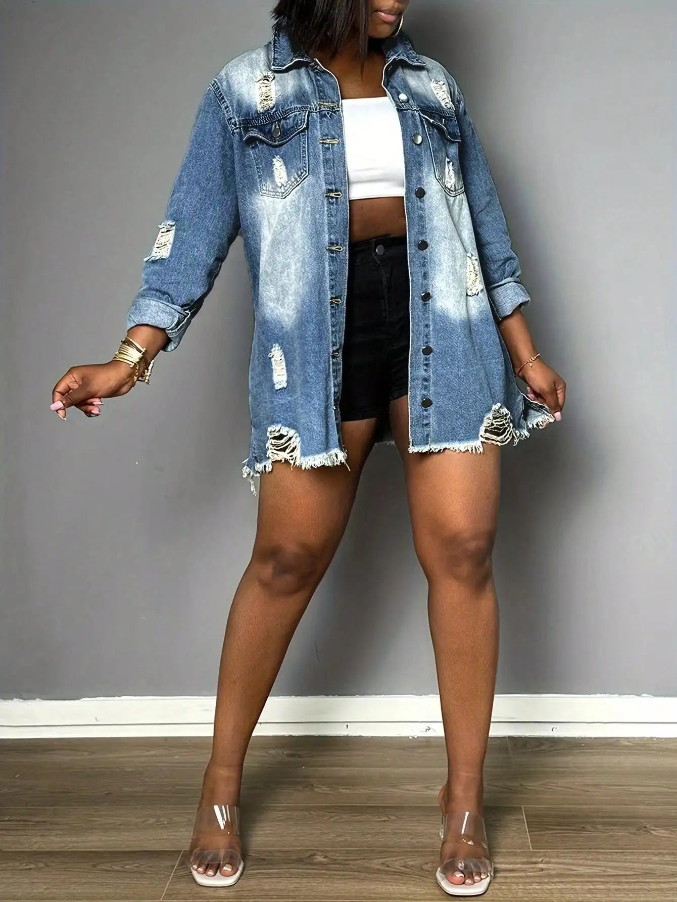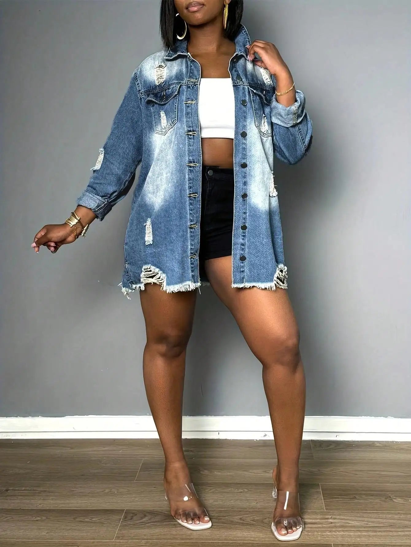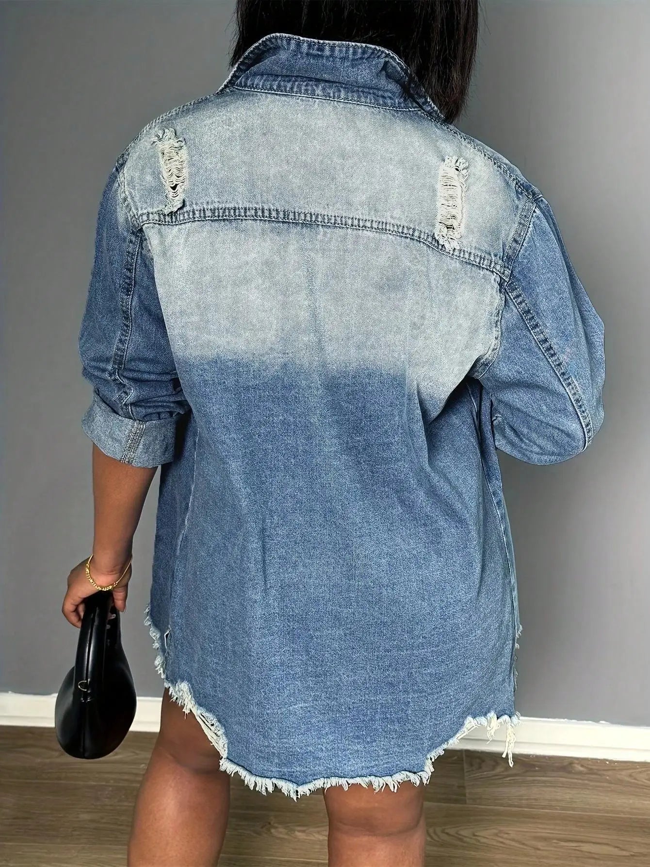 Women’s Oversized Button Up Frayed Hem Long Sleeve Pockets Denim Jean Jacket