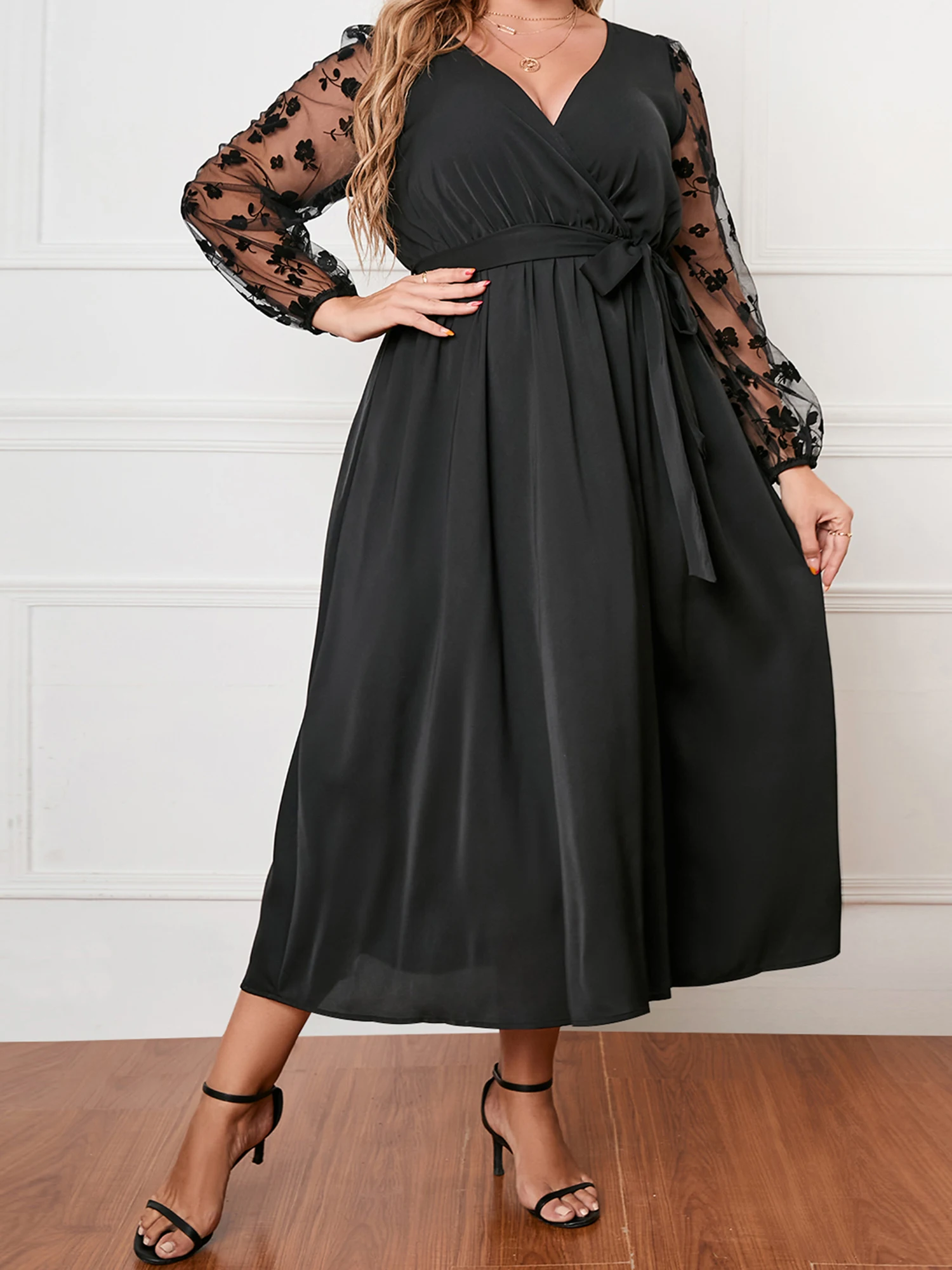 Women s Plus Size Satin Dress Embroidered Lace Long Sleeve Wrap V-Neck A Line Dress with Belt for Spring Fall Wedding Party
