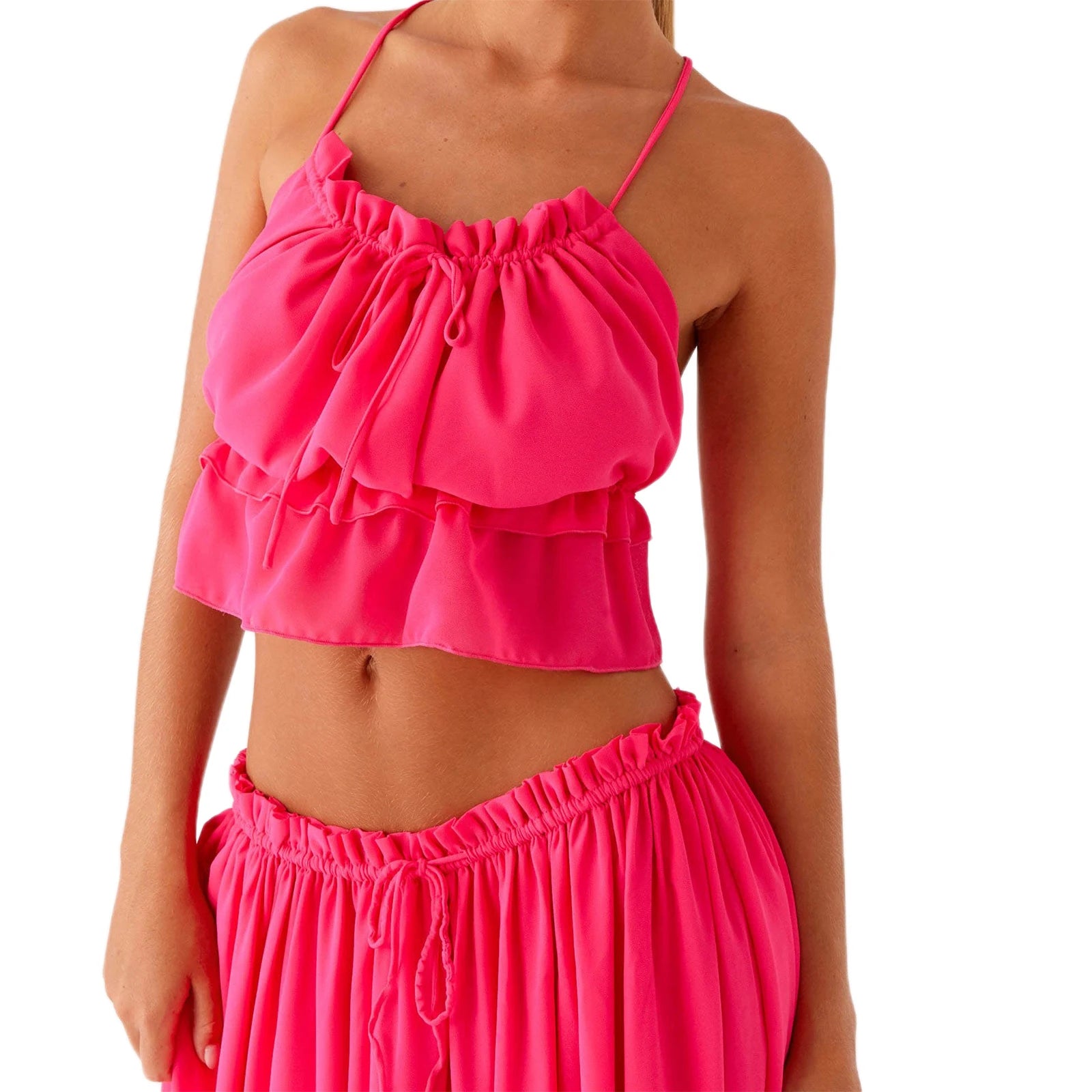 Solid color/floral print, back cross straps and sleeveless, bandage and backless, ruffles, crop length; Cute summer tops for women; Trendy tops for women; Crop camisole tops for women, charming and comfortable