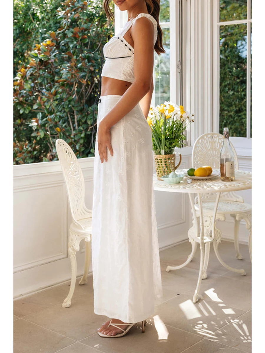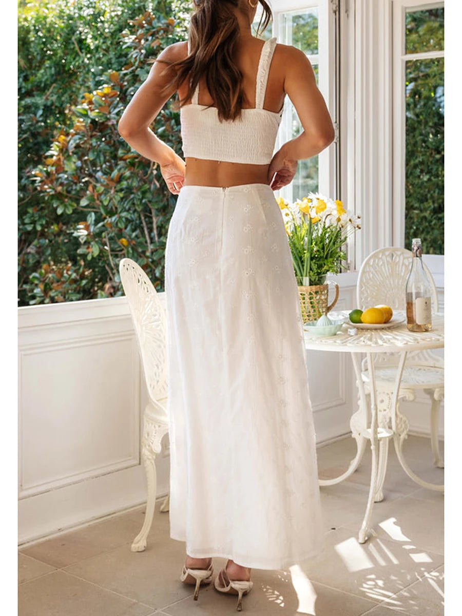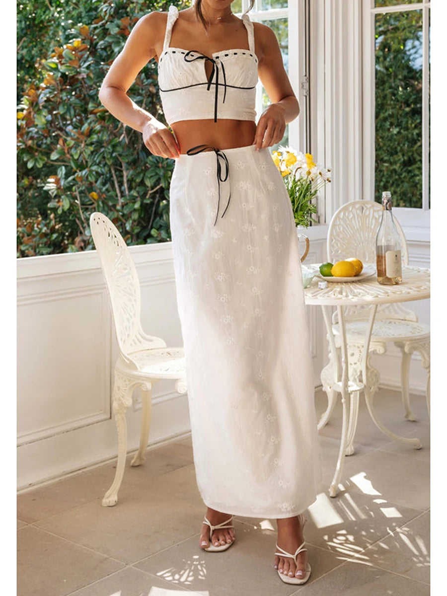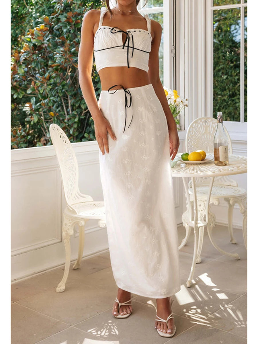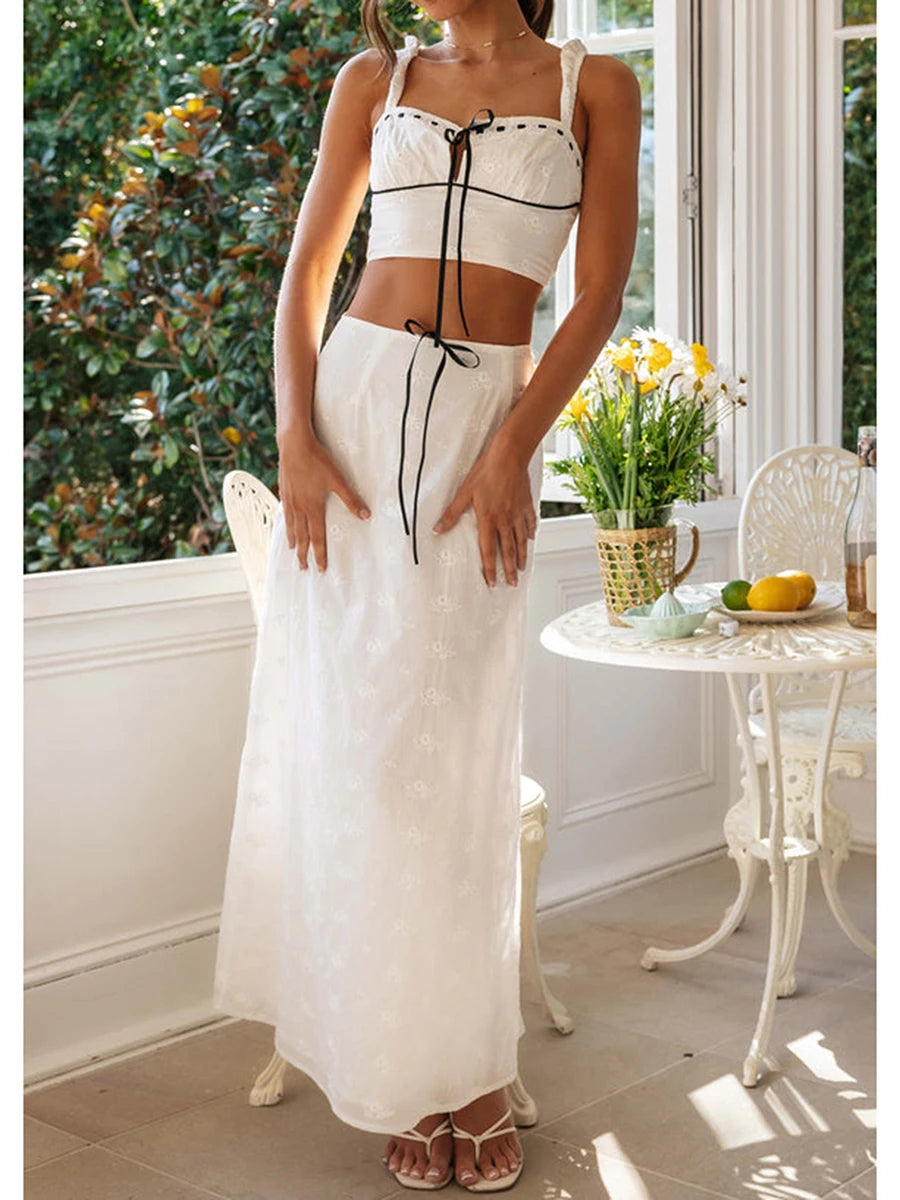 Women’s Summer Set Embroidered Flower Sleeveless Cami Tops High Waist Black Bows Zipper Long Skirt 2 Pieces Set