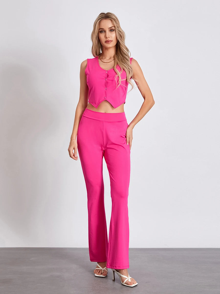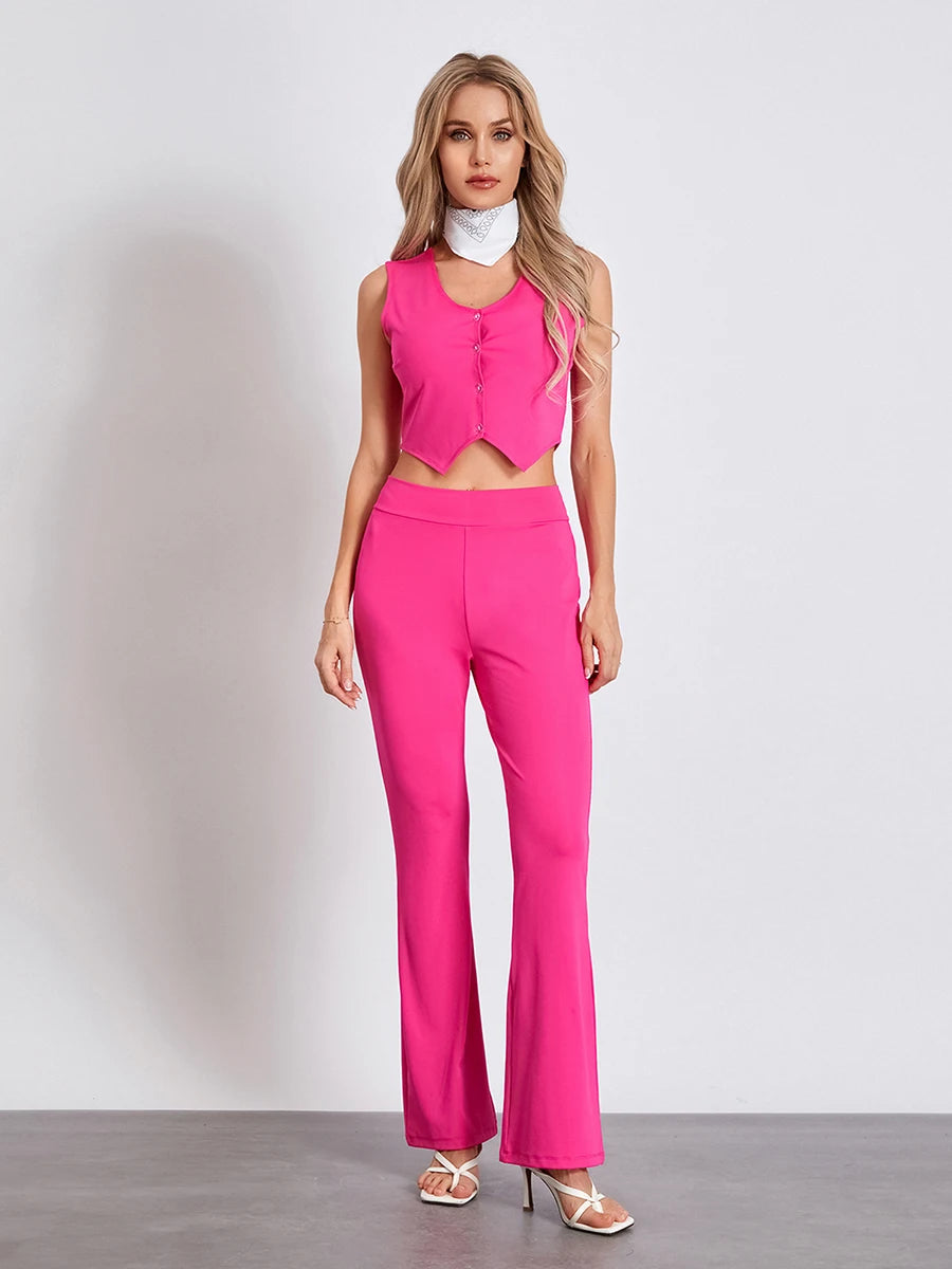 Women's Retro Hippie Costume Set, Solid Color V-Neck Button Vest + High Waist Pants 70s Clothing