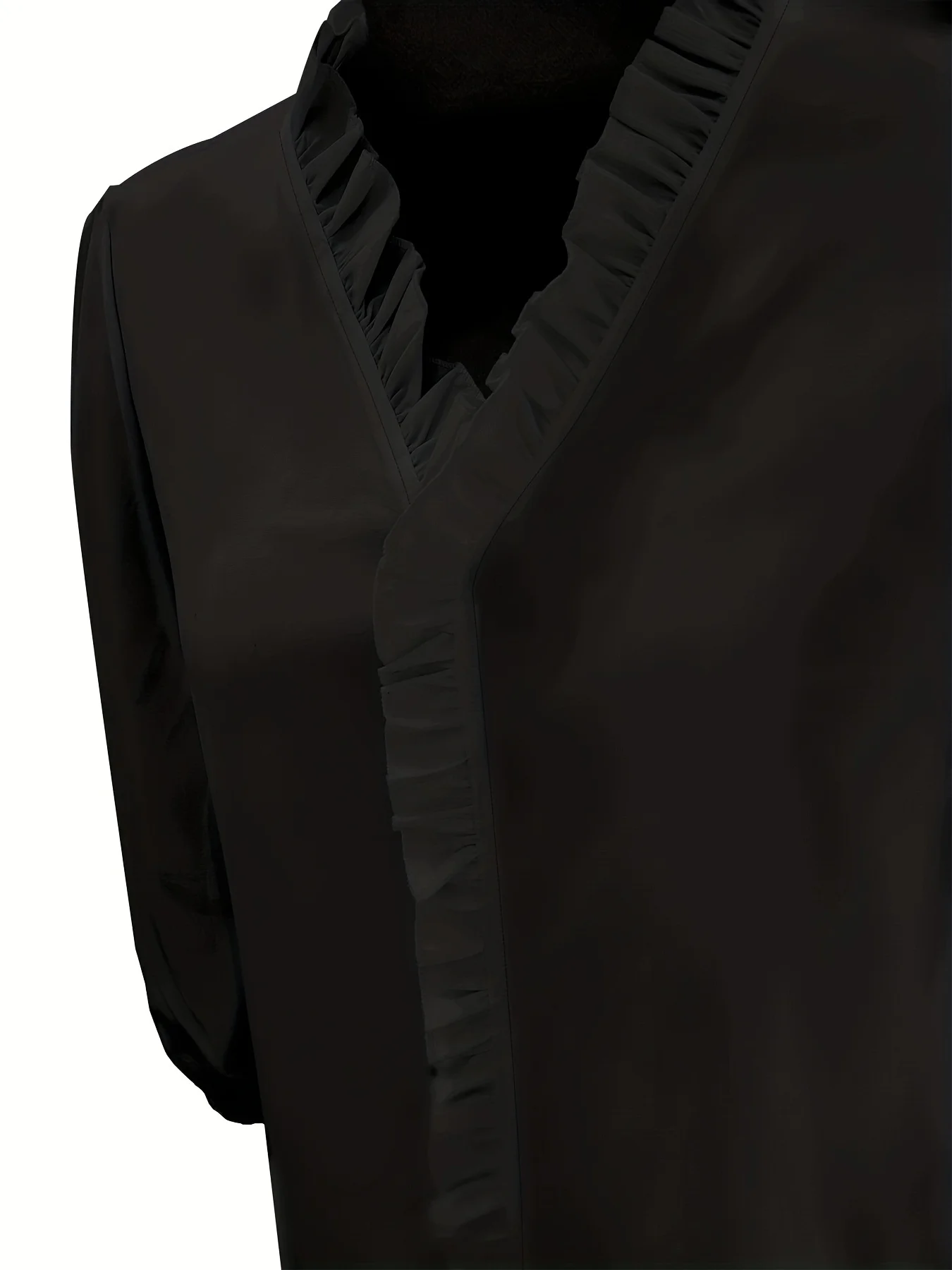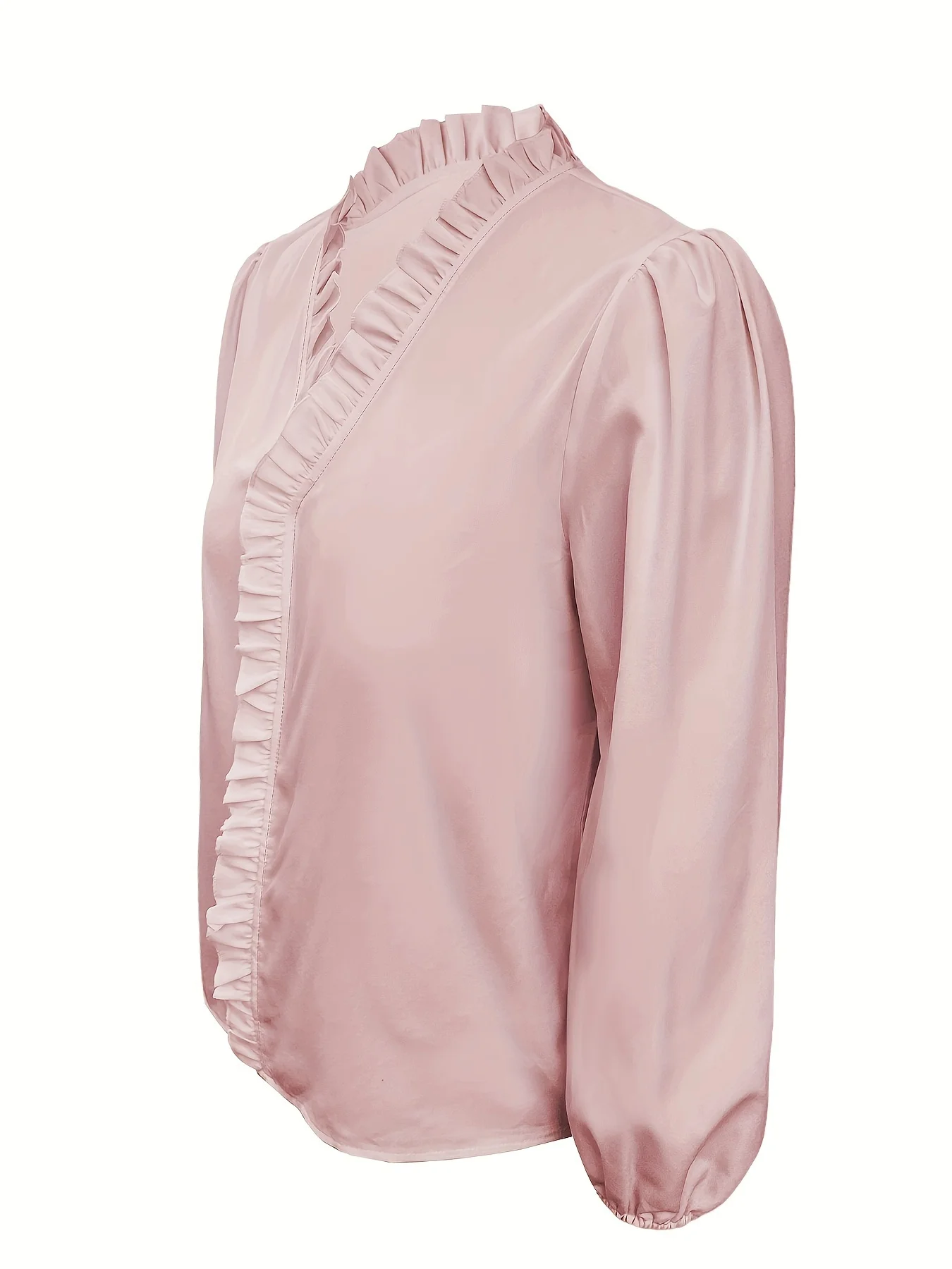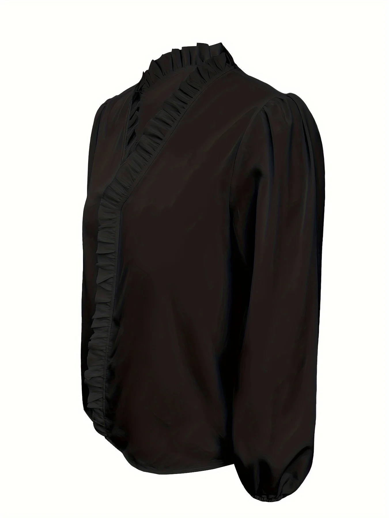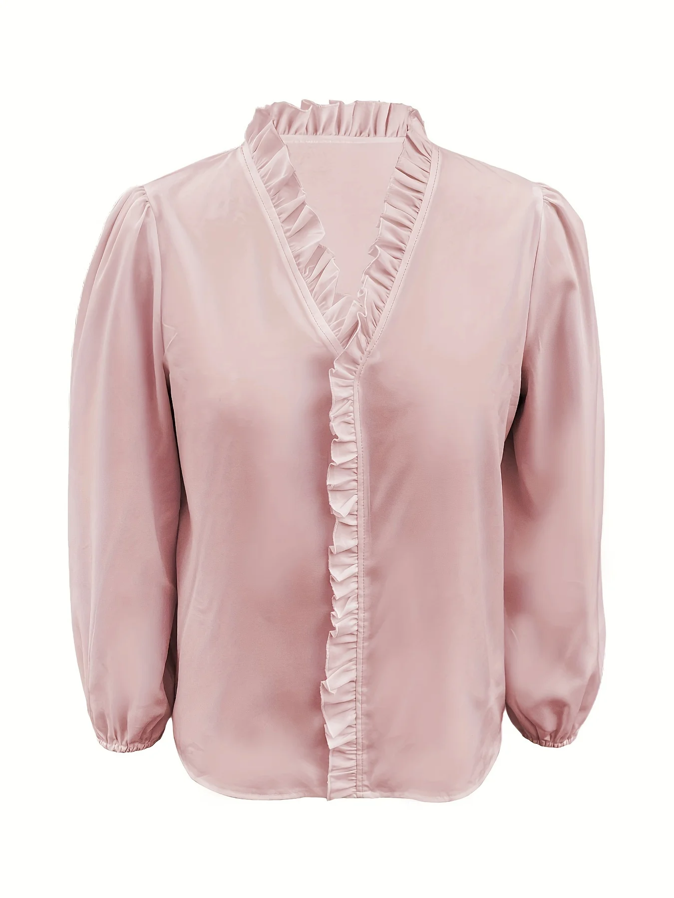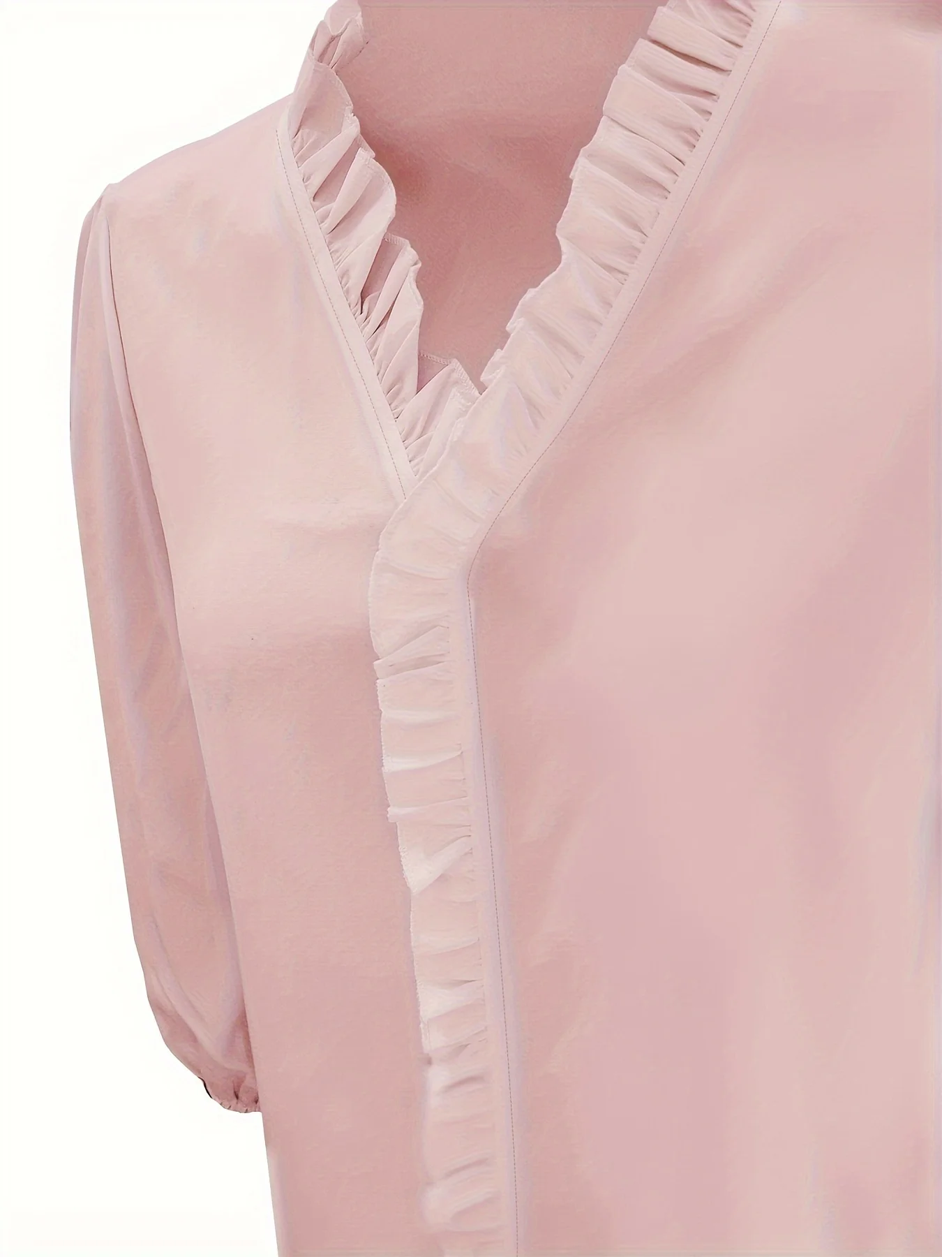 Women's Elegant V Neck Ruffle Long Sleeve Shirt, Elastic Cuffs, Casual Comfortable Top for Spring & Fall, Daily Wear