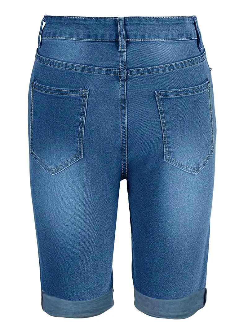 Women's Fashion Ripped Denim Capri Shorts, Pocket Button, Skinny Stretchy Denim Shorts, Women's Jeans