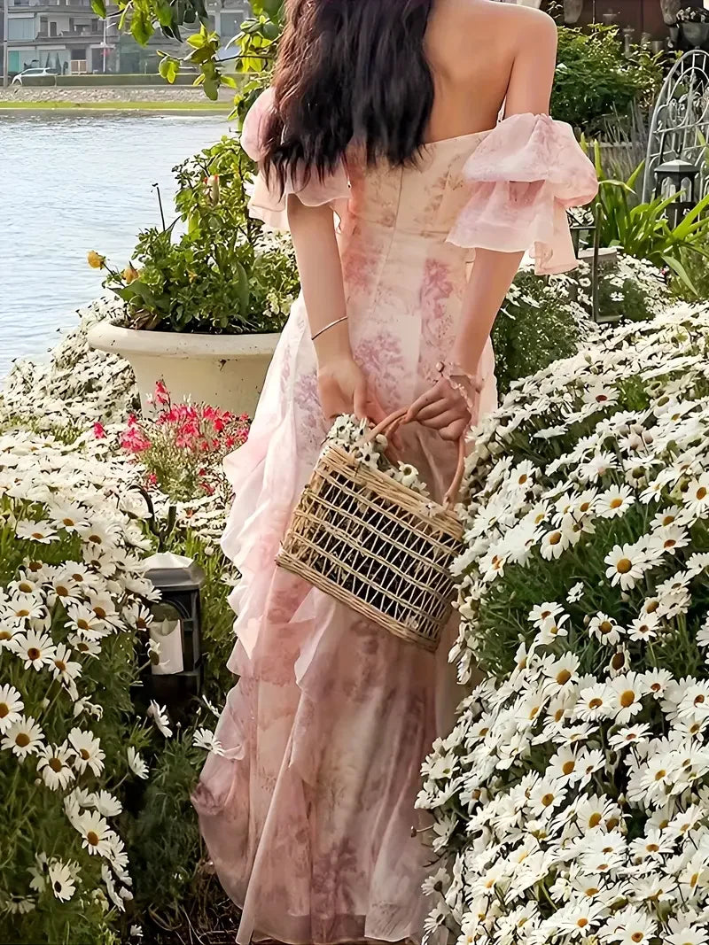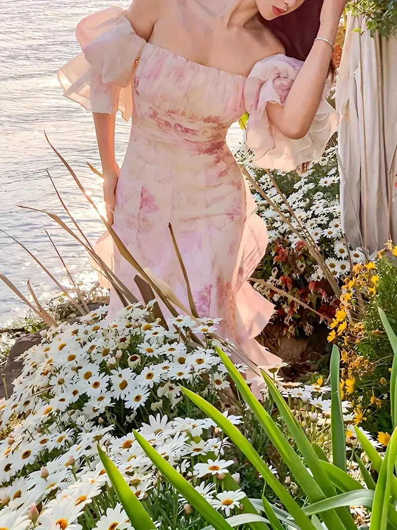 Women's Slant Neck Short Sleeve Floral Ruffle Slim Party Midi Dress - Bodycon Wedding Bridesmaid Floral Skirt Dress for Women
