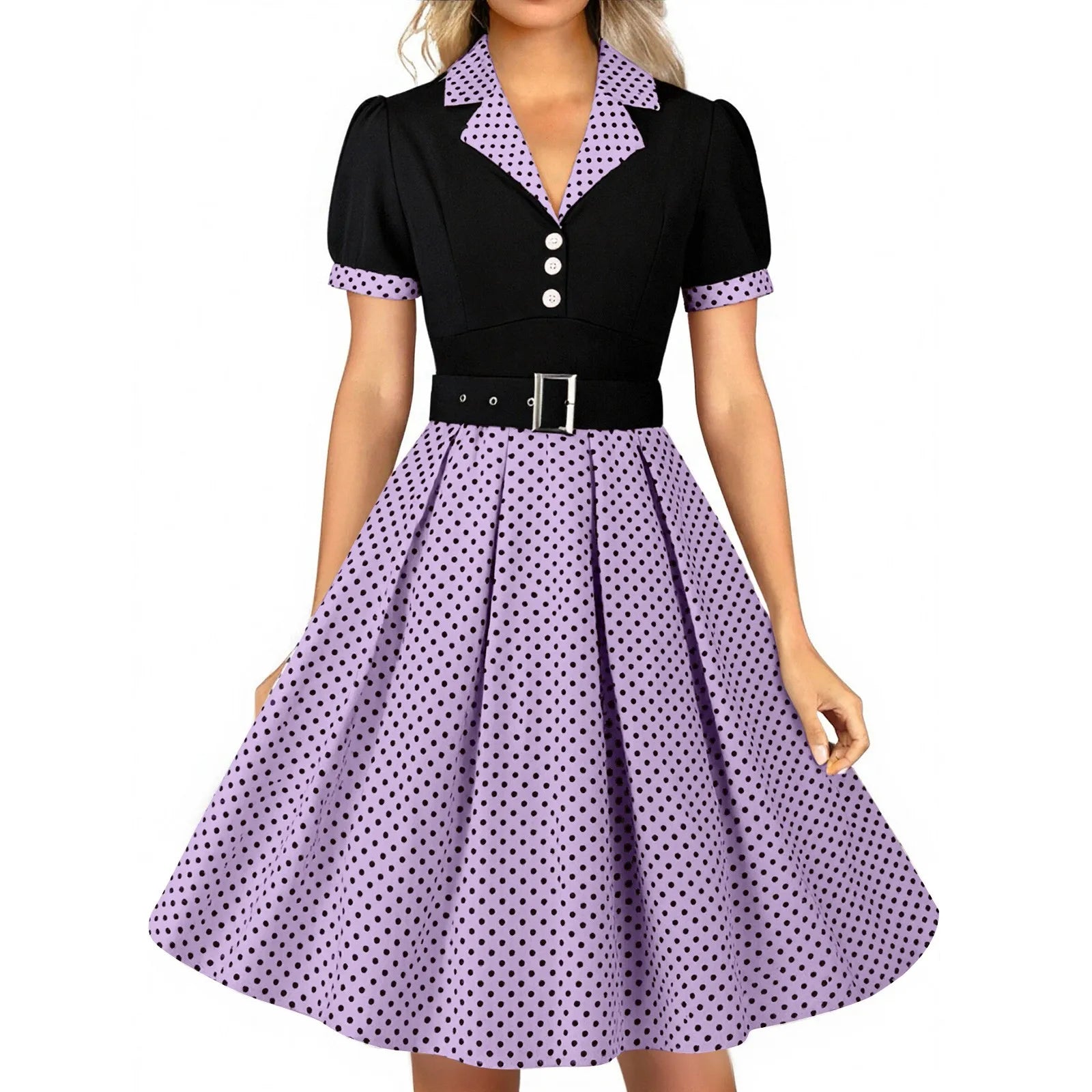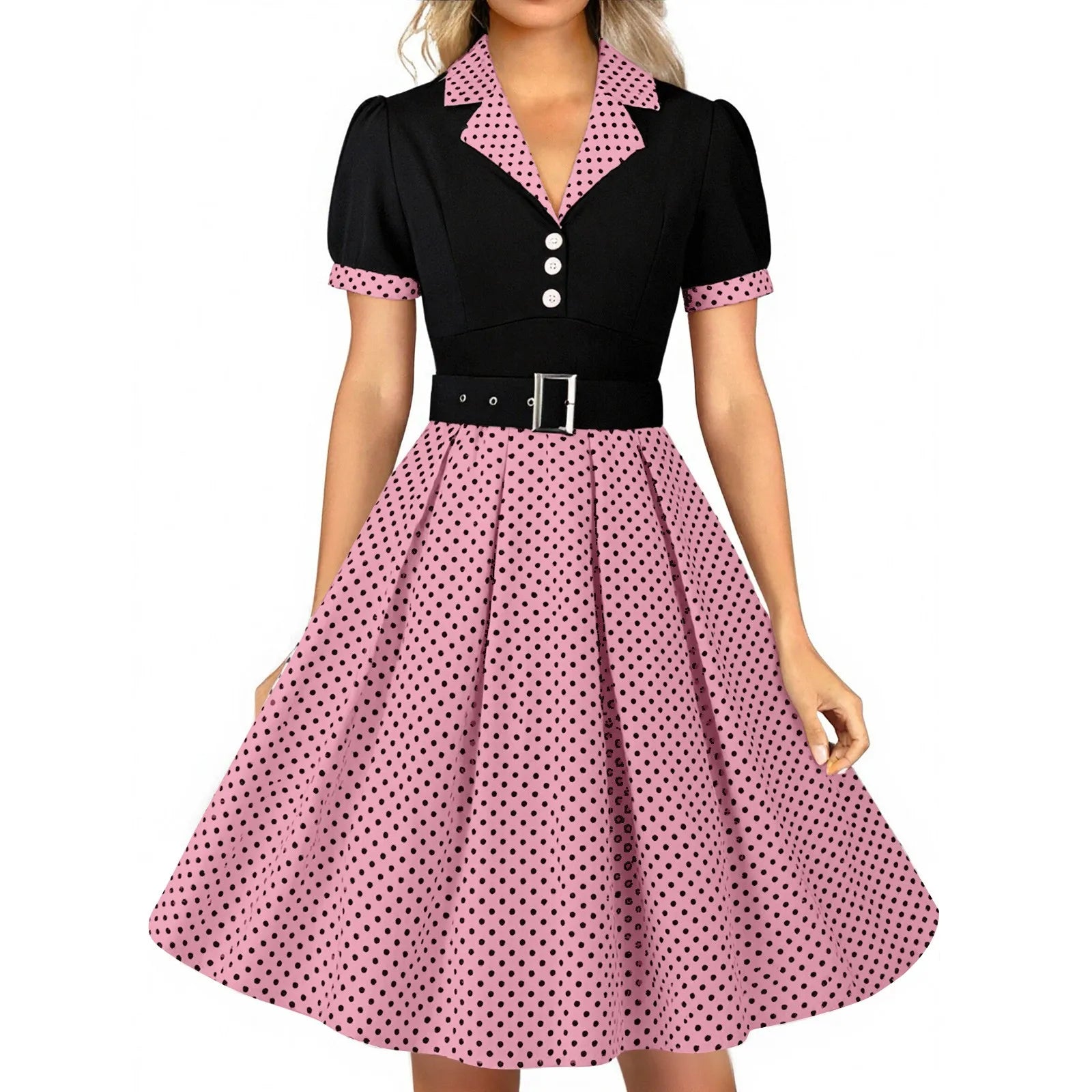 Women's Vintage Polka Dot Lapel Short-sleeved Belt Dress